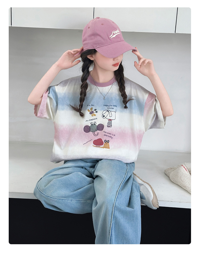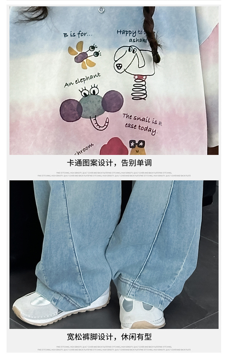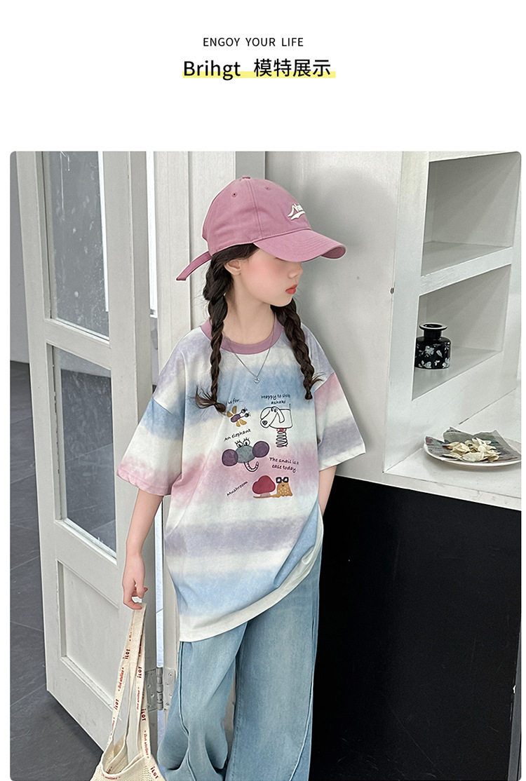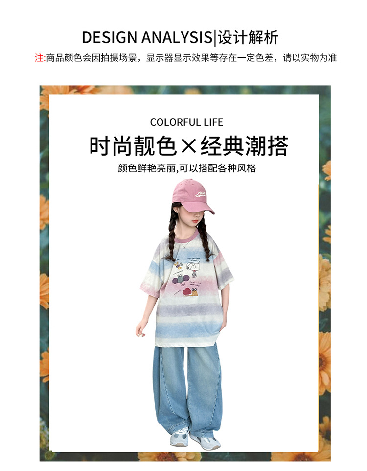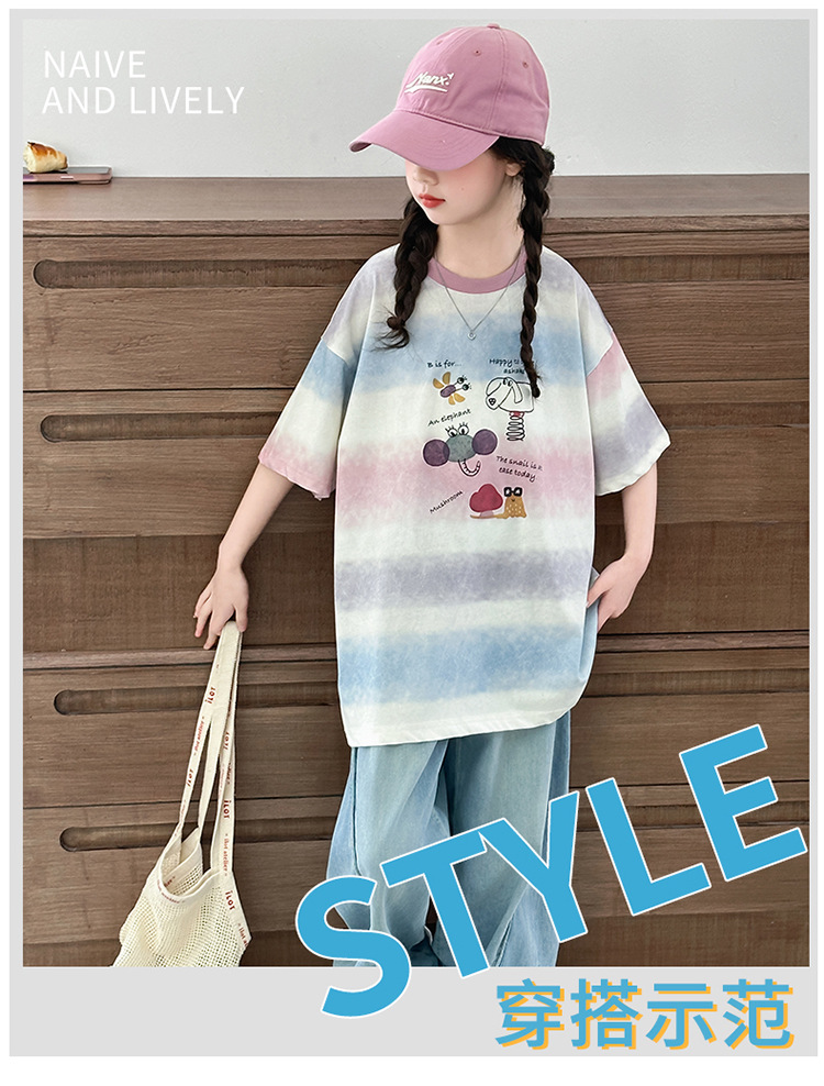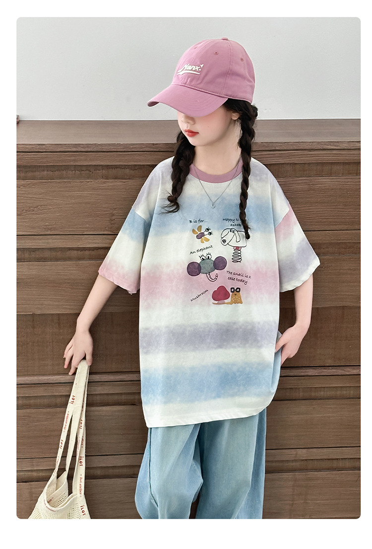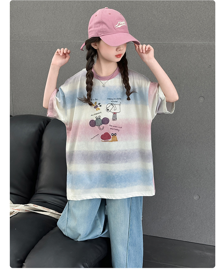 여자 여름 캐주얼 세트 2025 새로운 어린이 서양식 줄무늬 반팔 탑 데님 와이드 레그 바지 투피스 세트스토어 가기