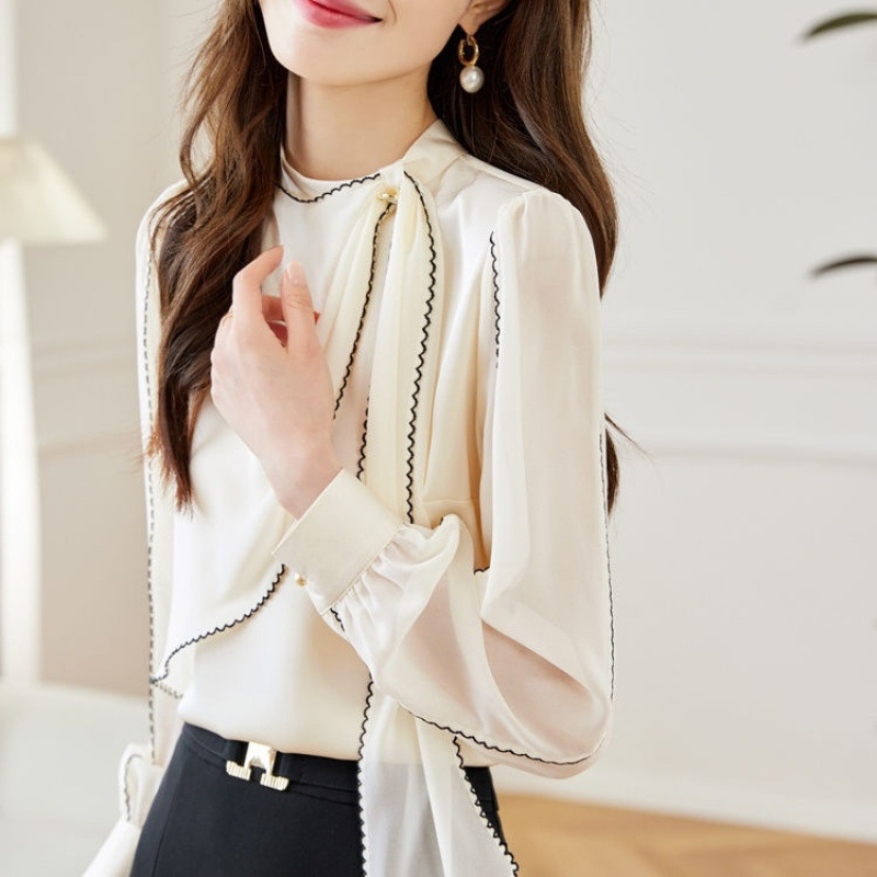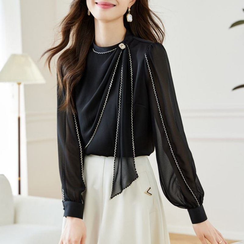 2025 봄 가을 초봄 신상 긴팔 블랙 얇은 쉬폰 서양식 리본 기질 탑 셔츠 쉬폰 셔츠