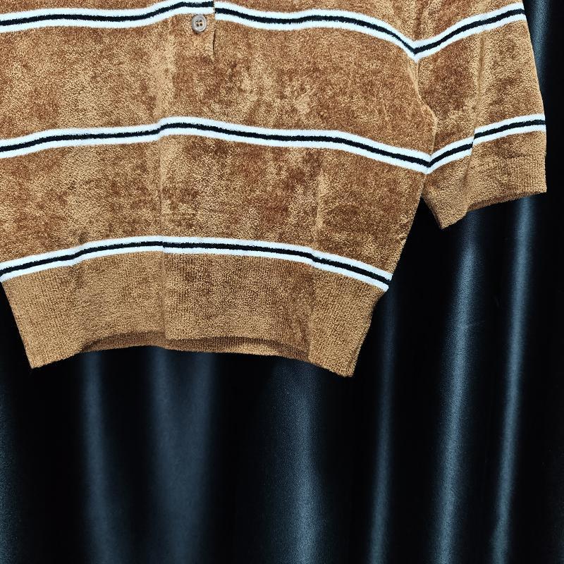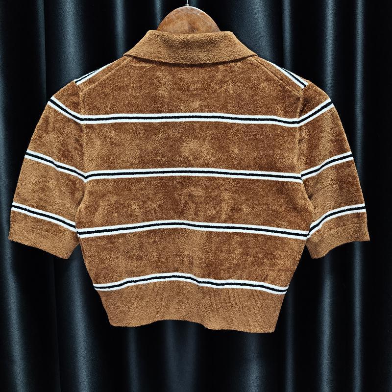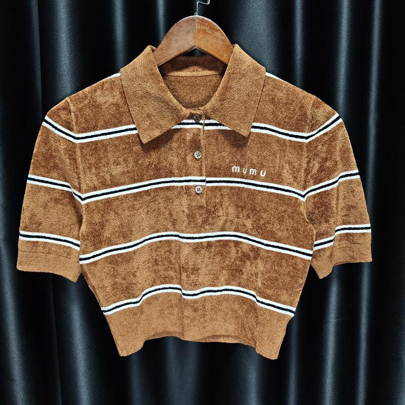 Nanyou 패셔너블한 대학 스타일 자수 문자 스트라이프 장식 폴로 칼라 여성용 짧은 니트 탑을 직접 공급하는 높은 버전스토어 가기