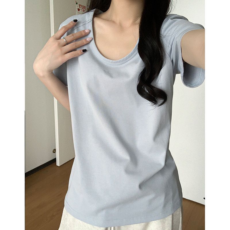 어깨 U-넥 코튼 반팔 티셔츠 여성용 여름 도파민 슬리밍 고기를 덮고있는 틈새 시크 루즈 큰 목 탑스토어 가기