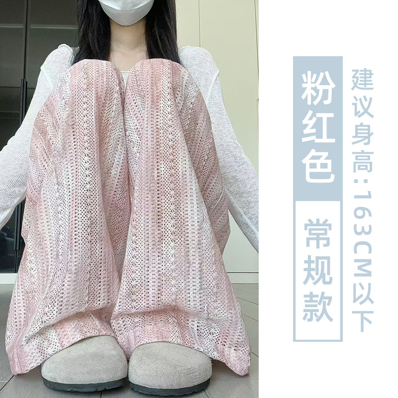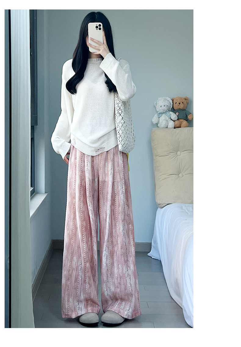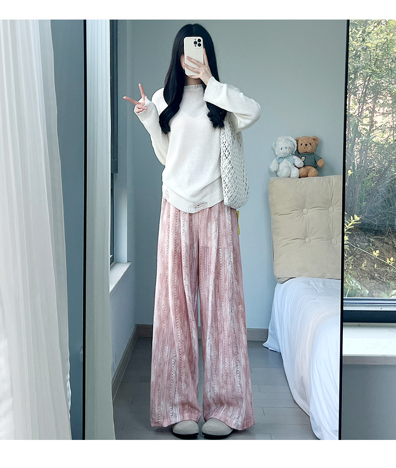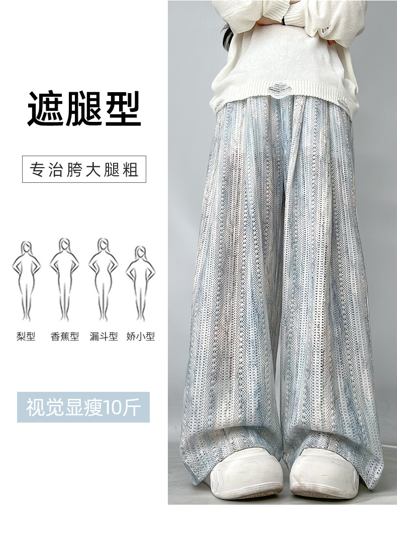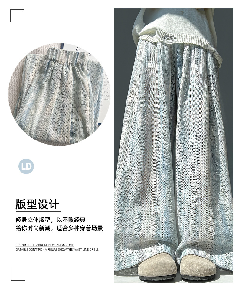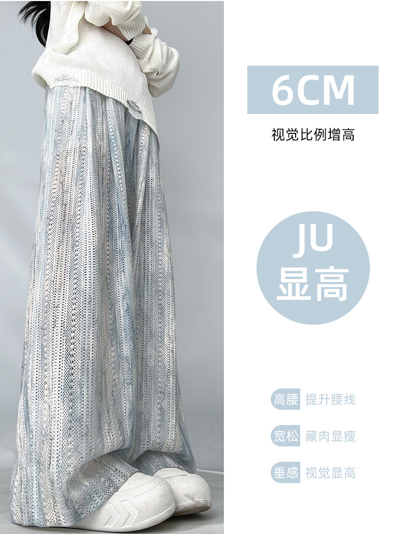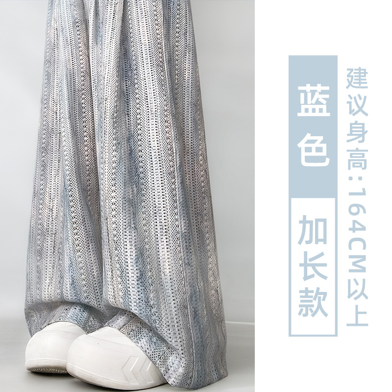 블루 아이스 실크 넓은 다리 바지 여성 여름 새로운 높은 허리 느슨한 복용량 캐주얼 쿨 바지 넥타이 염색 중공 랩 바지
