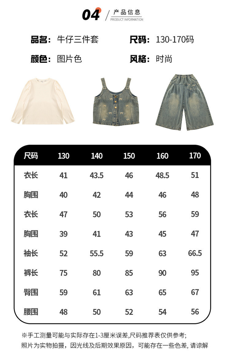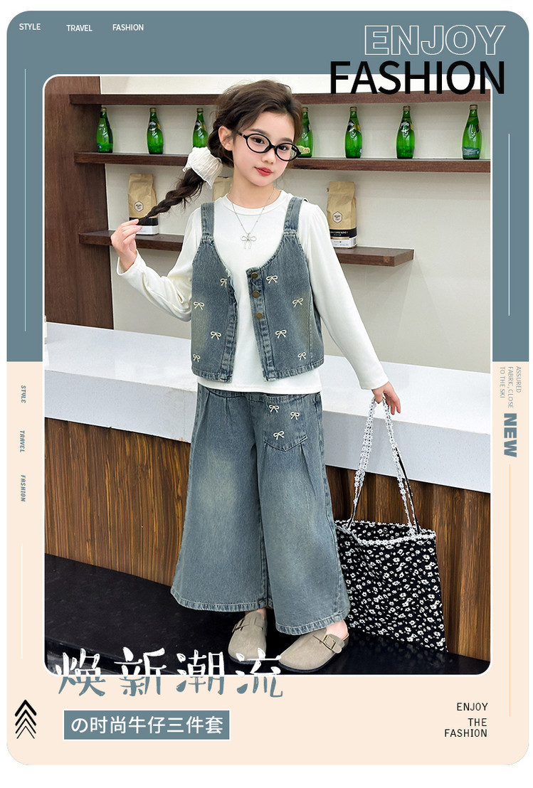 새로운 국경 봄과 가을 2025 트렌디 한 데님 조끼 소녀 세트 서양식 3 피스 세트 어린이 면화스토어 가기