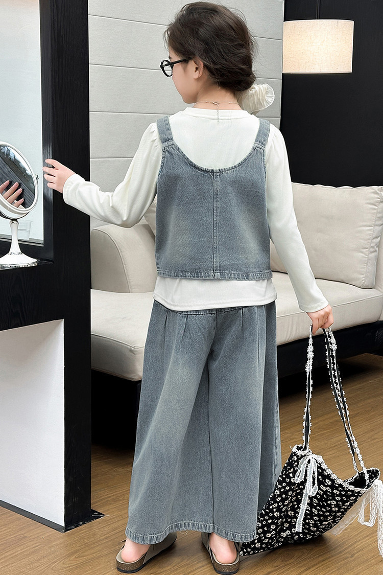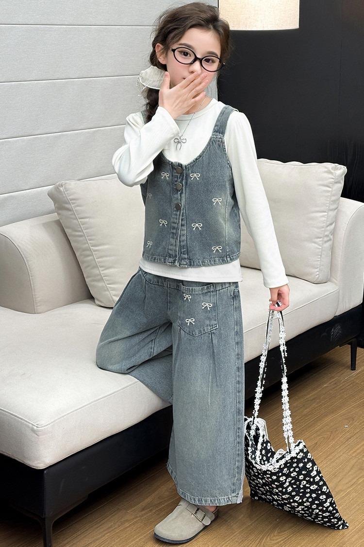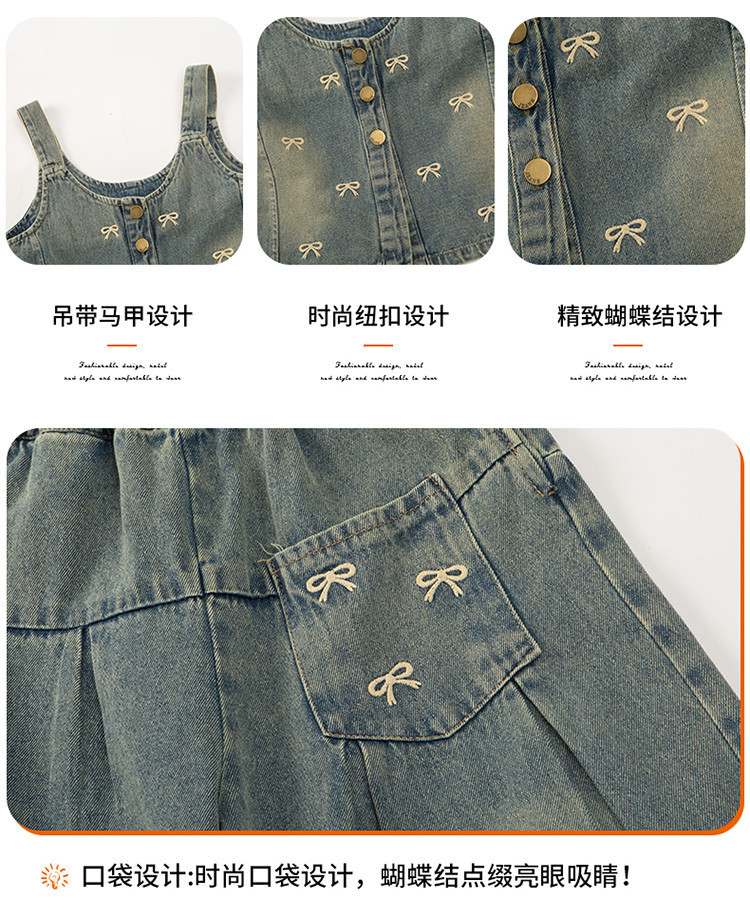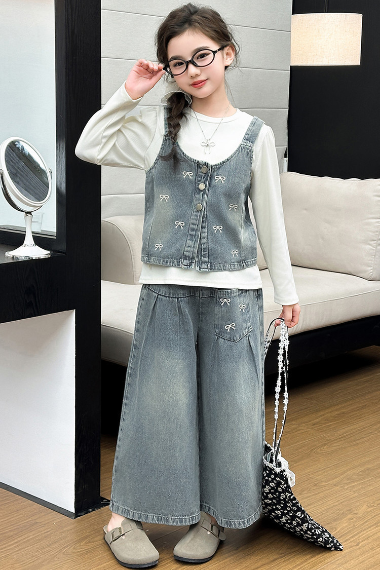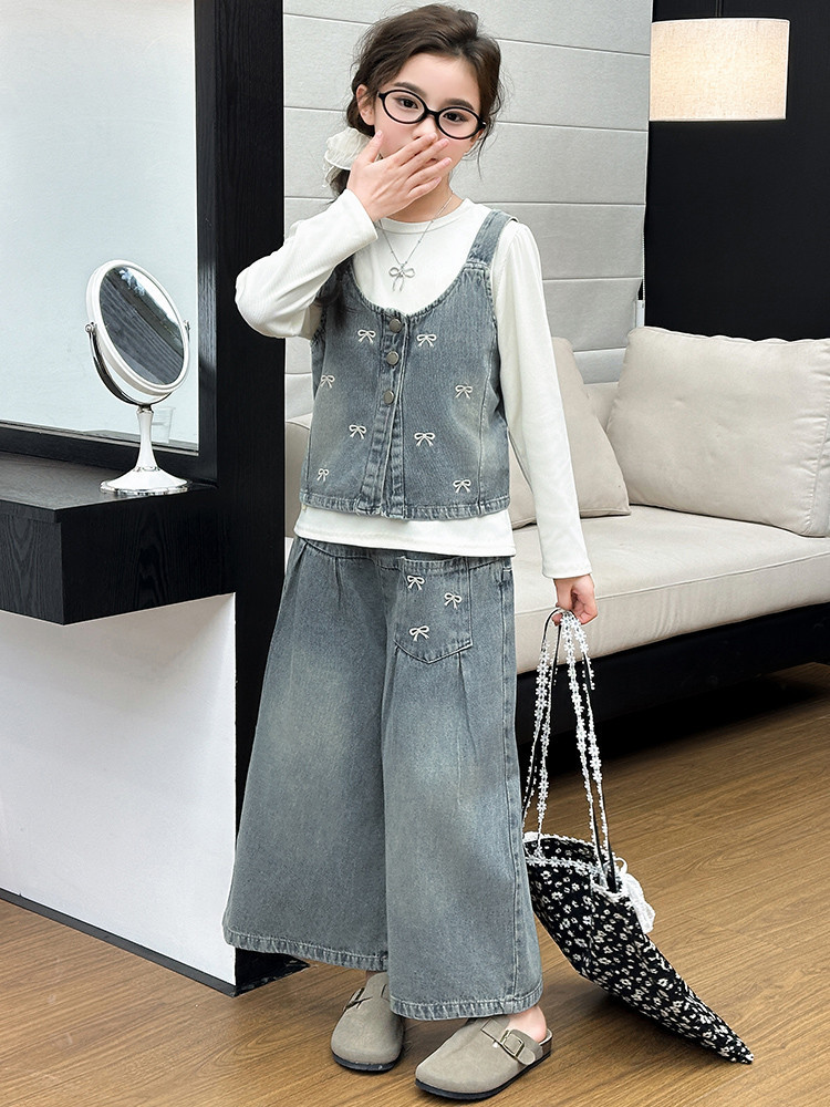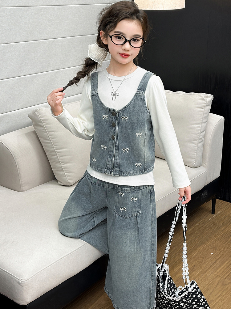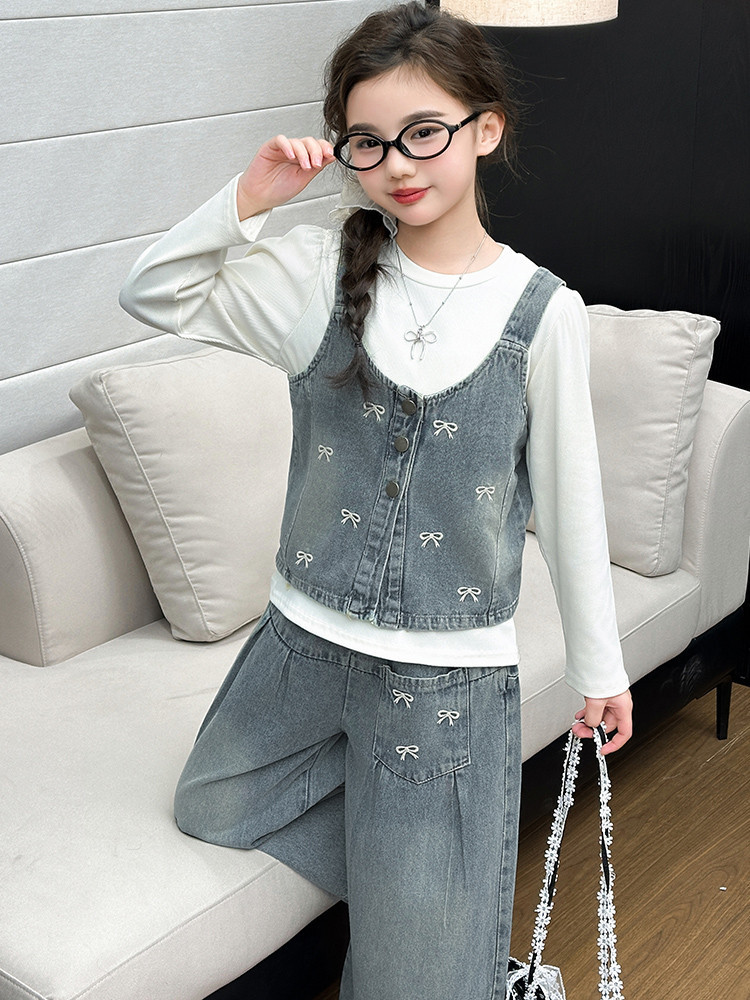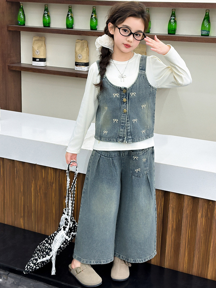 새로운 국경 봄과 가을 2025 트렌디 한 데님 조끼 소녀 세트 서양식 3 피스 세트 어린이 면화