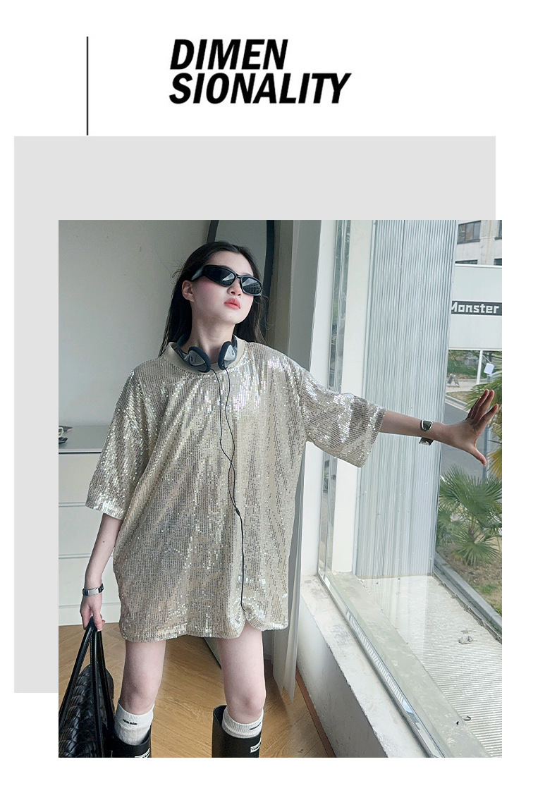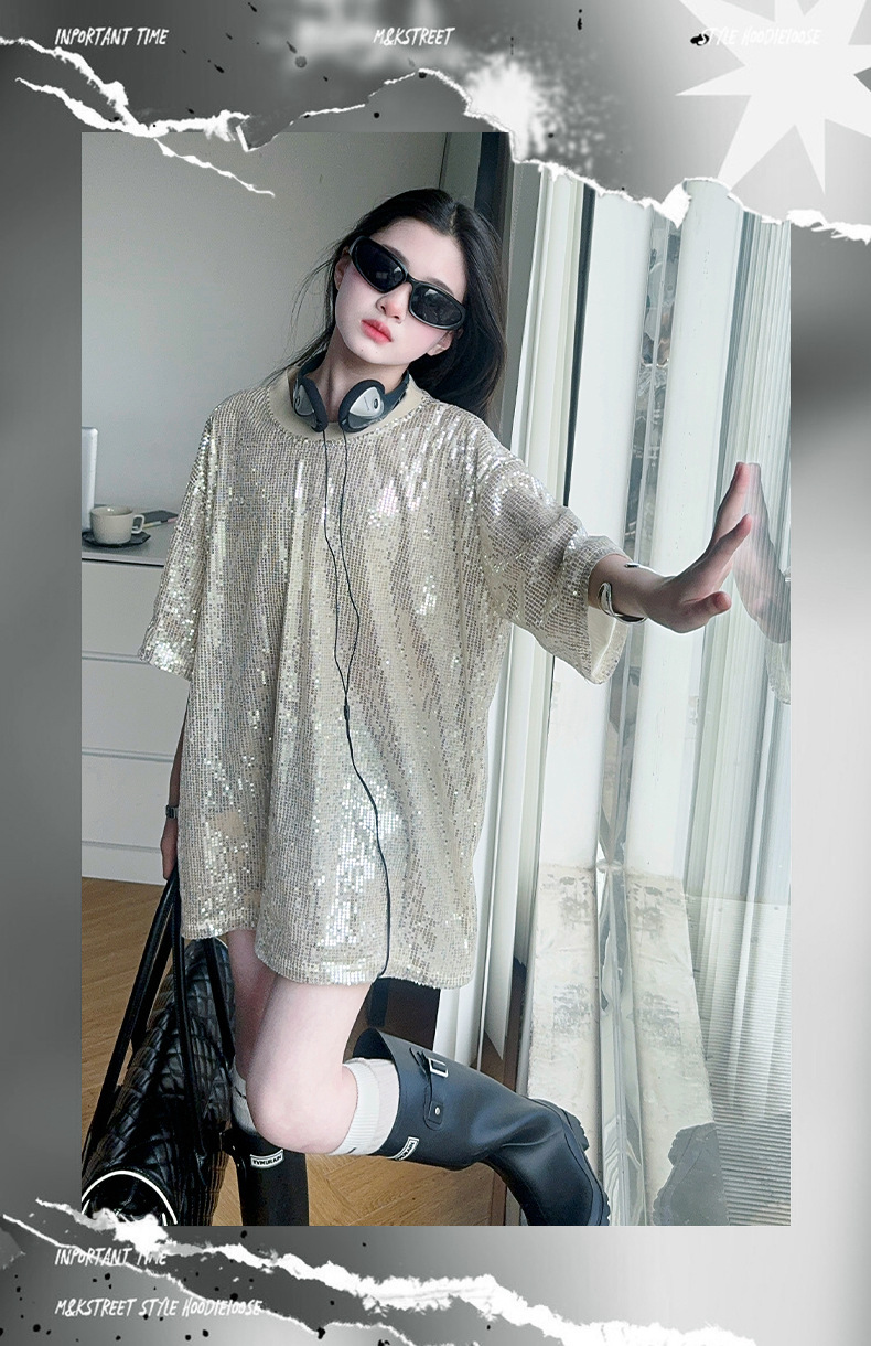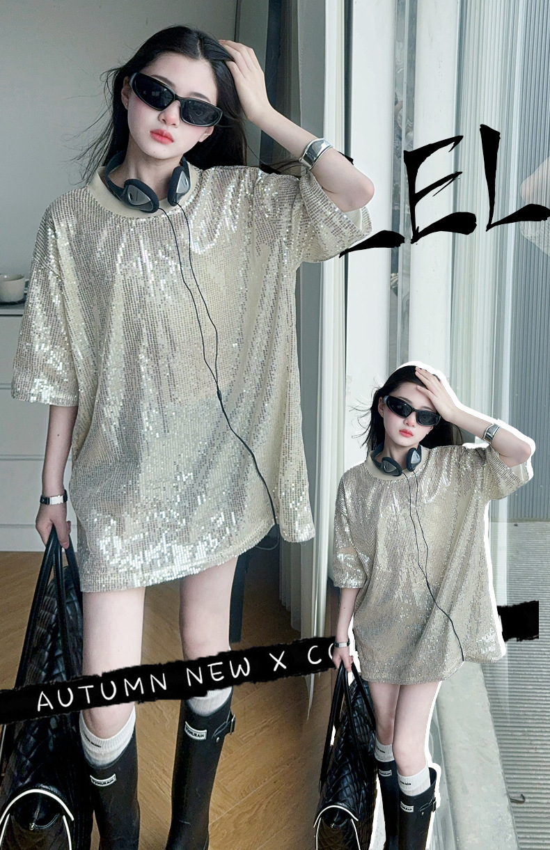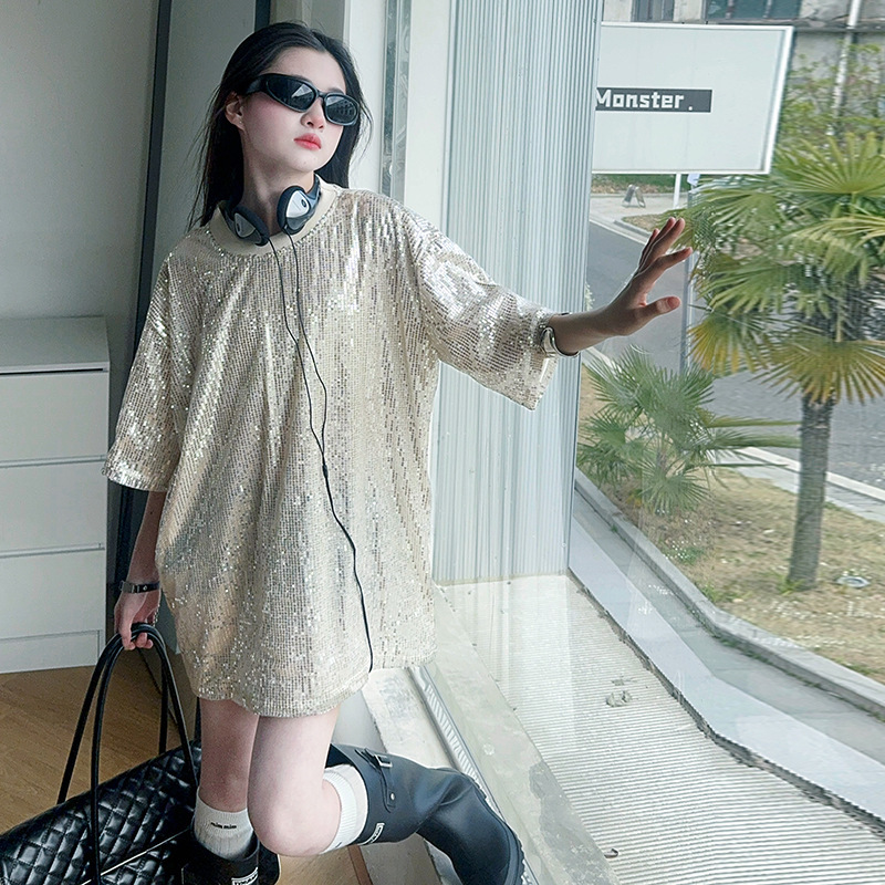 국경 간 느슨한 2025티셔츠 새 원피스 걸스 트렌디 티셔츠, 여름 밝은 빛나는 홍콩 스타일 인터넷 연예인 짧은 소매 중간 길이스토어 가기