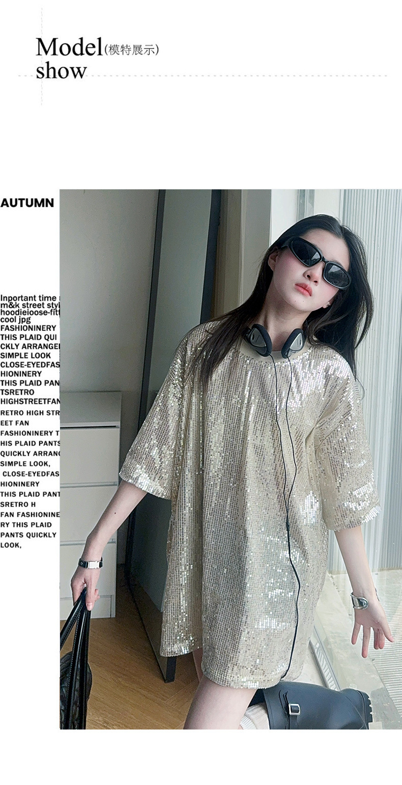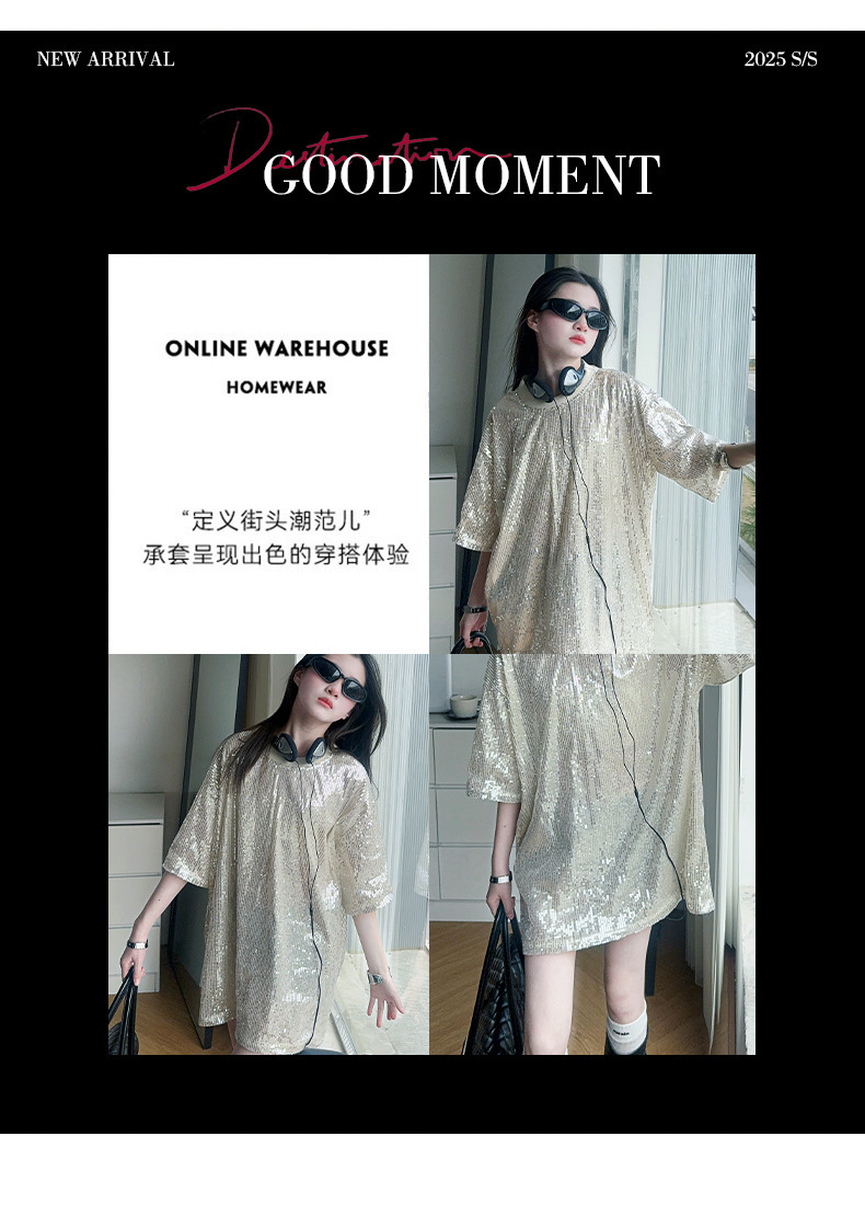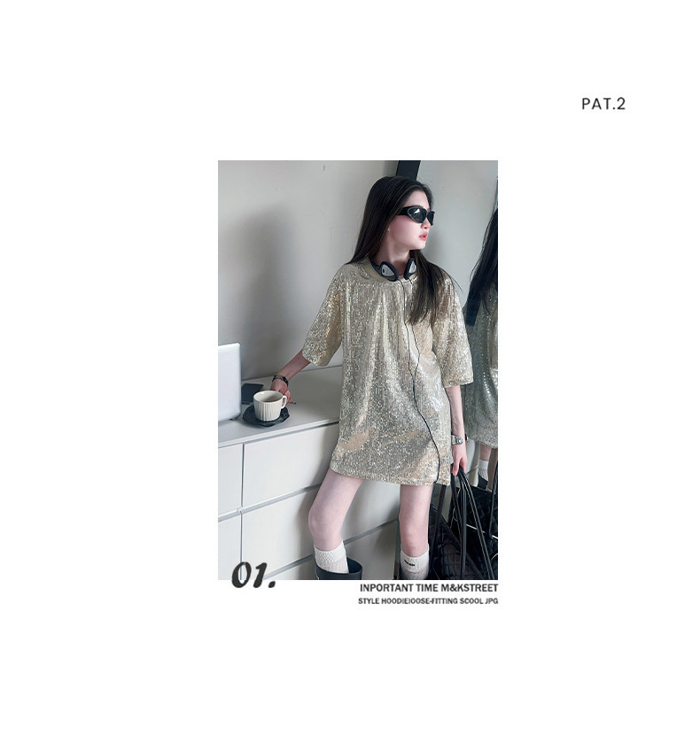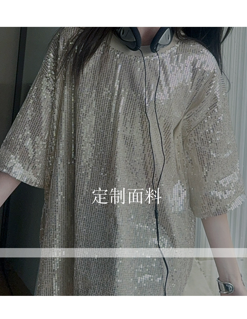 국경 간 느슨한 2025티셔츠 새 원피스 걸스 트렌디 티셔츠, 여름 밝은 빛나는 홍콩 스타일 인터넷 연예인 짧은 소매 중간 길이스토어 가기