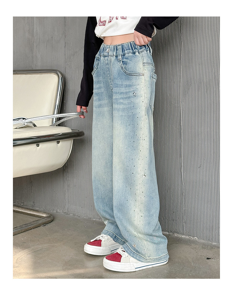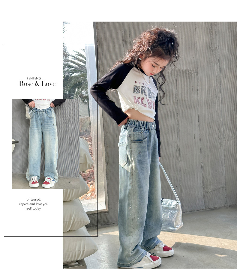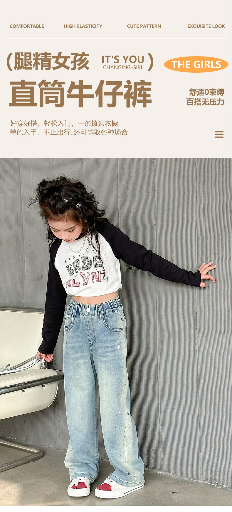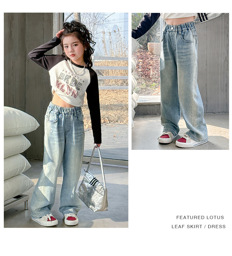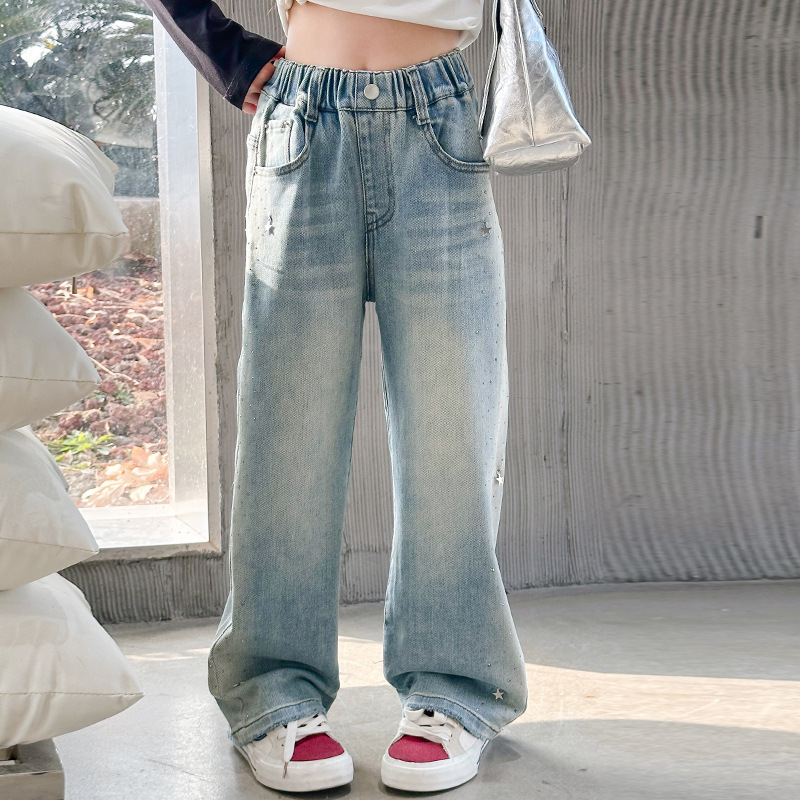 소녀의 데님 넓은 다리 바지 2024 캐주얼 세련된 사이드 솔기 패션 청바지 새로운 한국 스타일 봄과 가을 중빅 키즈스토어 가기