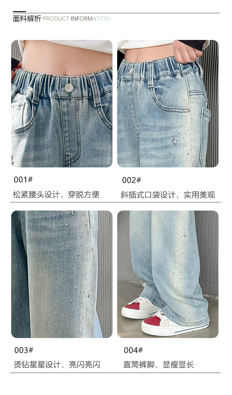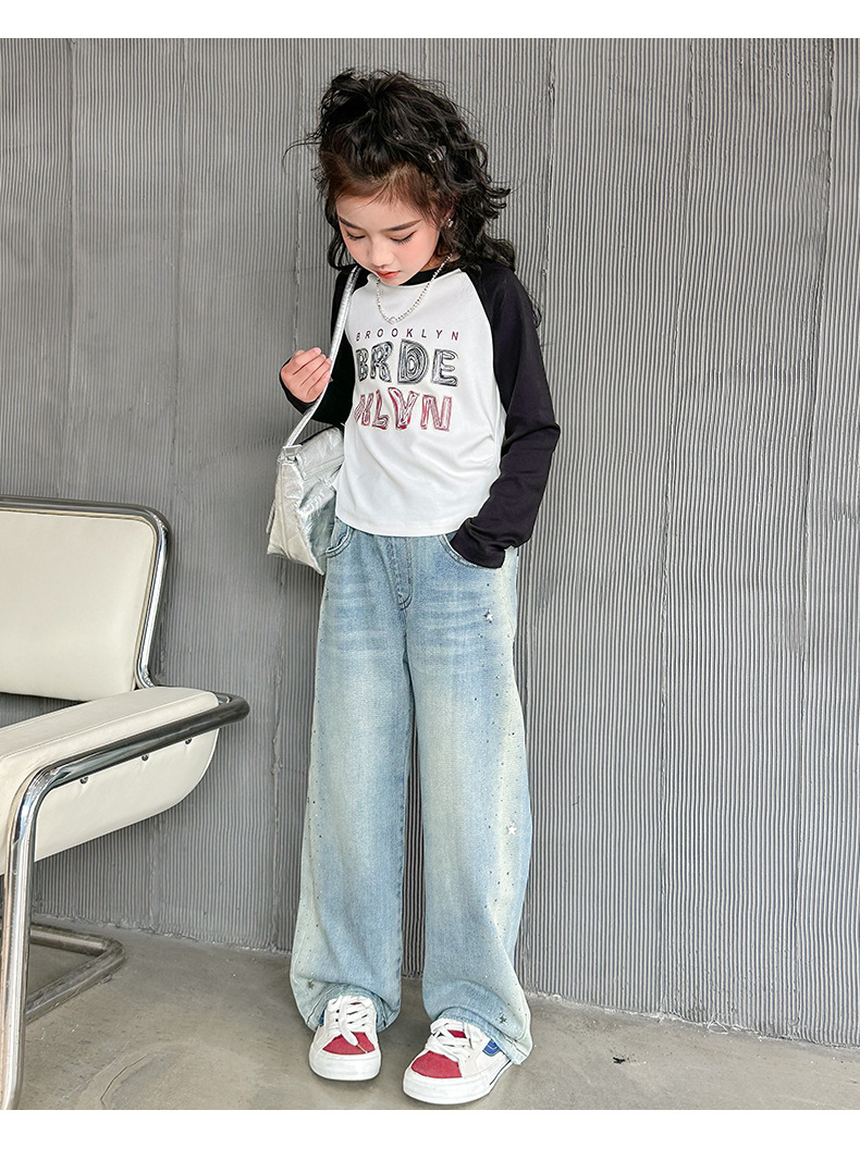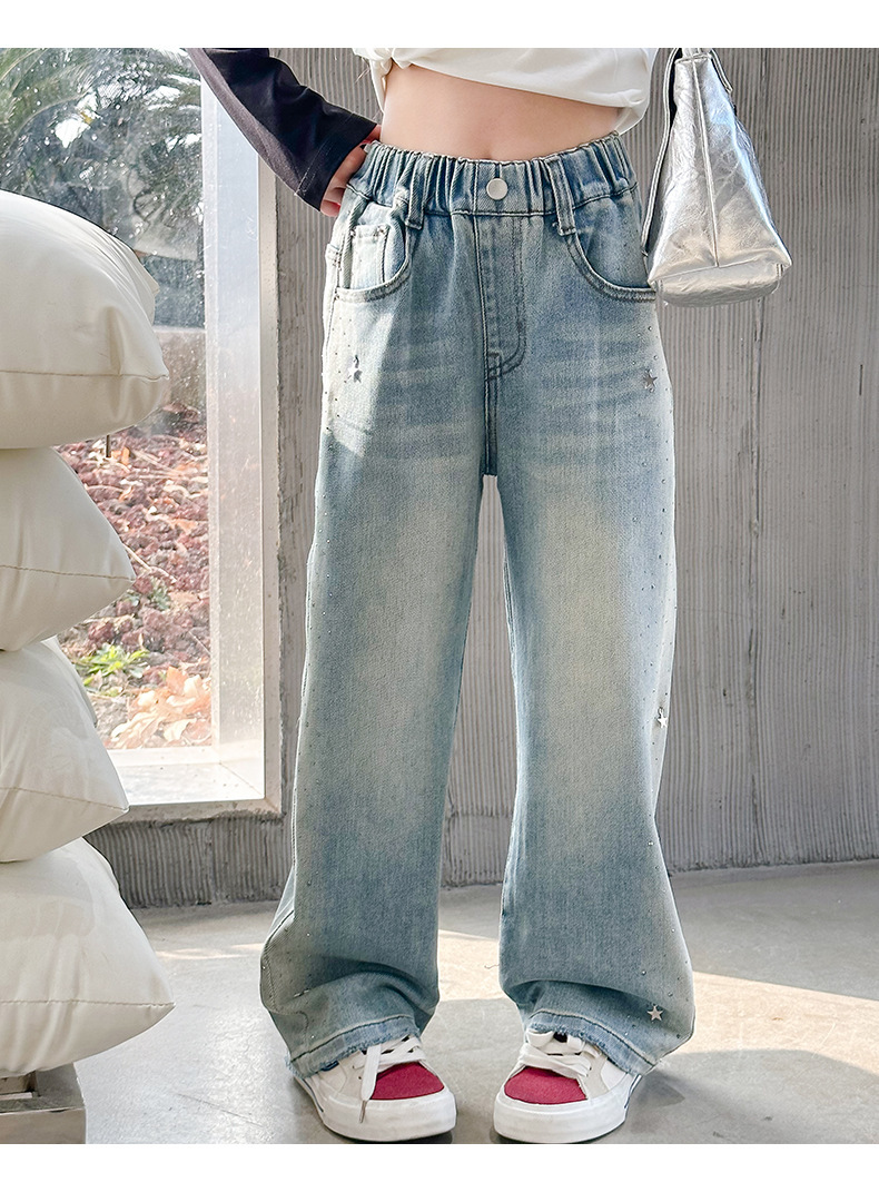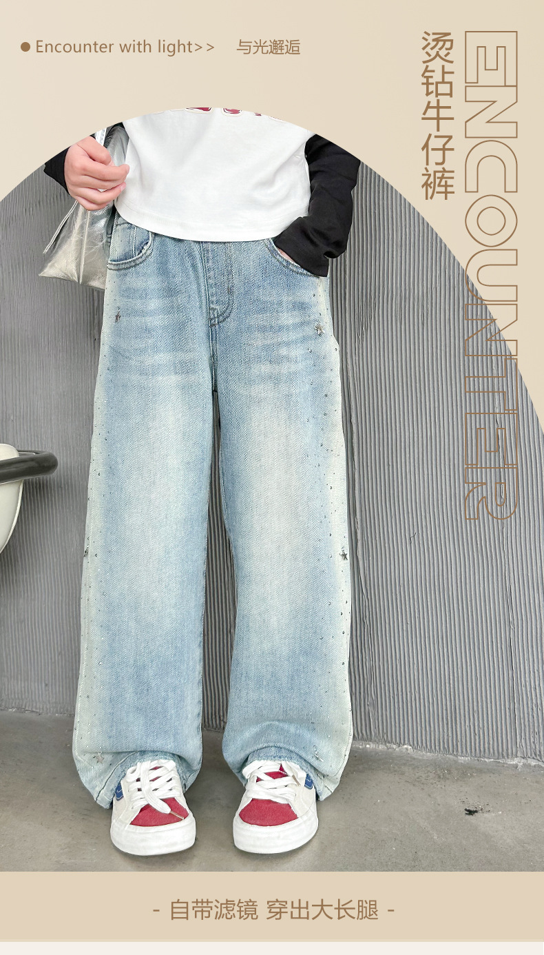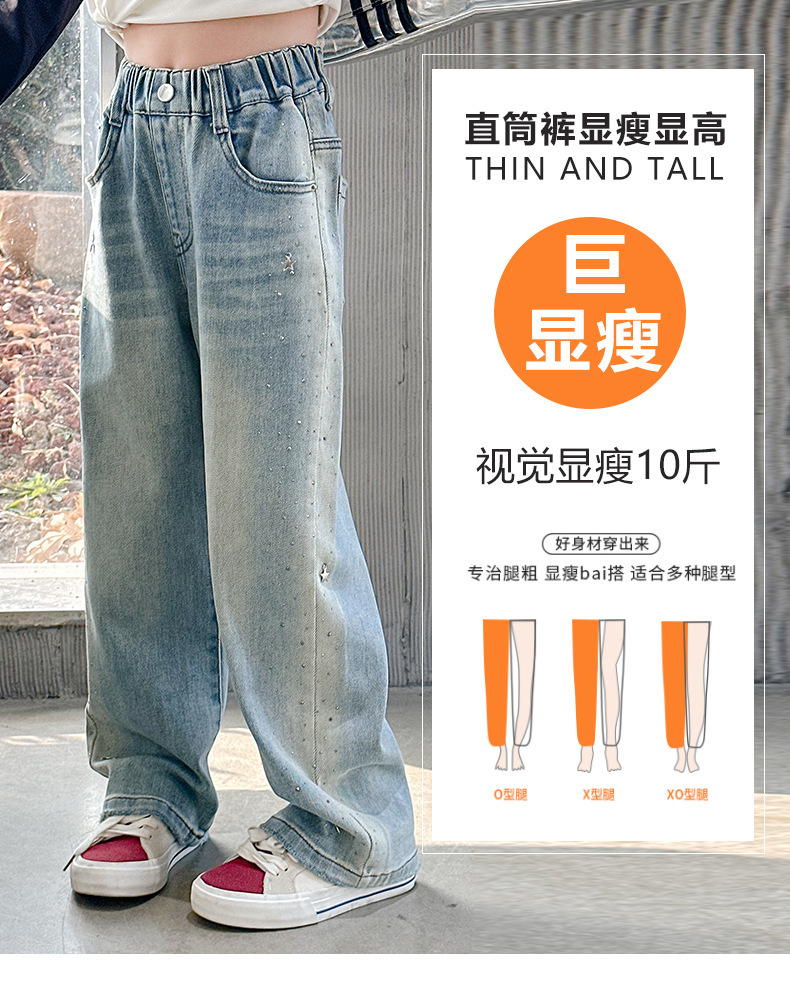 소녀의 데님 넓은 다리 바지 2024 캐주얼 세련된 사이드 솔기 패션 청바지 새로운 한국 스타일 봄과 가을 중빅 키즈스토어 가기