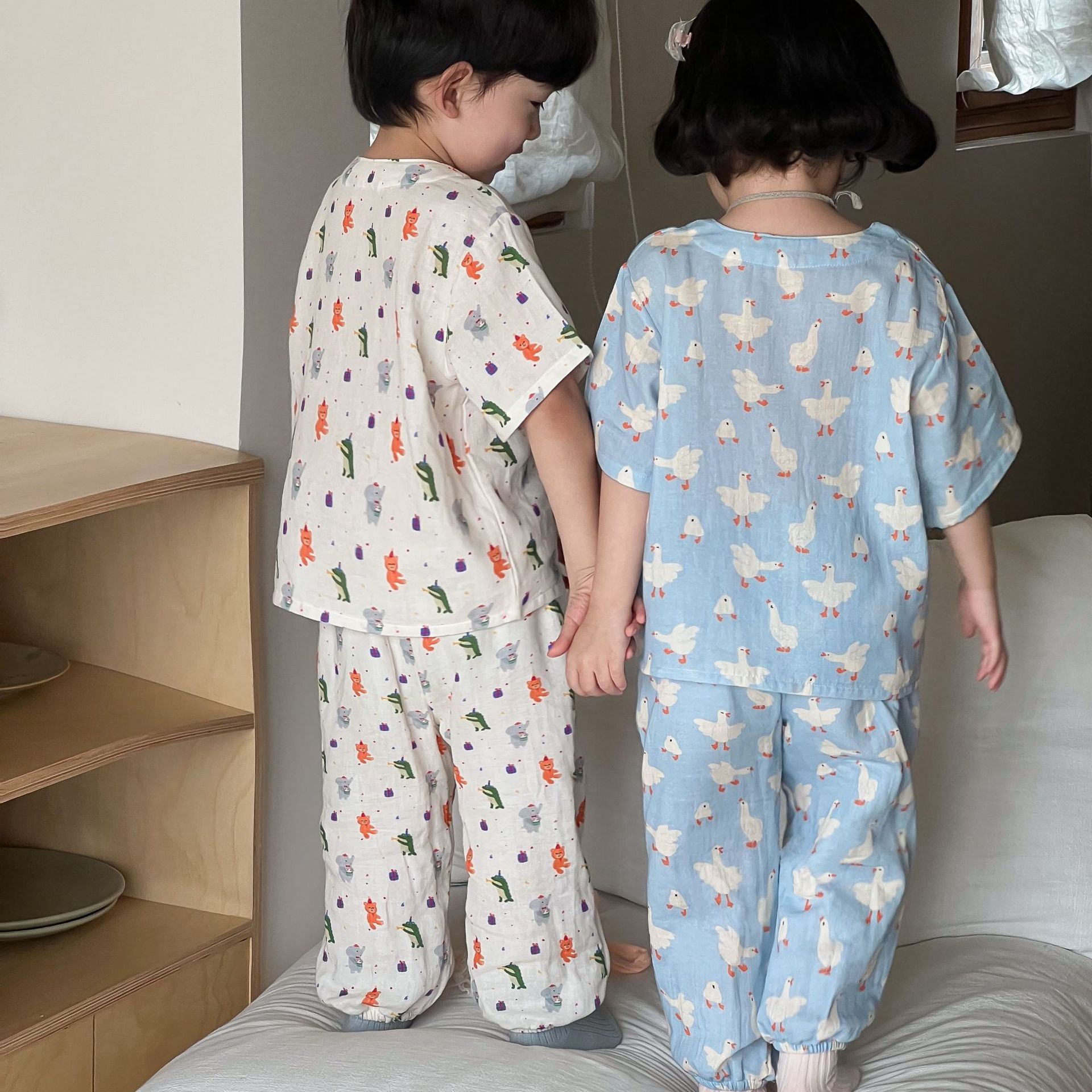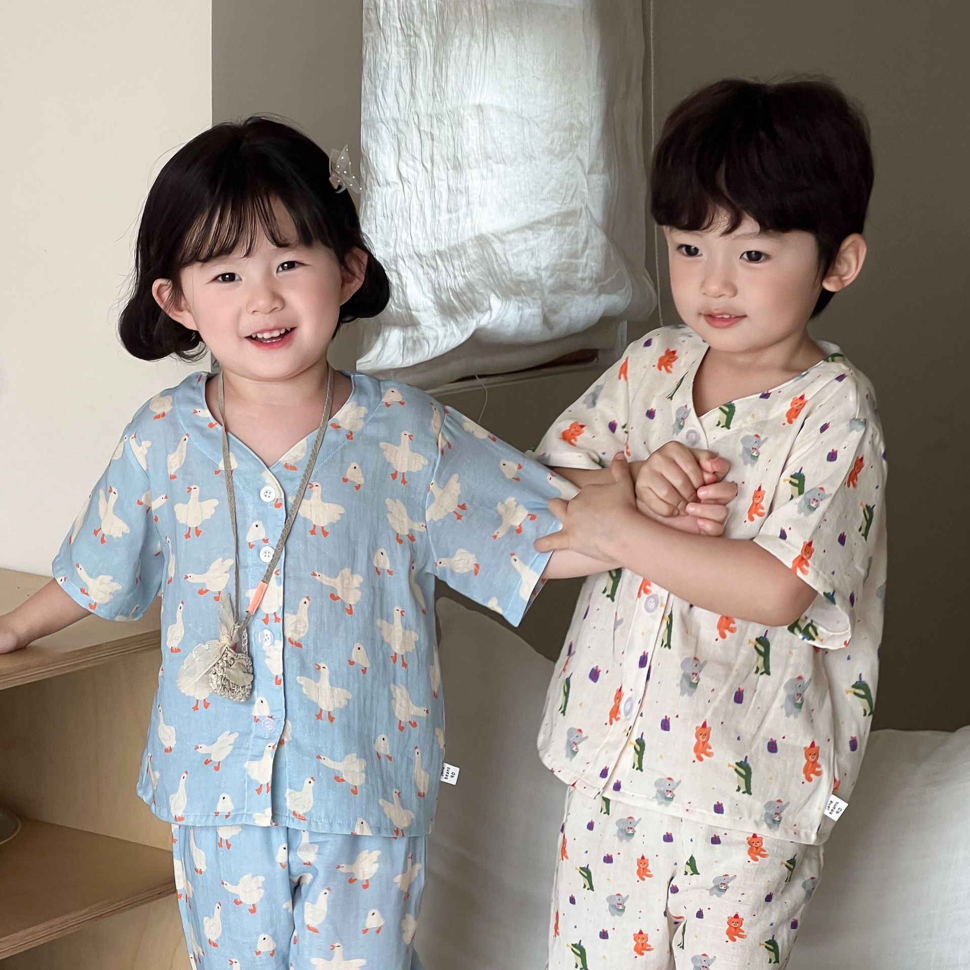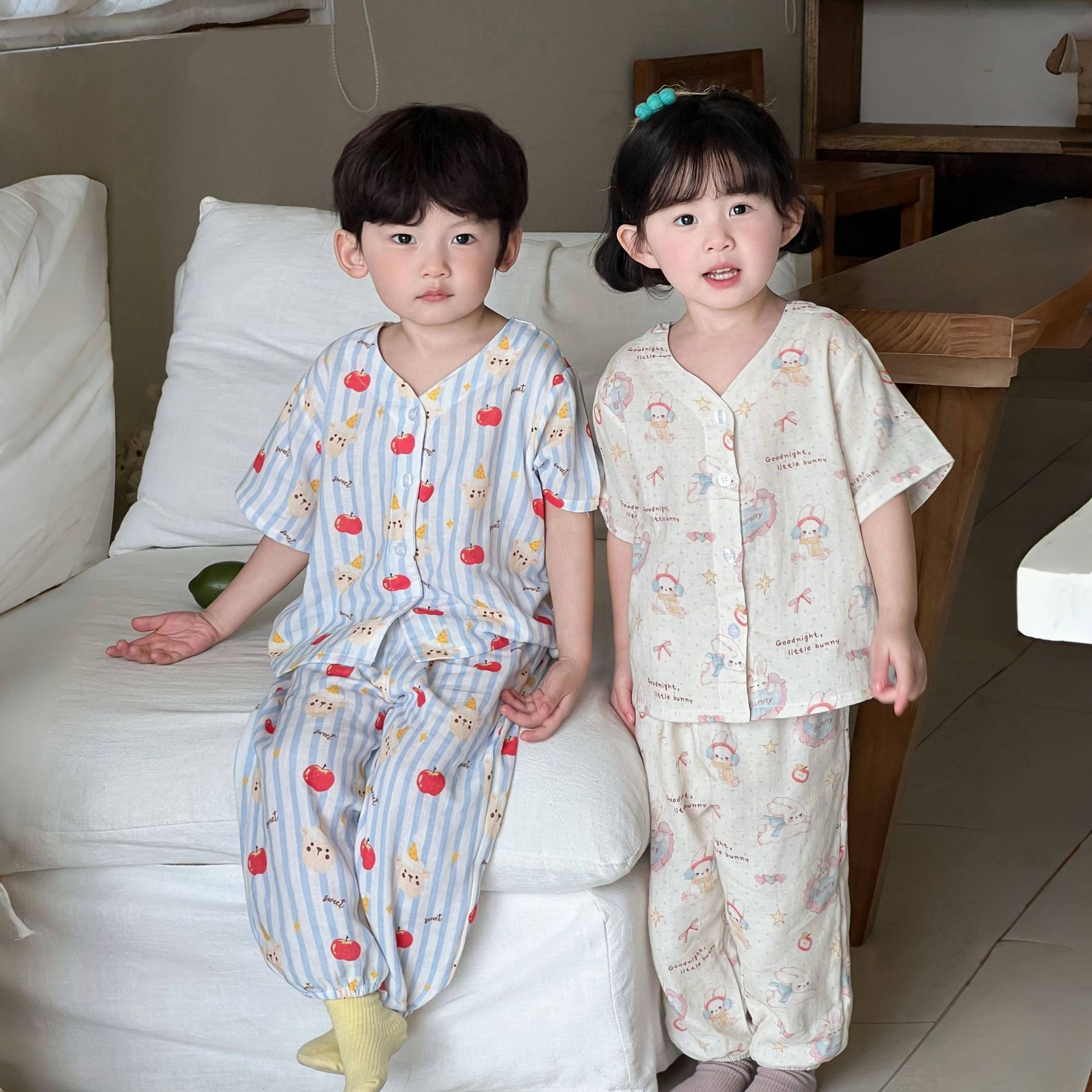 어린이 면화 파자마 세트 2025 여름 중소형 소년 소녀 면화 홈 옷 어린이 면 원사 반팔 모기 방지 바지스토어 가기