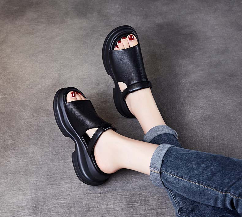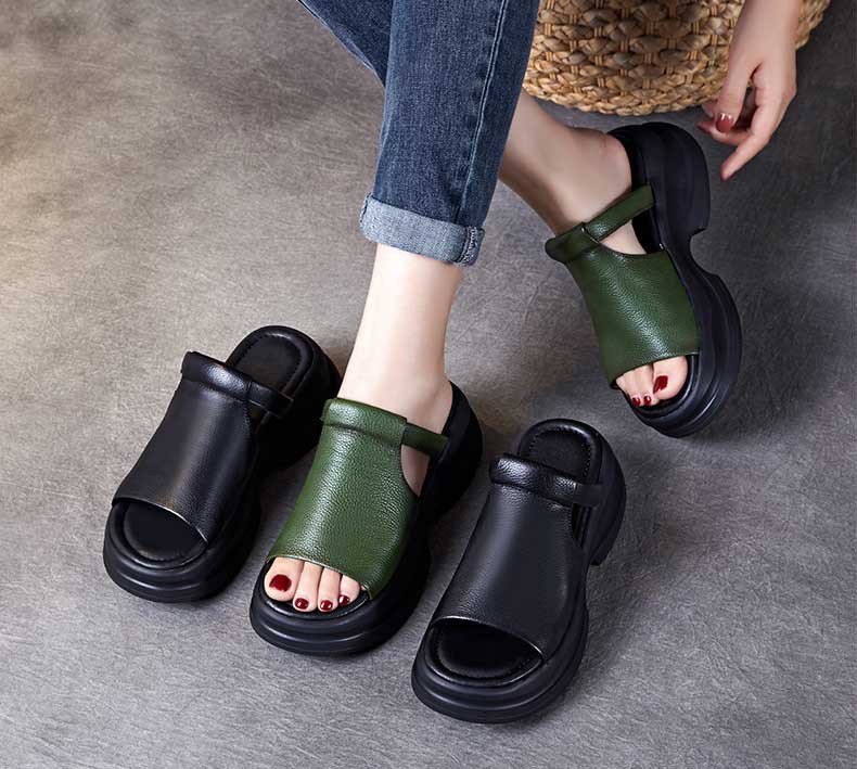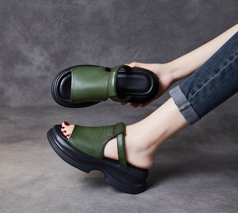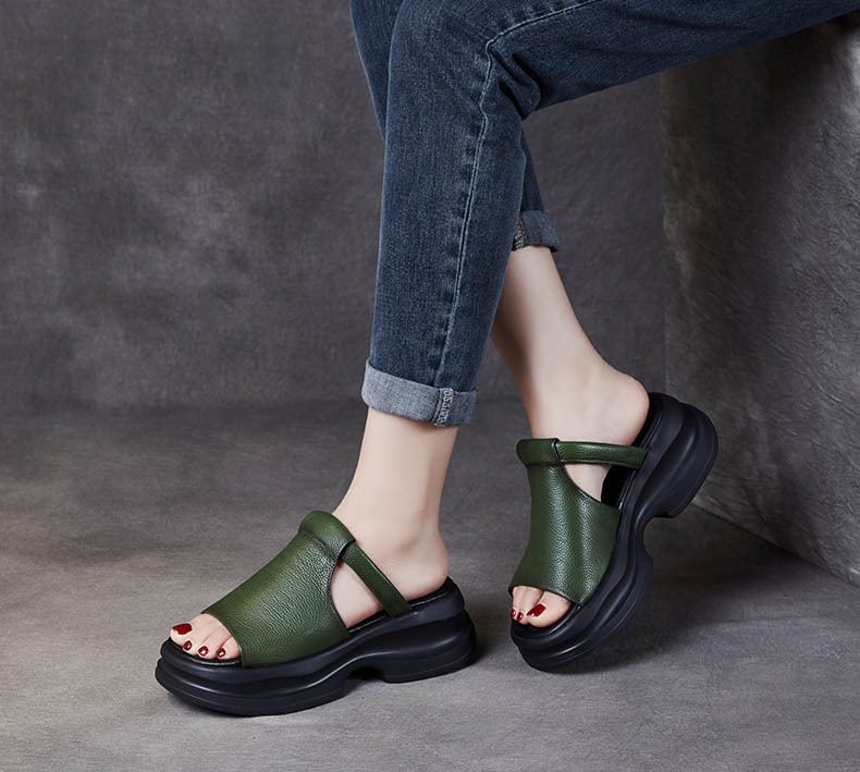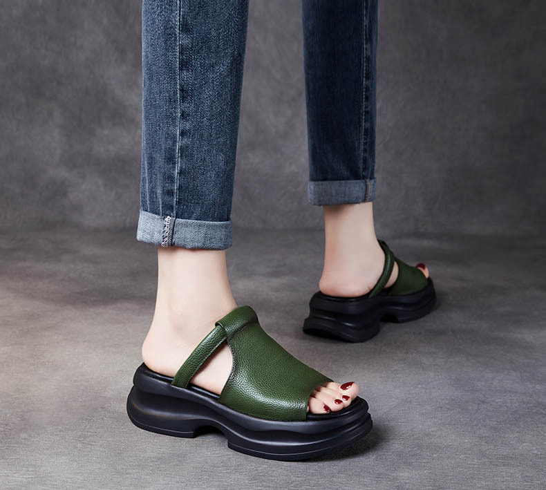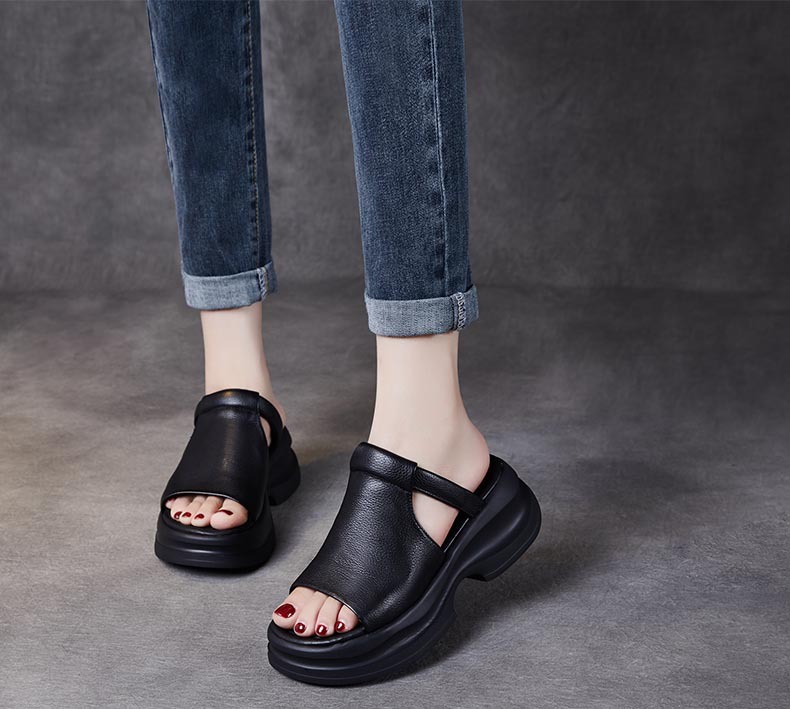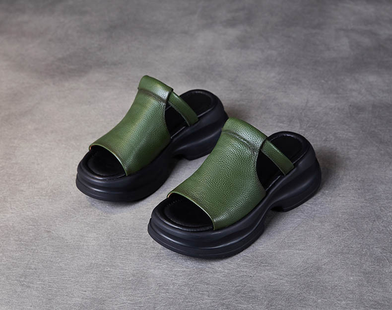 여성용 가죽 플랫폼 두꺼운 밑창 플랫 슬리퍼, 키높이, 오픈토, 여름 2025 신상, 다용도, 엄마용