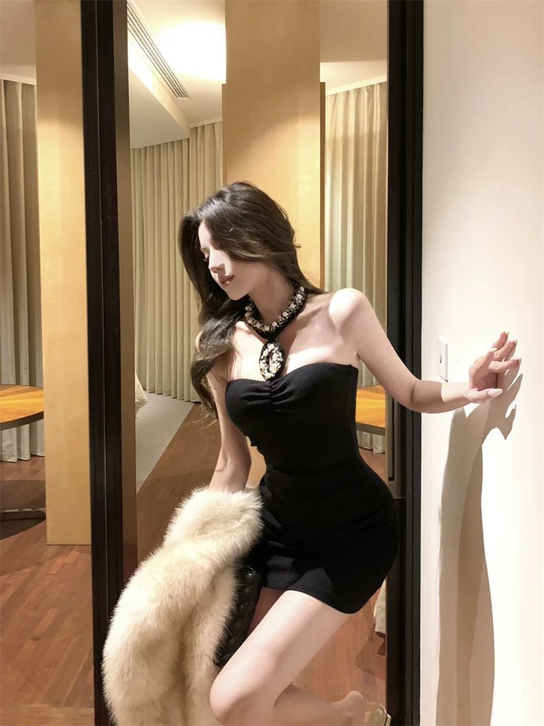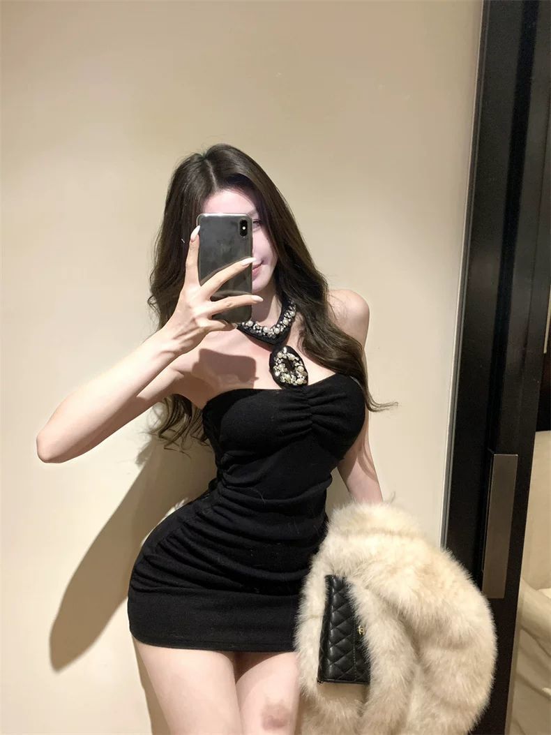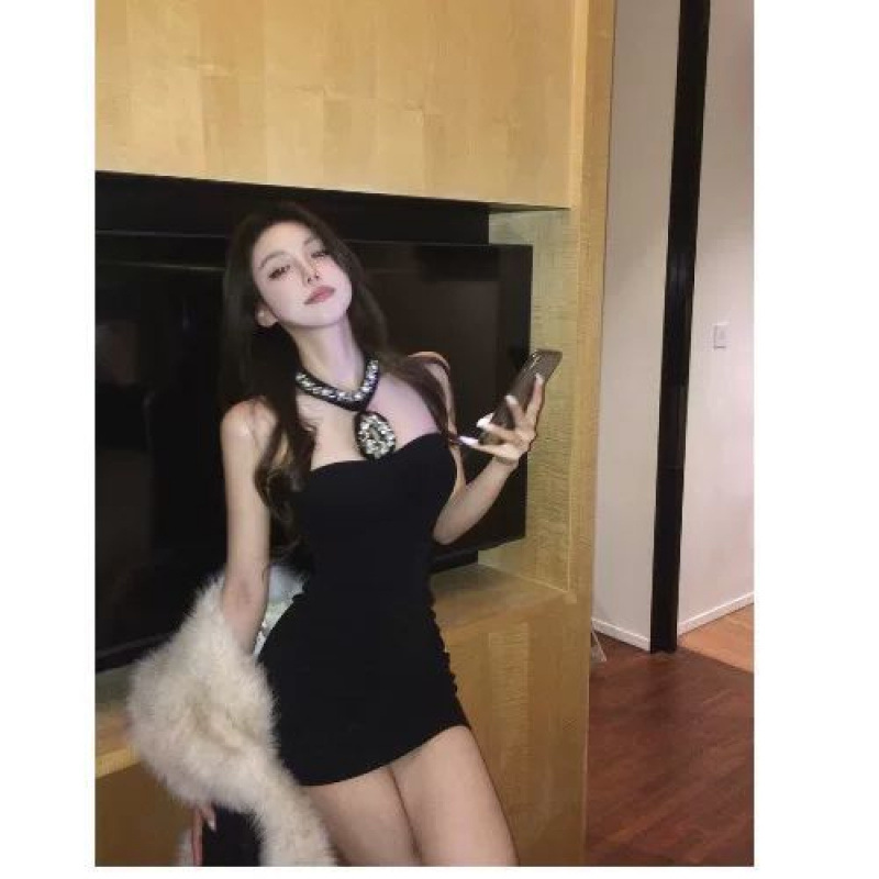 여성용 천금 스타일 다이아몬드가 박힌 홀터넥 서스펜더 드레스, 가을 겨울 순수한 욕망 섹시한 엉덩이 커버 스커트, 새해 셔츠, 튜브 탑 스커트스토어 가기