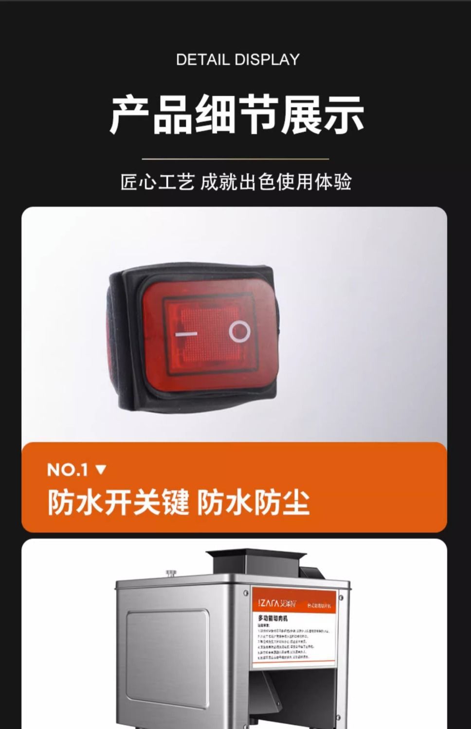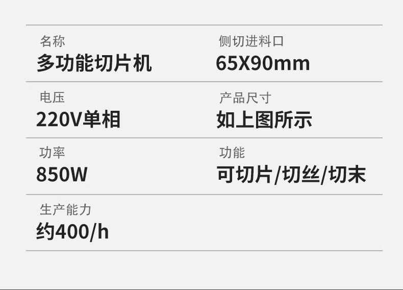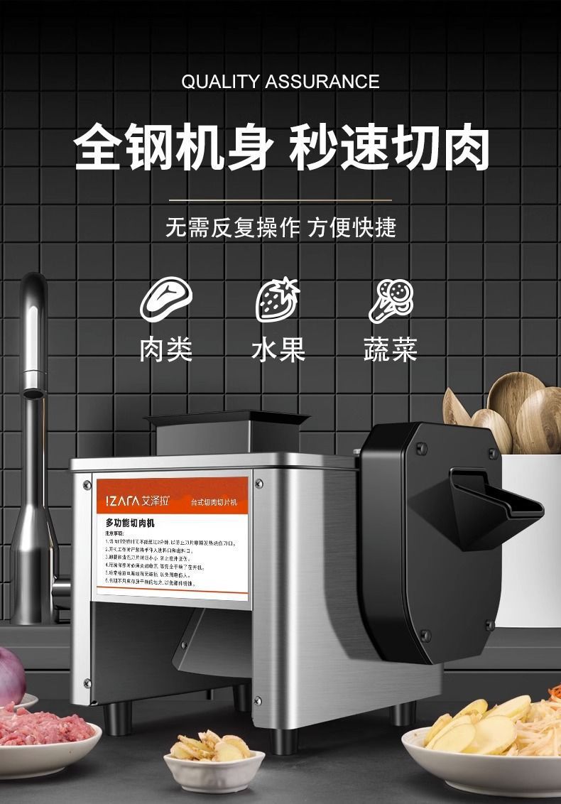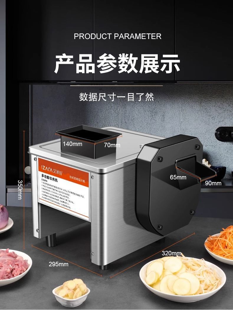 • 측면 절단 - 두께 조절 가능#단일 절단 고기/부드럽고 단단한 야채 - 고기를 5mm로 자릅니다.#껍질이 있는 고기/조림 고기/조리된 고기를 자르는 데 적합합니다.
