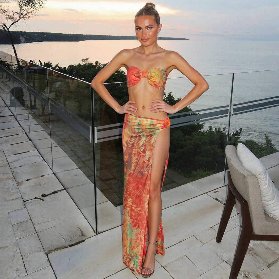 국경 간 유럽과 미국 스타일 2025 봄과 여름 새로운 여성 패션 섹시한 끈이없는 분할 긴 원피스 비키니 3 피스 세트
