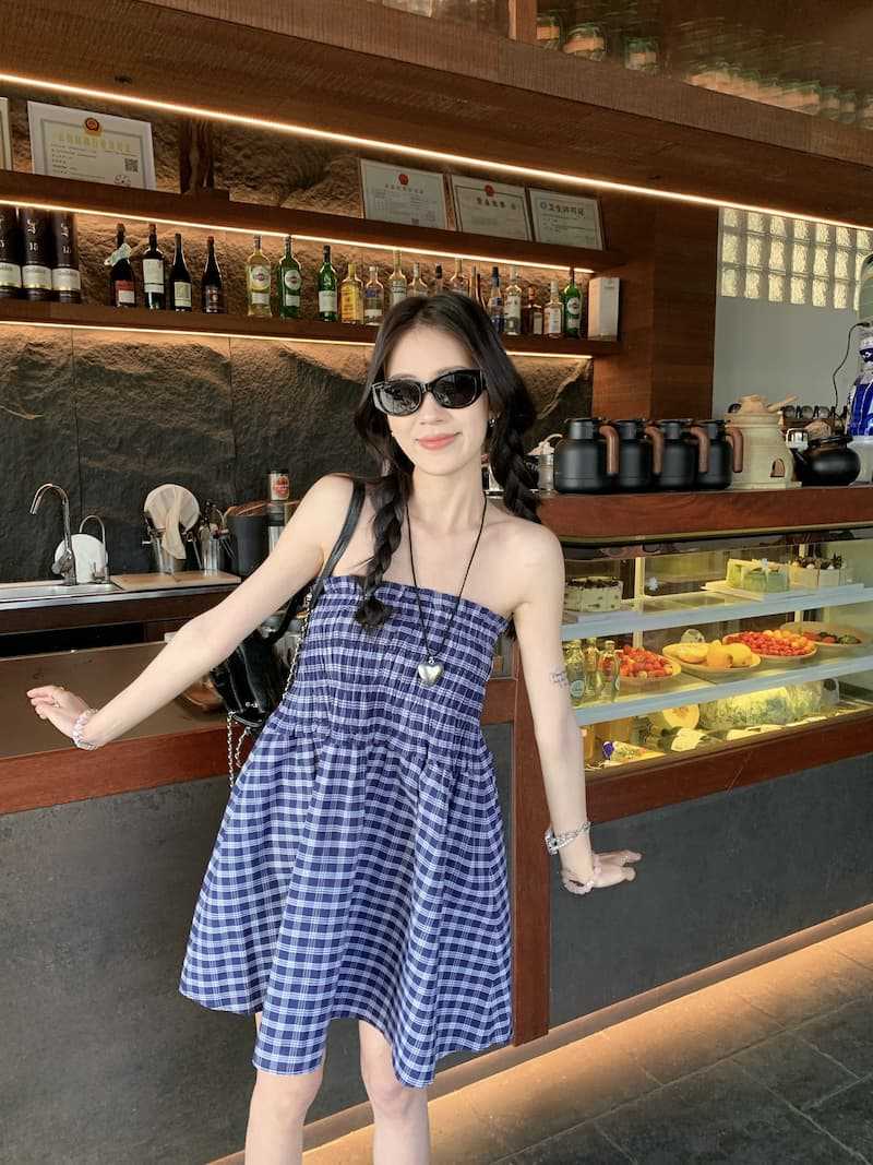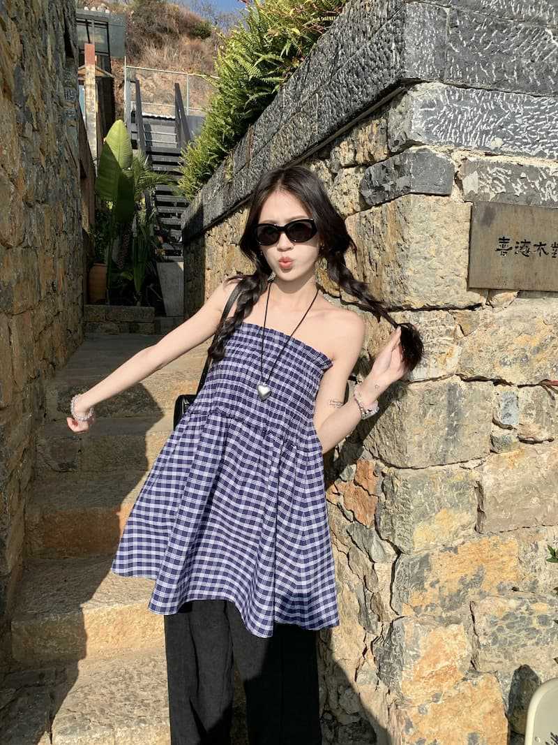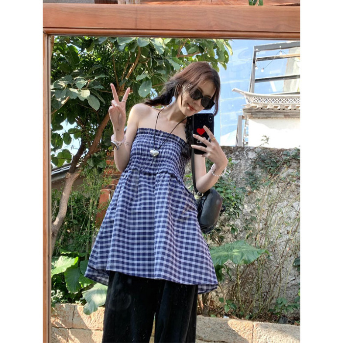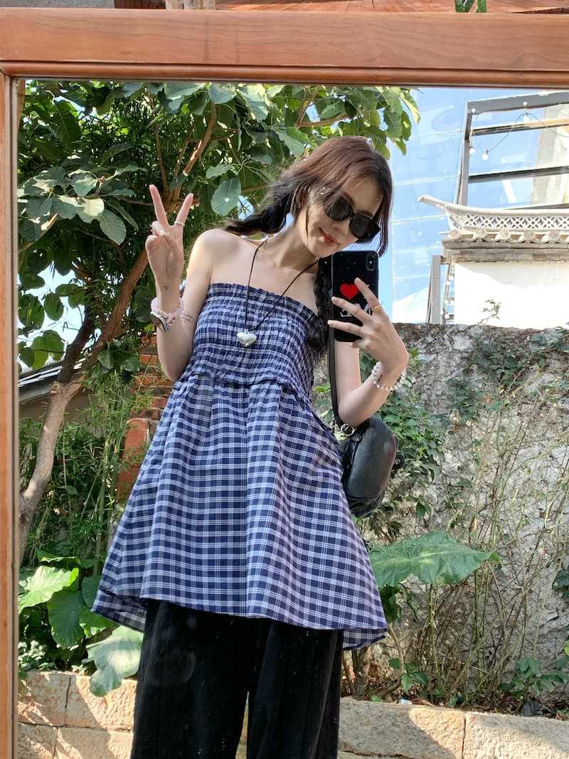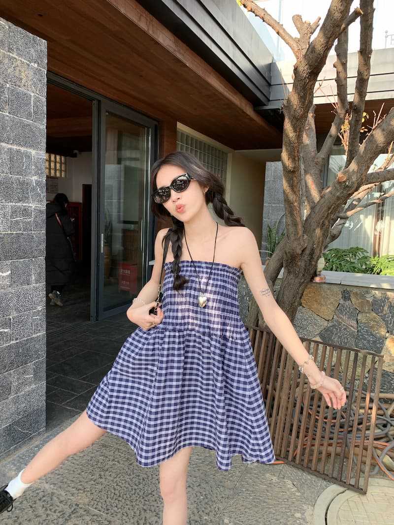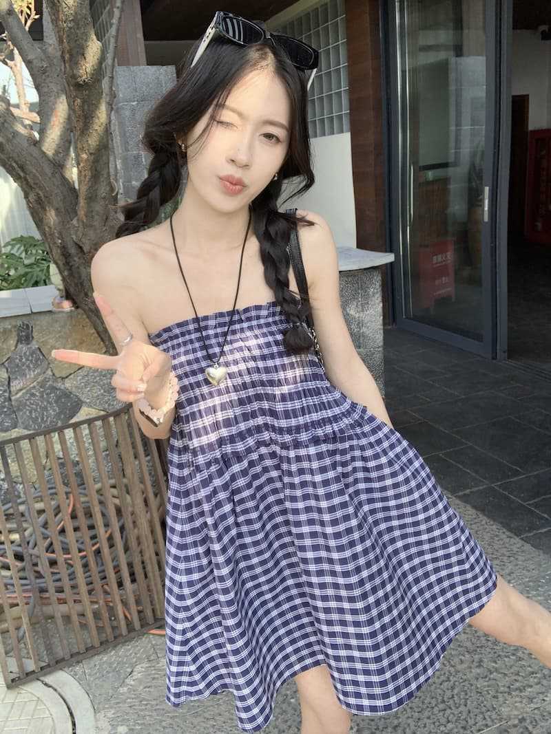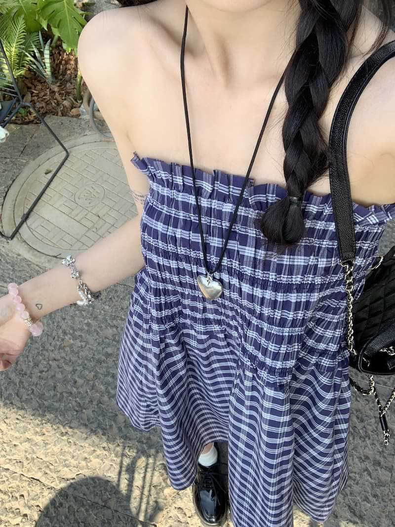 Chenling [광저우 원단-오리지널 제작] 틈새 디자인 블루 체크 무늬 스커트 여성용 튜브탑 A라인