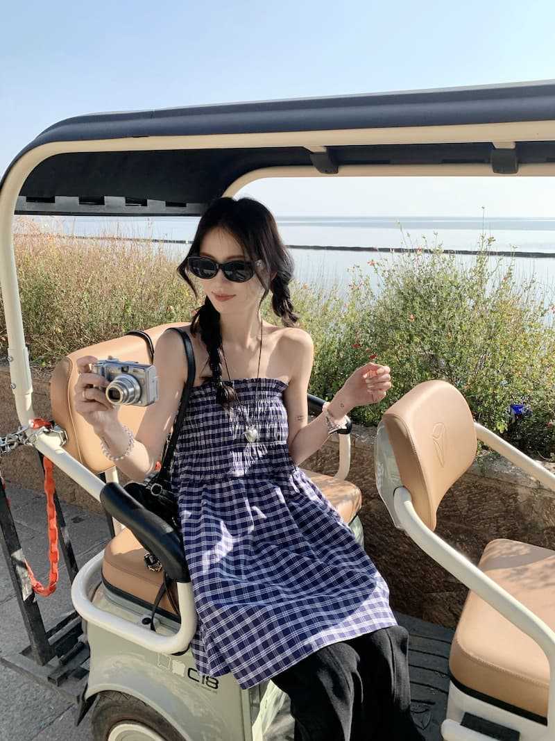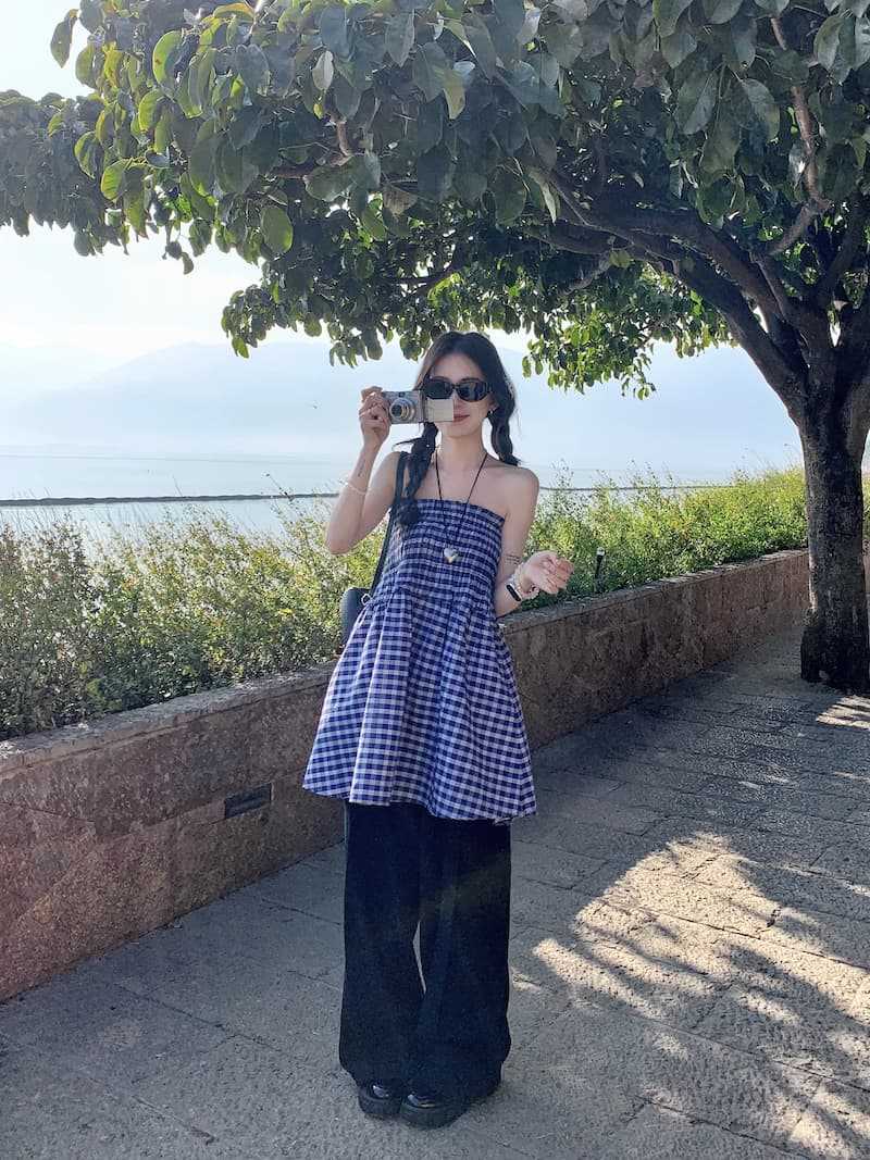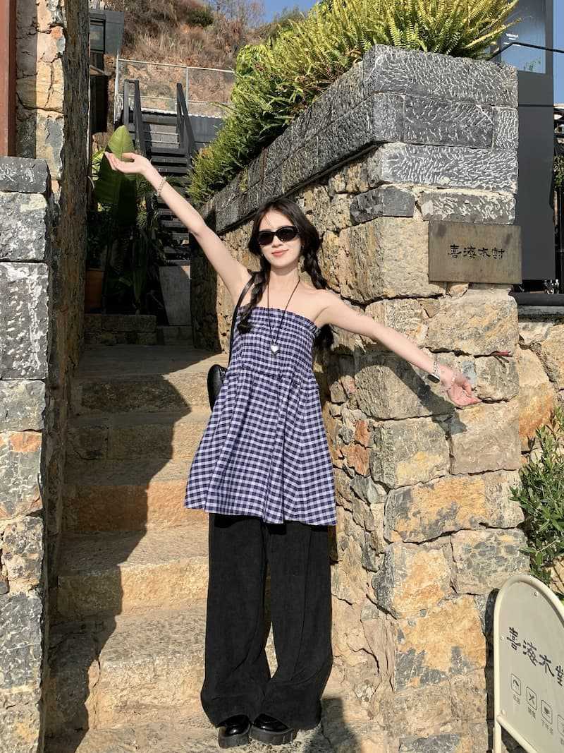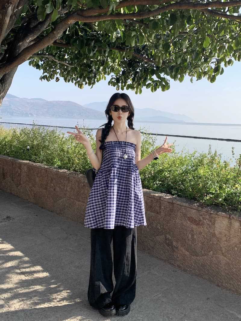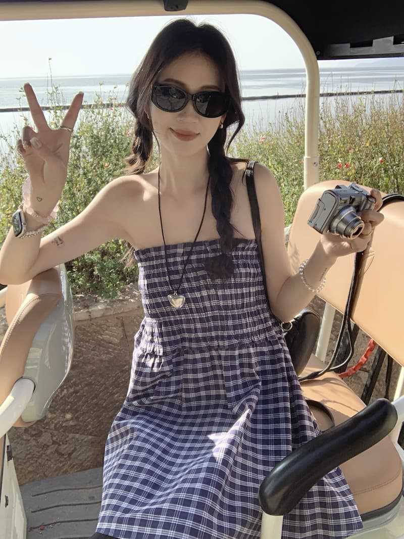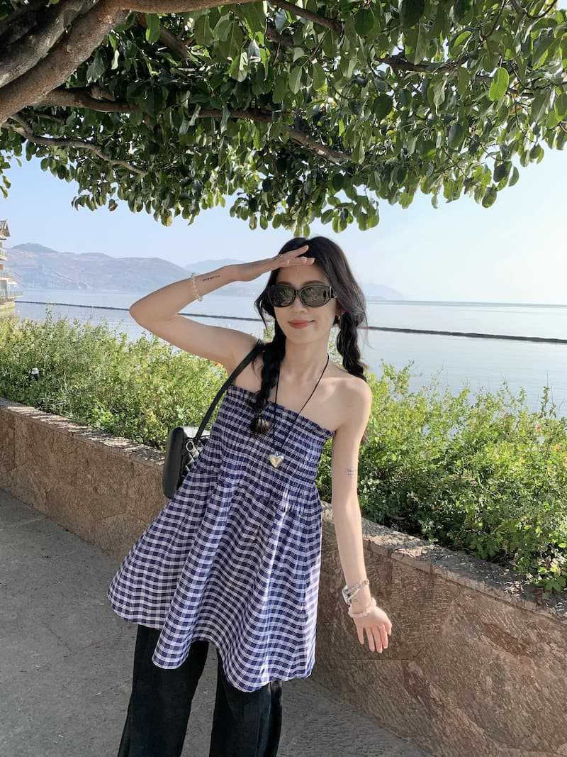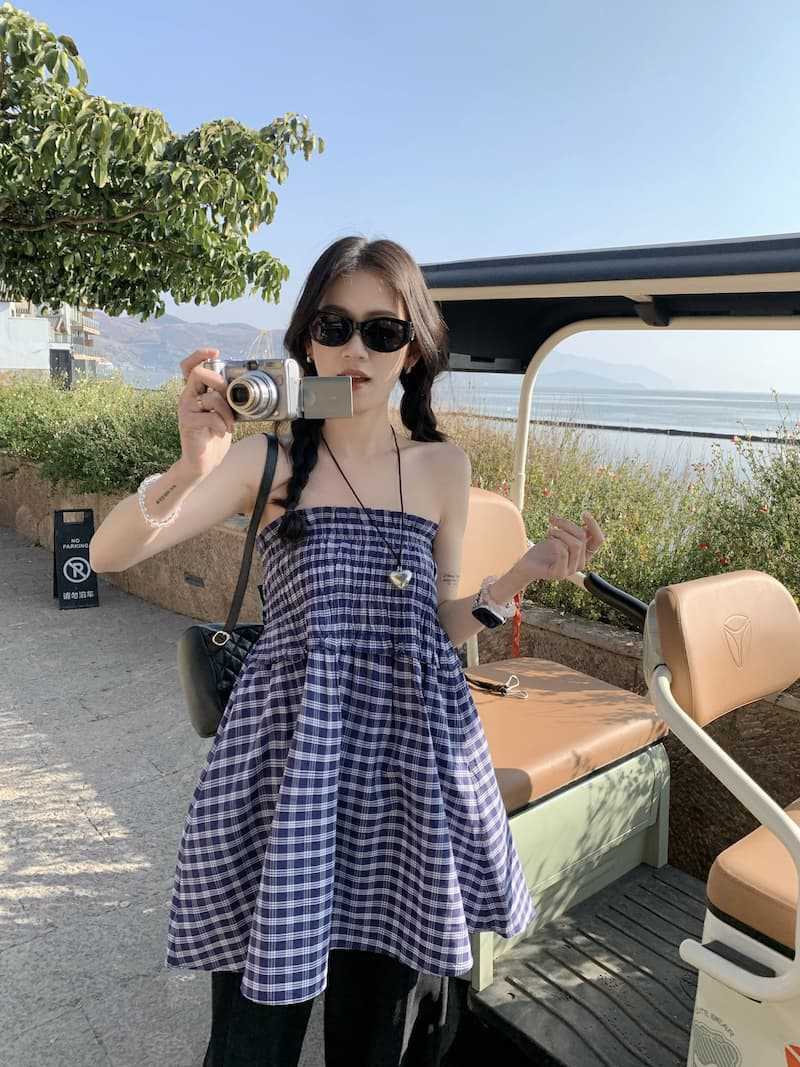 Chenling [광저우 원단-오리지널 제작] 틈새 디자인 블루 체크 무늬 스커트 여성용 튜브탑 A라인