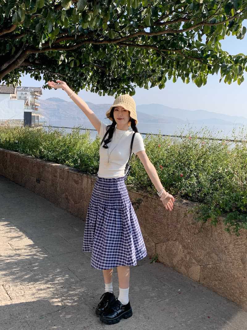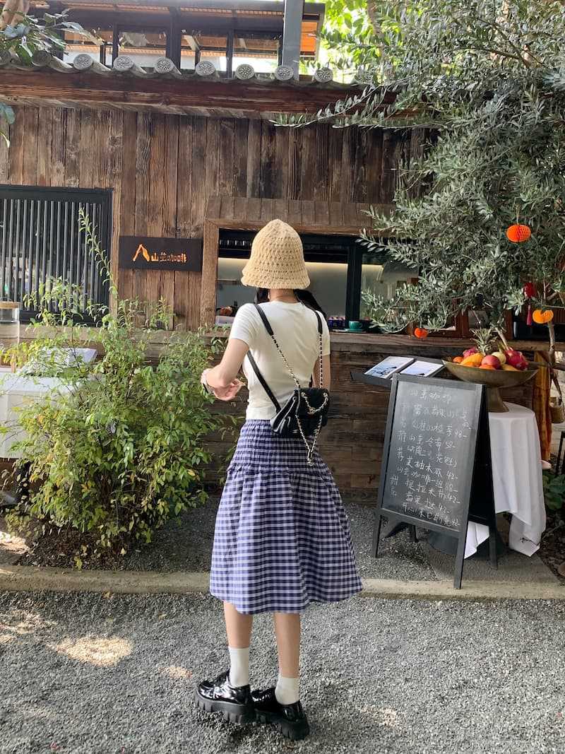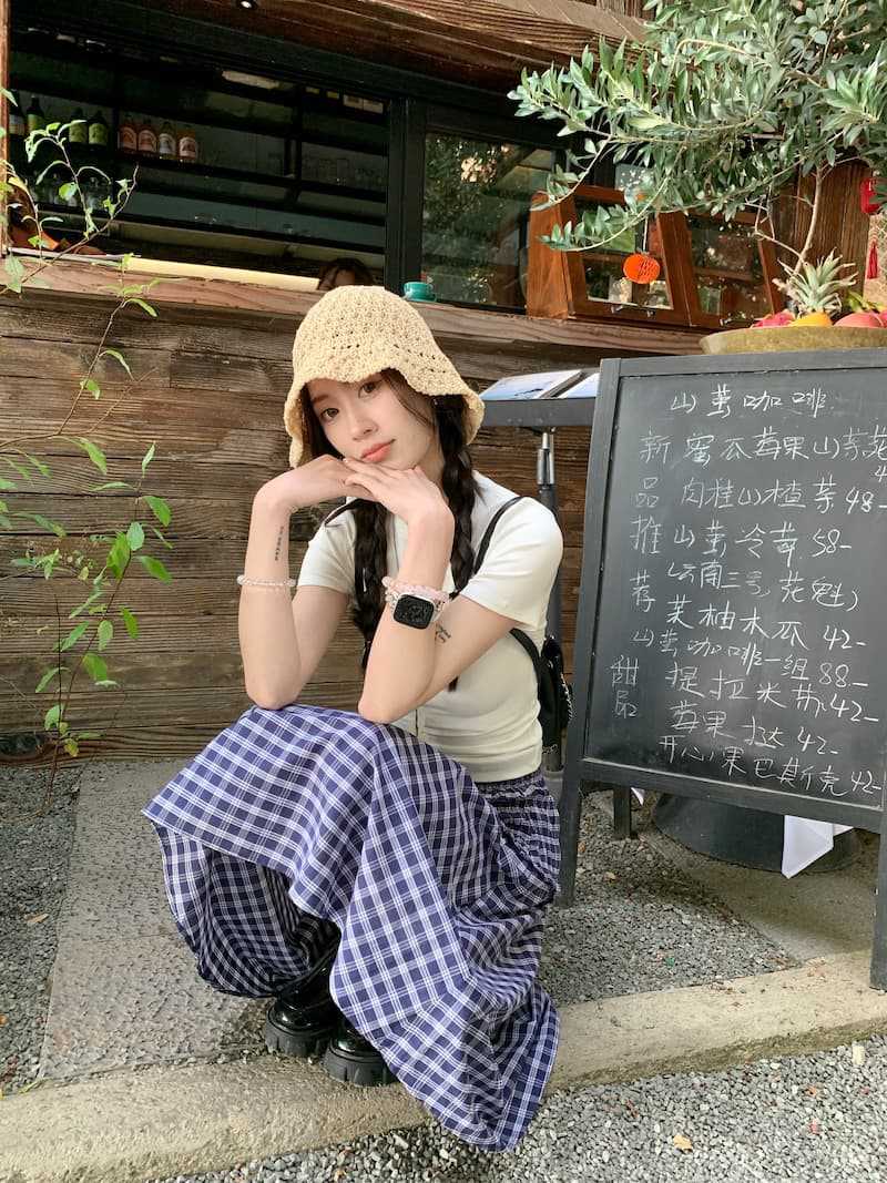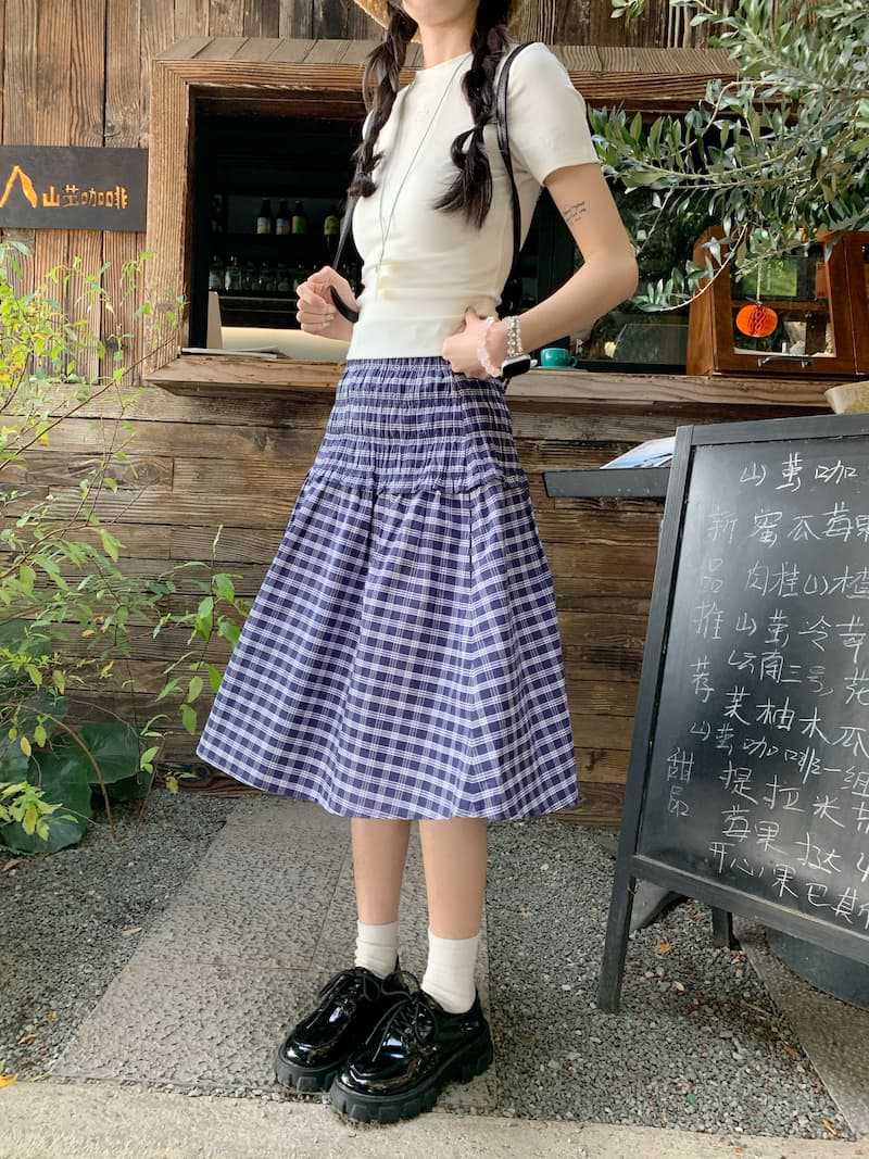 Chenling [광저우 원단-오리지널 제작] 틈새 디자인 블루 체크 무늬 스커트 여성용 튜브탑 A라인스토어 가기