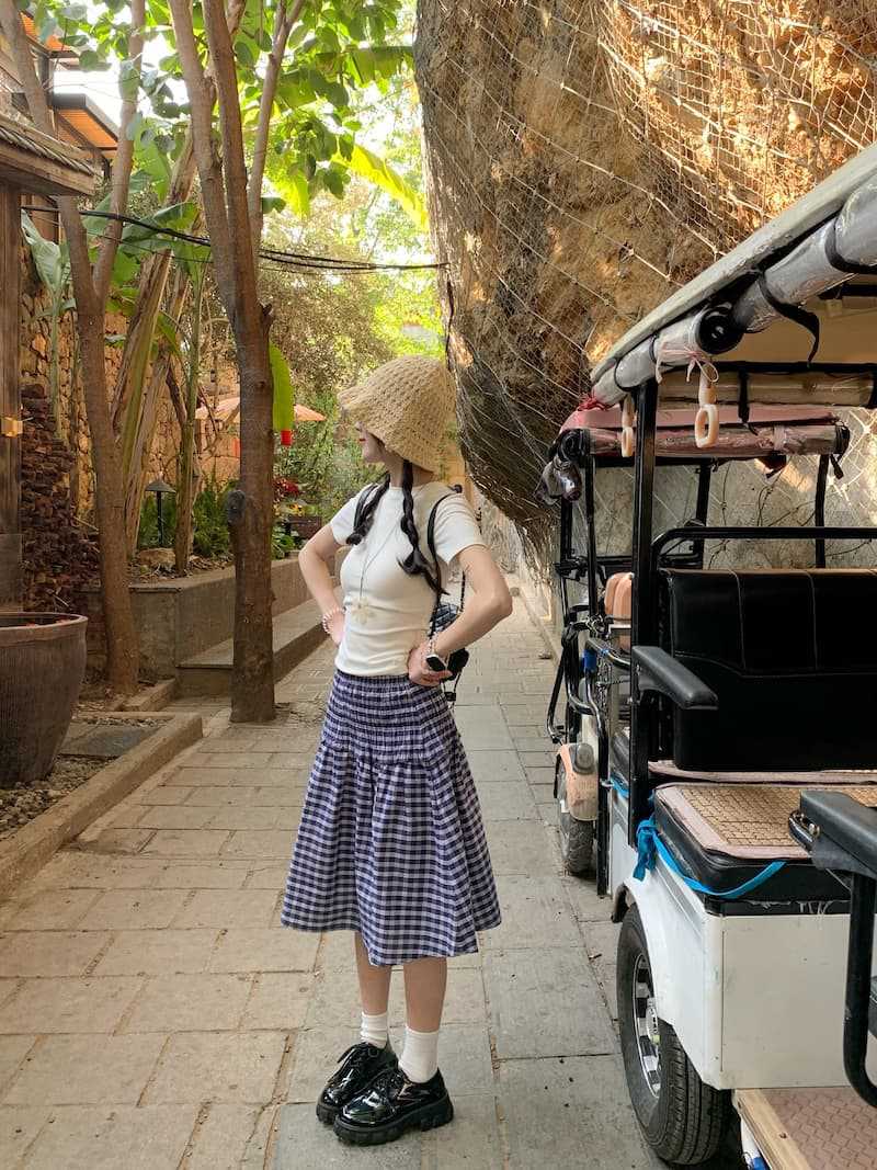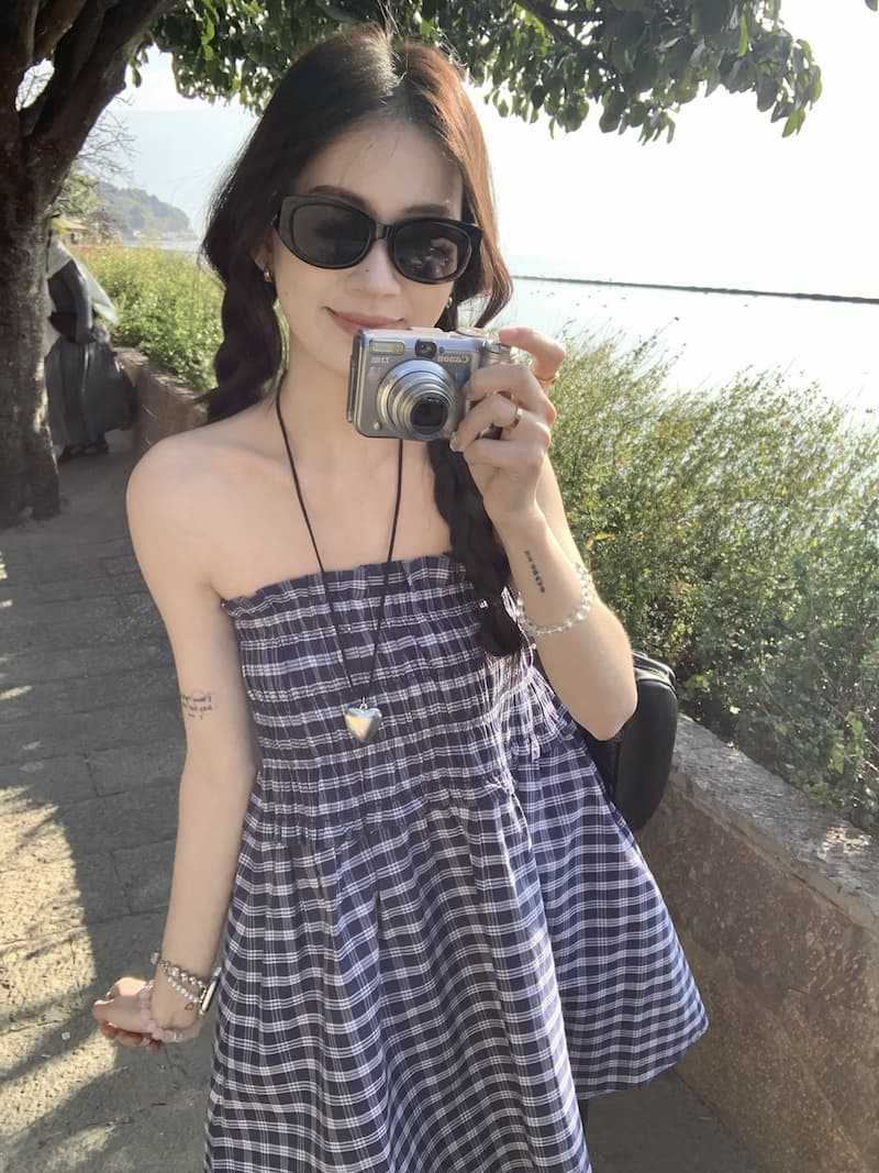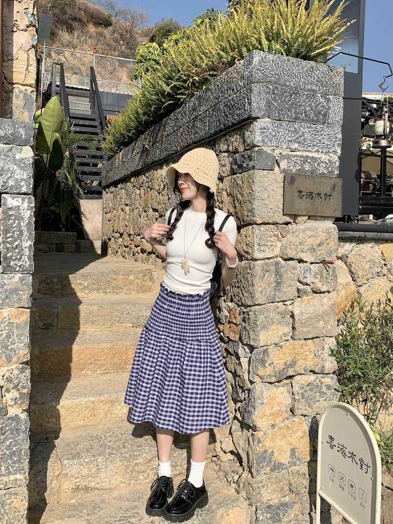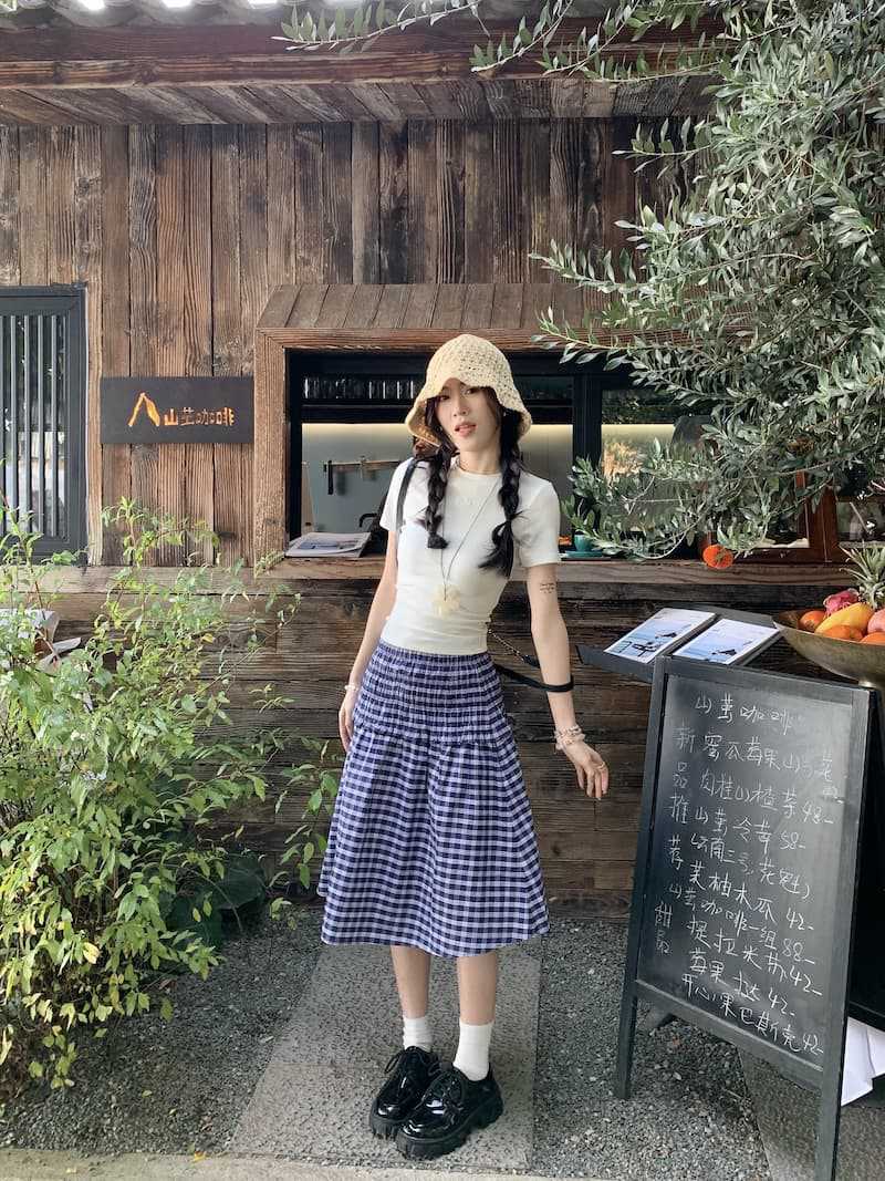 Chenling [광저우 원단-오리지널 제작] 틈새 디자인 블루 체크 무늬 스커트 여성용 튜브탑 A라인스토어 가기