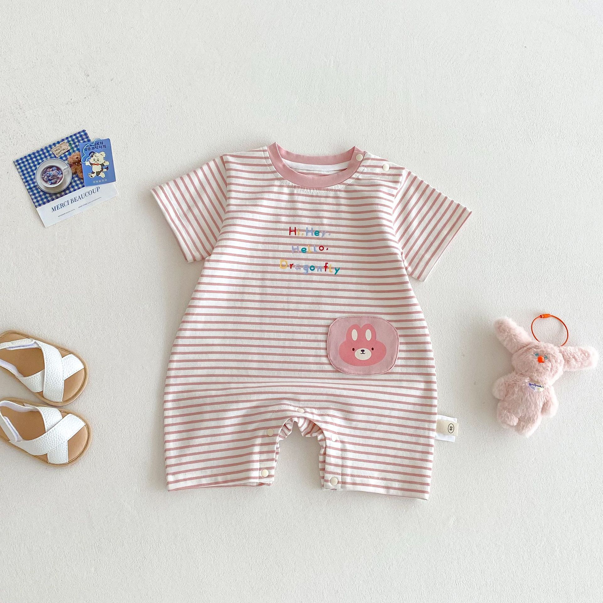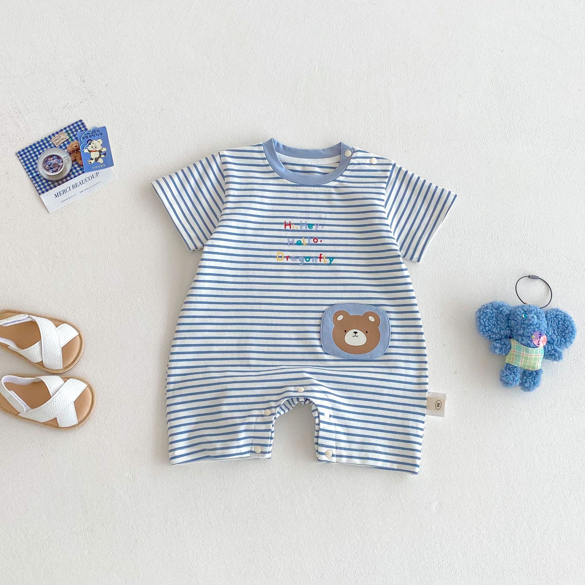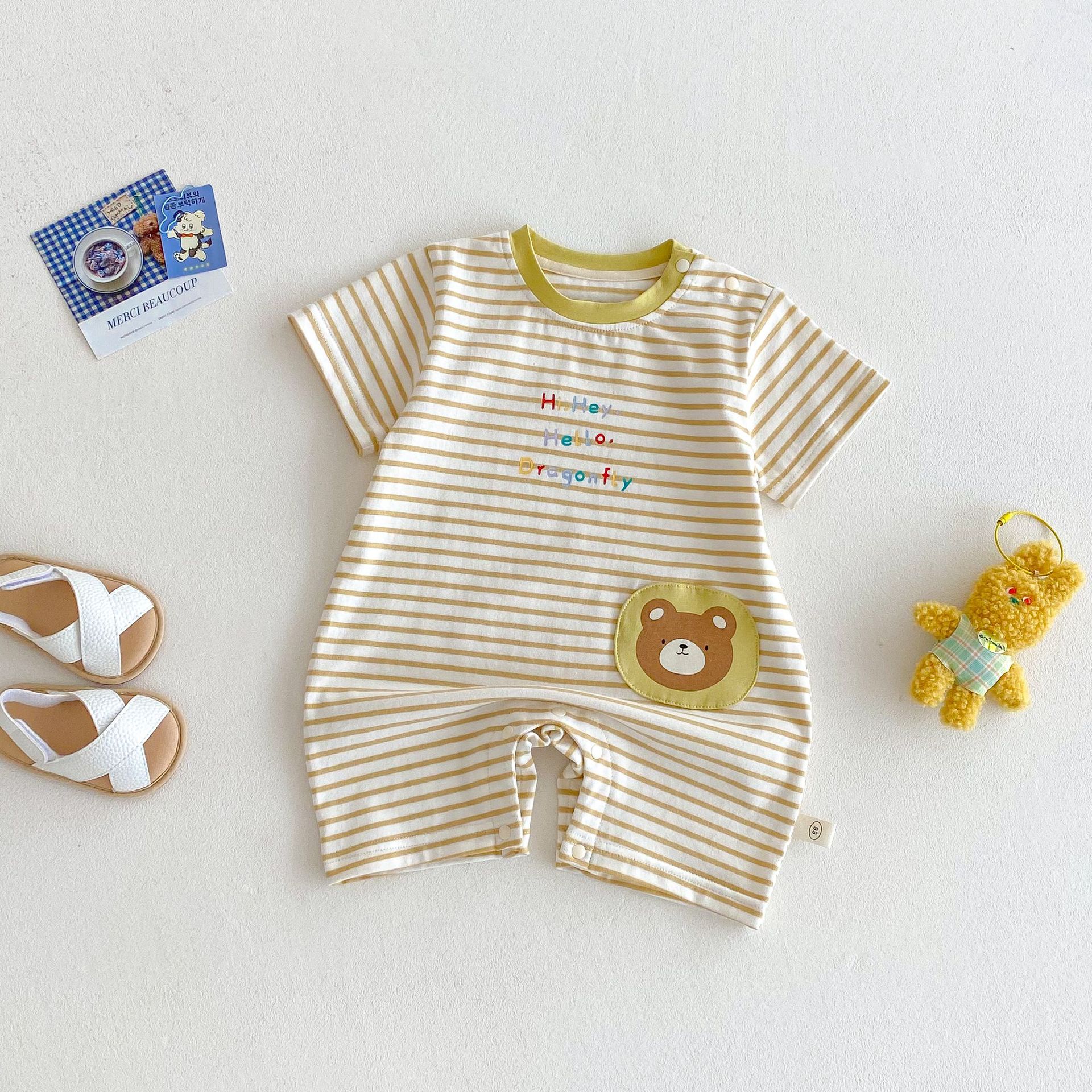 아기 만화 붐 수트 2025 새로운 여름 아기 한국 슈퍼 귀여운 등반 세트 신생아 편지 스티커 학카 옷스토어 가기