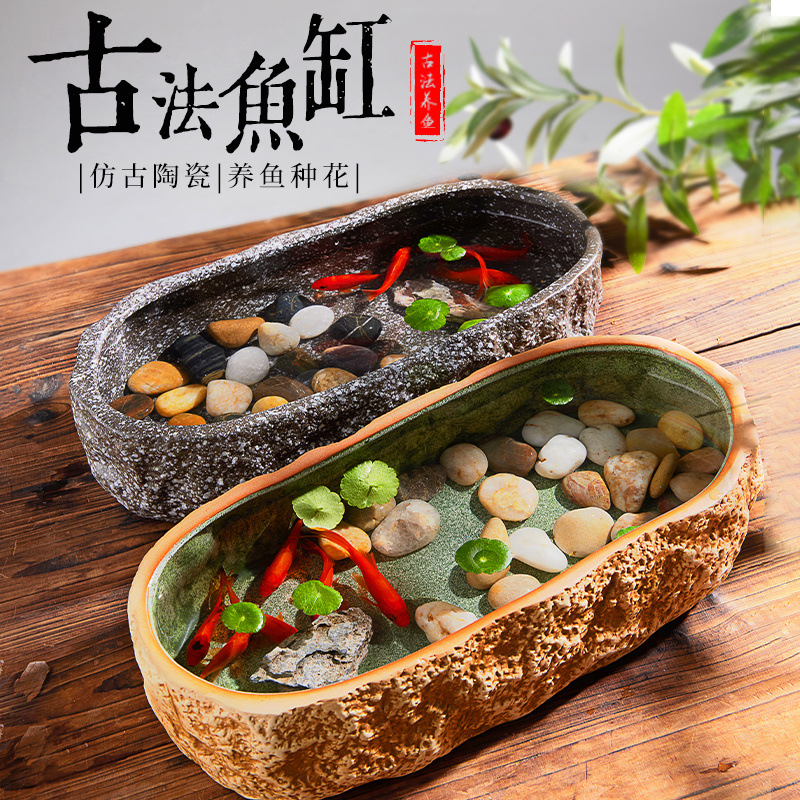 고대 방법 물고기 탱크 복고풍 스타일 조경 데스크탑 물고기 탱크 야외 발코니 물고기 탱크 세라믹 탱크 수경 녹색 식물 공장스토어 가기