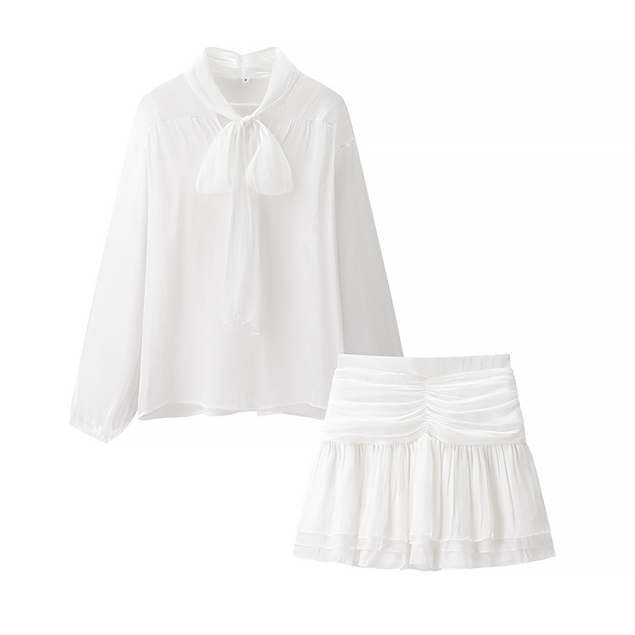 패션 여성 투피스 세트 여름 얇은 활 레이스 업 긴팔 풀오버 루즈 셔츠 주름 미니 스커트