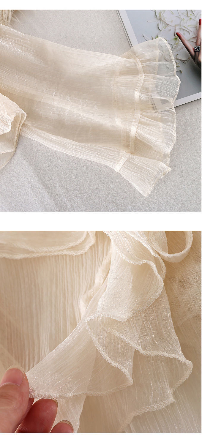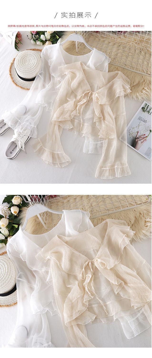 슈퍼 요정 벨 슬리브 러플 레이스 업 짧은 자외선 차단 셔츠 탑 여름 새 스타일 스커트와 작은 숄 여성용