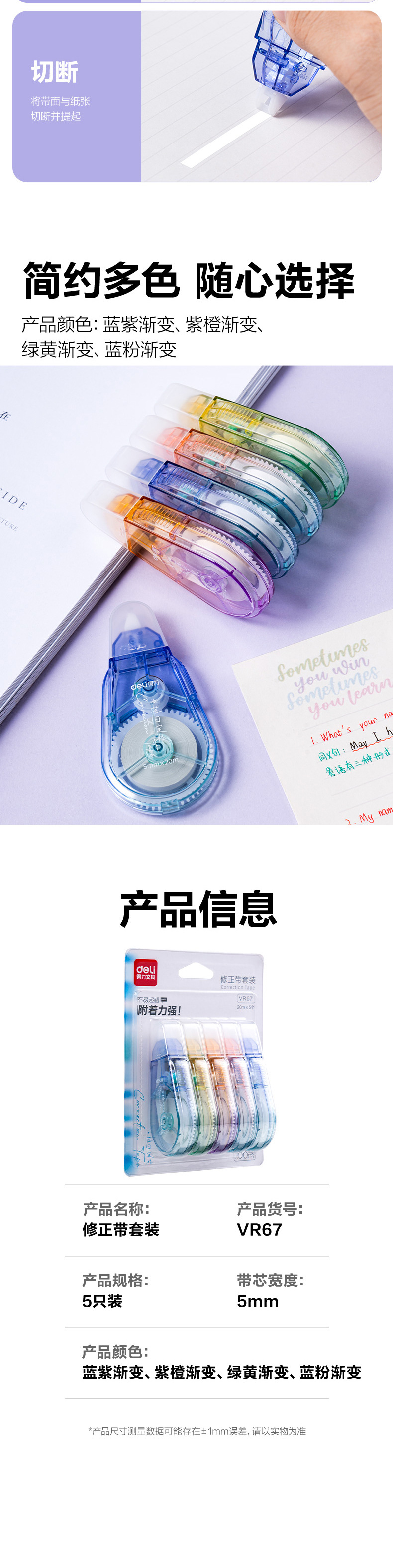 델리 VR67 초등학생용 그라데이션 색상 교정 테이프, 중학생용 경음 교정 테이프, 교정 테이프 100m