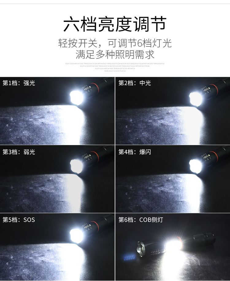 【档位模式】:强光、中光、弱光、爆闪、慢闪、侧灯