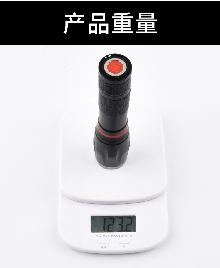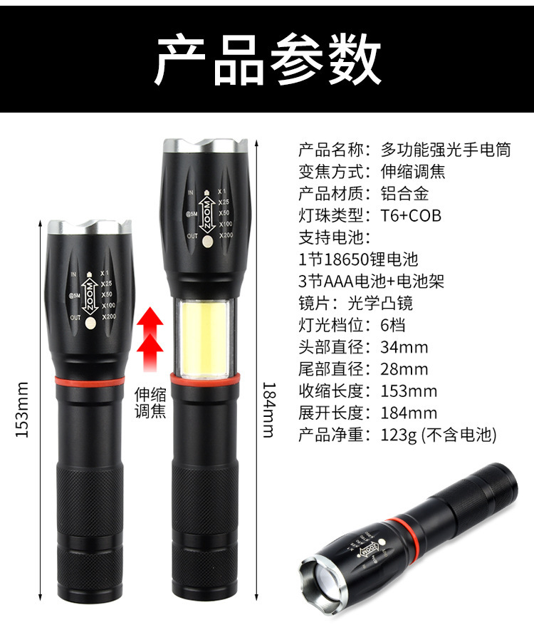 2.伸缩变焦:上下拉伸头部,可调节散光-聚光模式,方便照明使用;