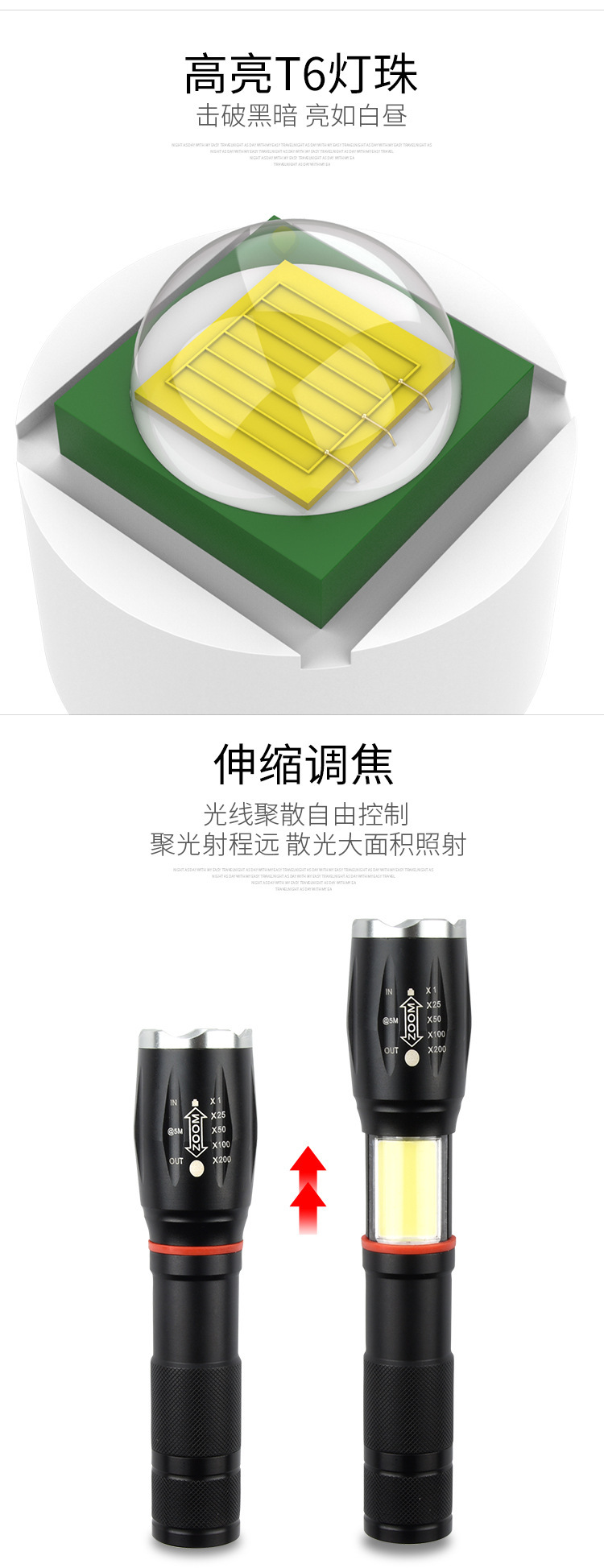 【产品灯珠】:主灯T6、侧灯COB 尾部带磁铁