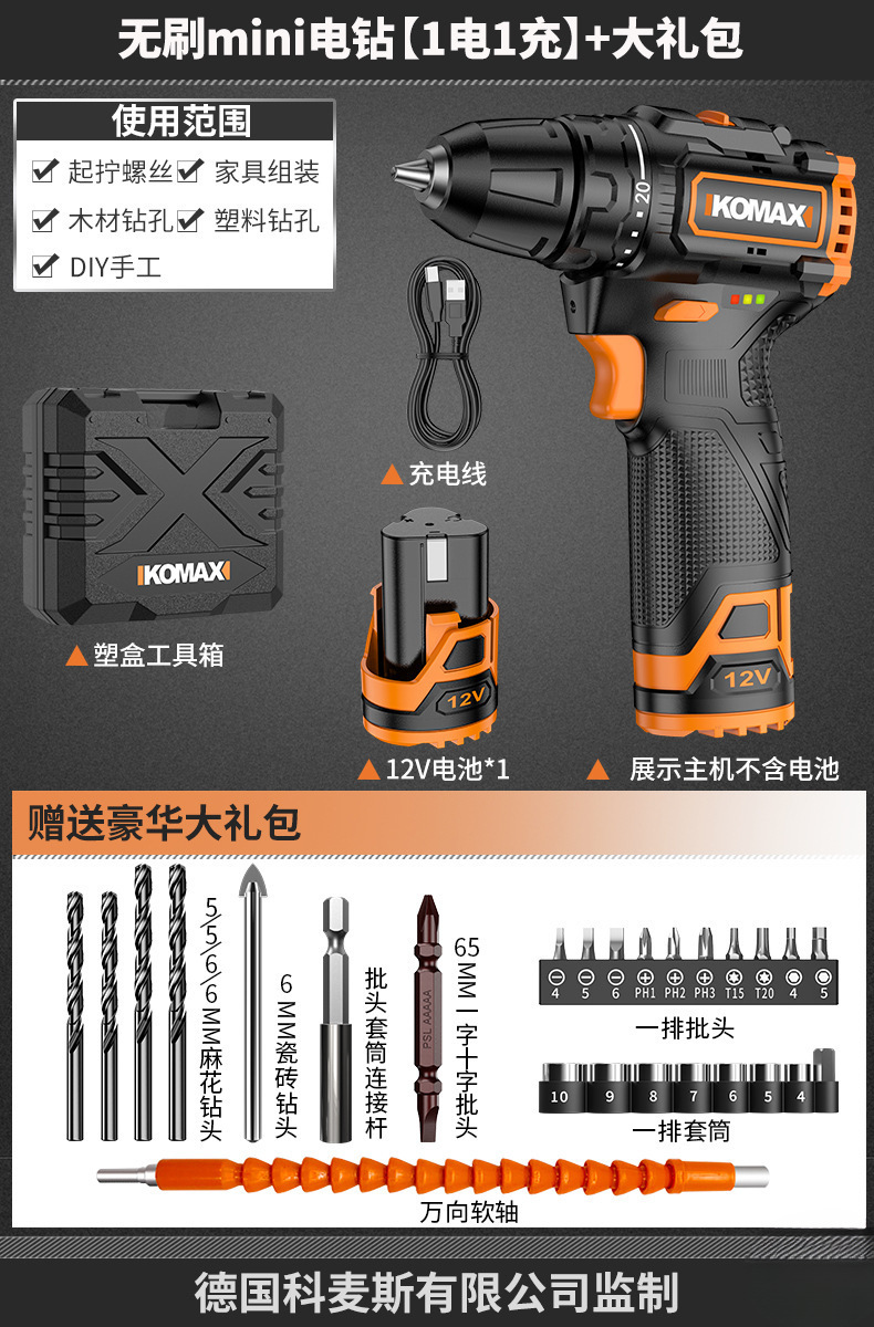 • 브러시리스 미니 전기 드릴 [배터리 1개, 충전 1개] + 선물 패키지
