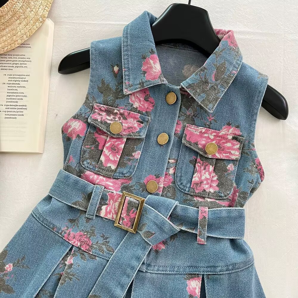 소녀 데님 원피스 2025 년 여름 새 한국식 옷깃 인쇄 어린이 치마 소녀 데님 치마