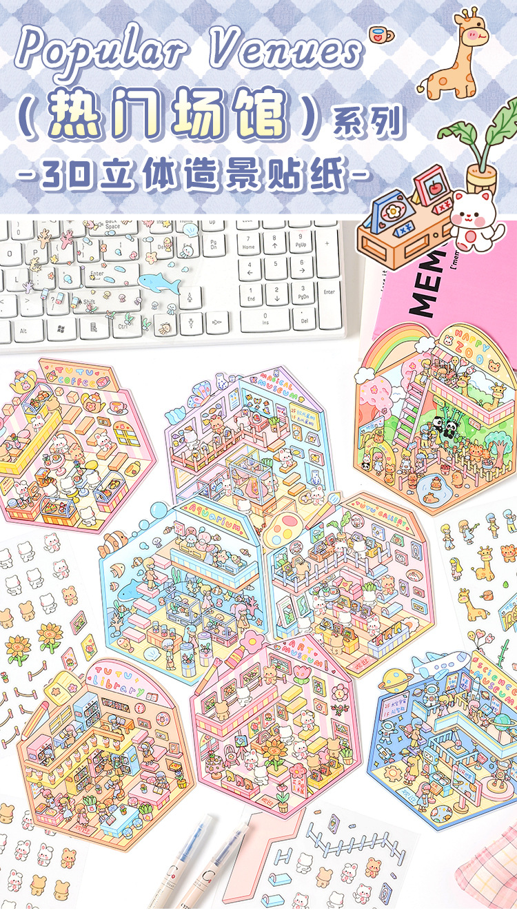 인기있는 장소 만화 조경 diy 스티커 어린이 3d 입체 장면 스티커 도매 국경 아마존스토어 가기