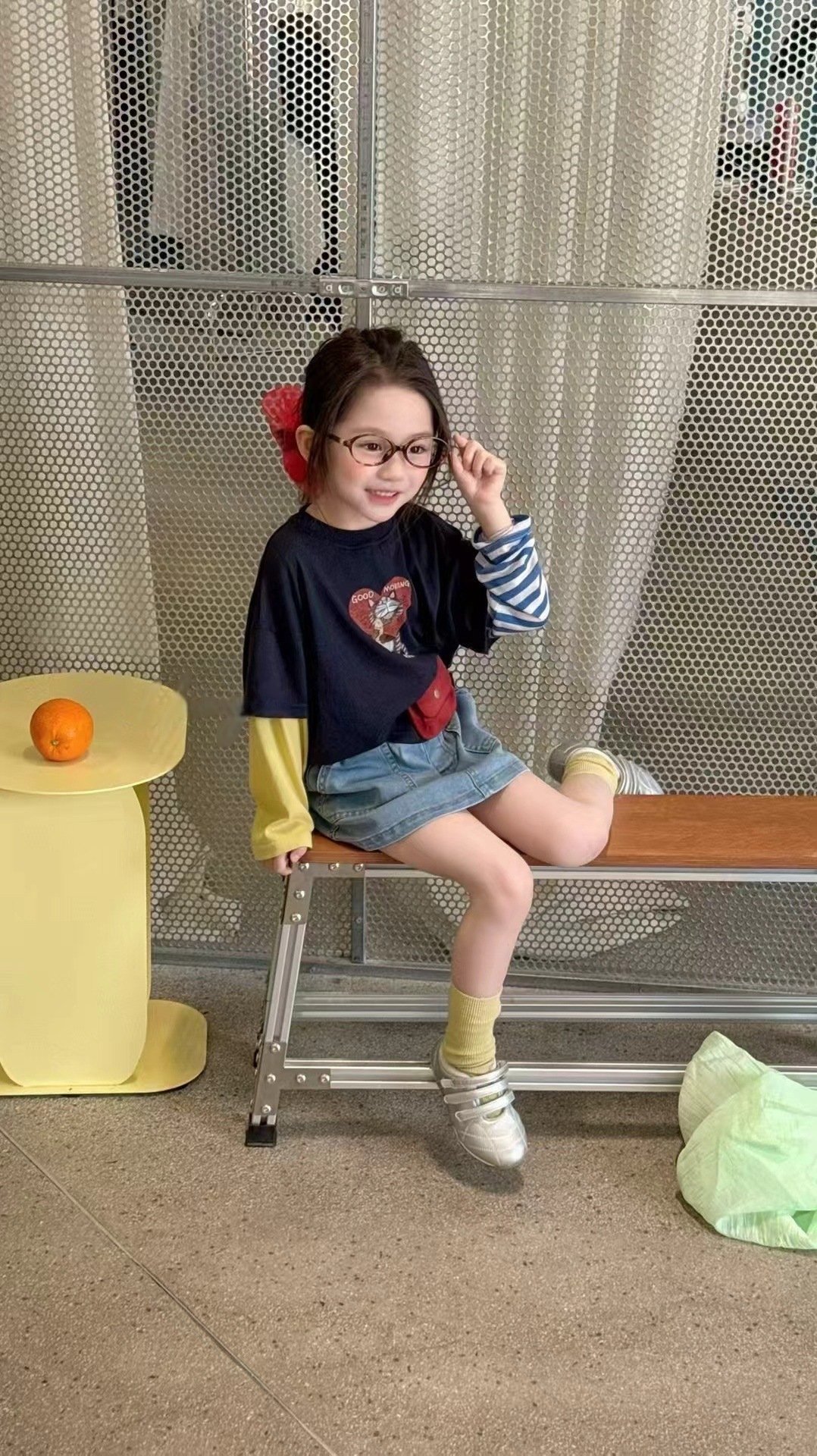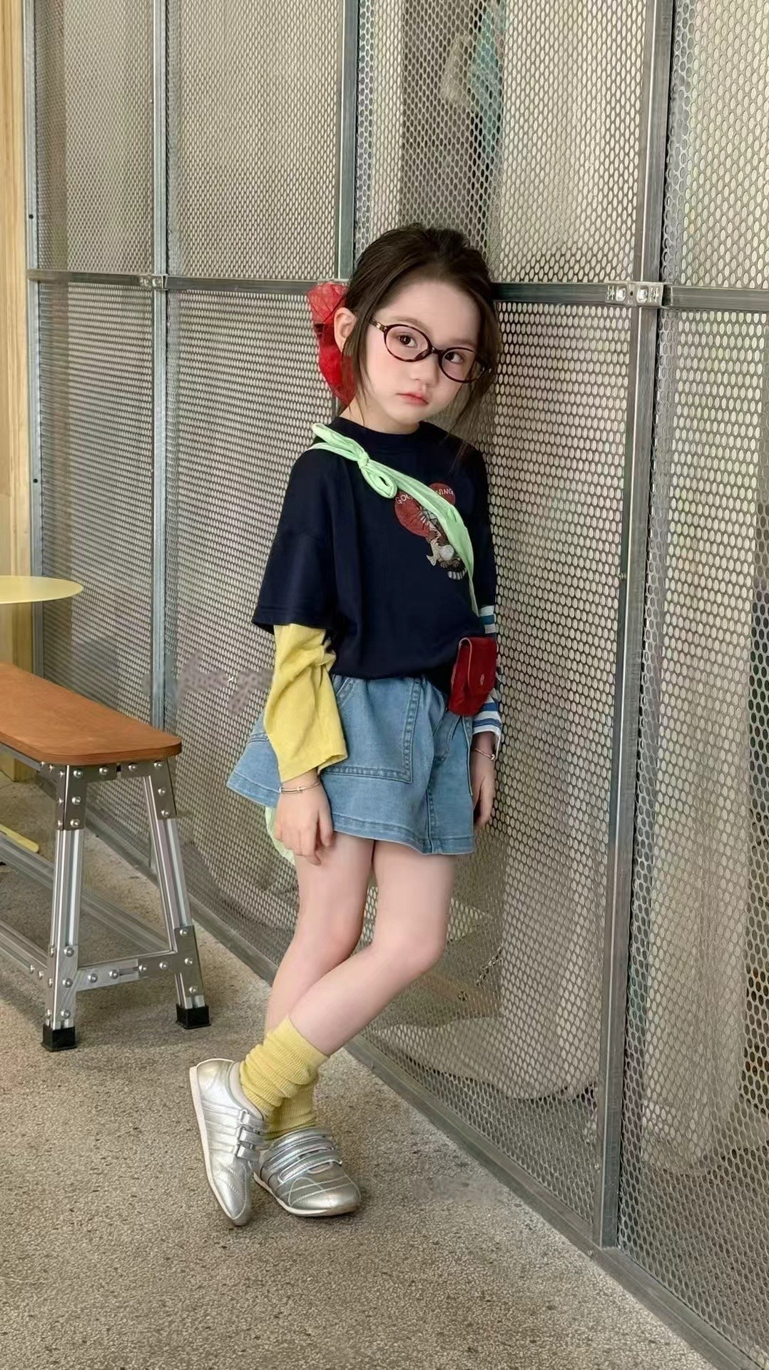 소녀 티셔츠 25 봄과 여름 새로운 어린이 캐주얼 만화 가짜 투피스 탑 트렌디 한 아기의 올 매치 콘트라스트 컬러 옷스토어 가기