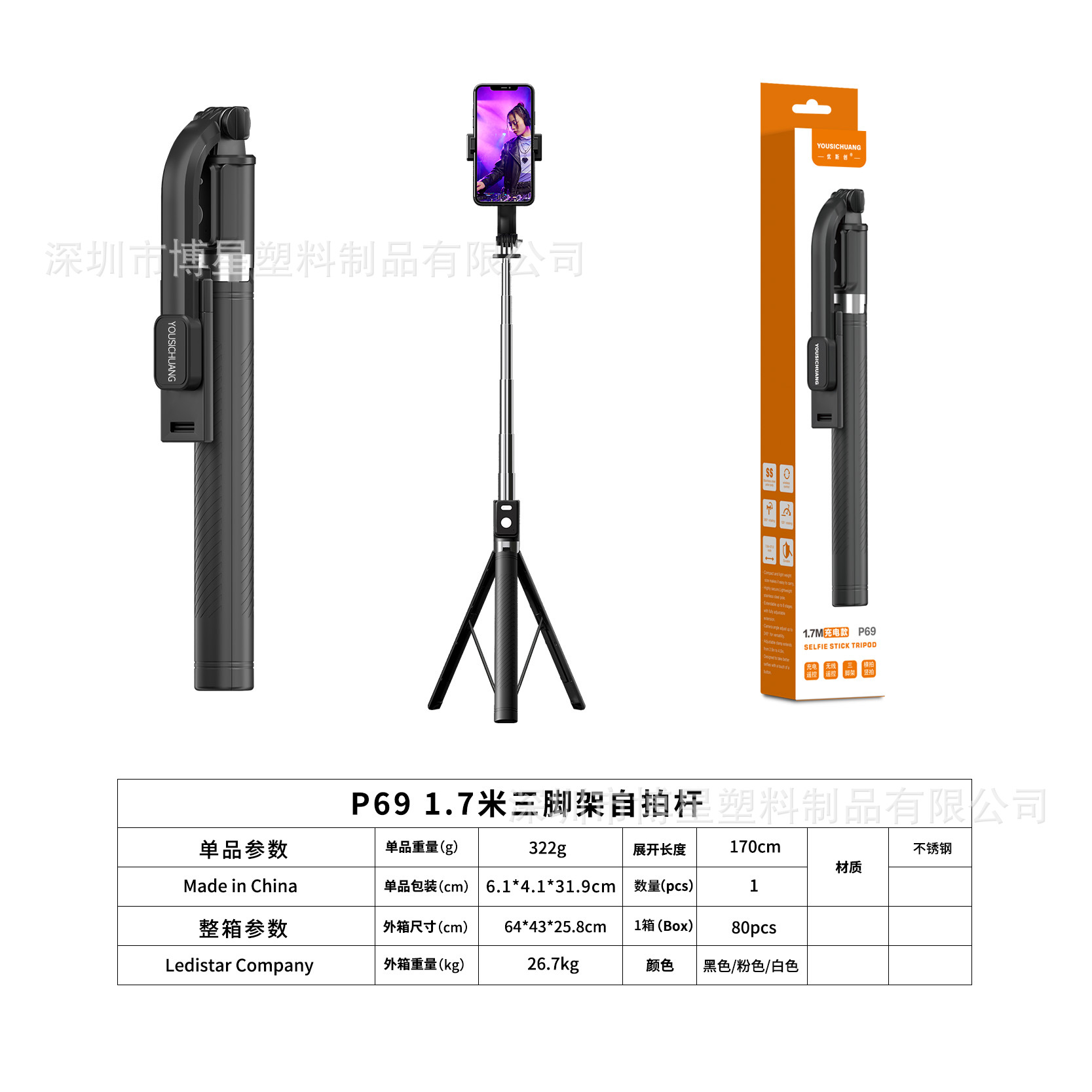 Yoschuang P69 블루투스 셀카 스틱 1.7 m 바닥 삼각대 슈팅 라이브 아티팩트 원격 컨트롤러 충전식