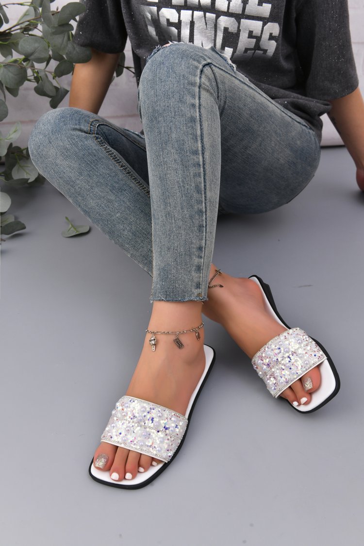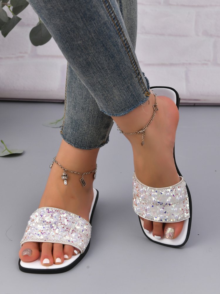 여성용 샌들 및 슬리퍼 2025 여름 신작 한국식 스팽글로 발이 피곤하지 않고 다재다능한 학생 오픈 토 플랫 슬리퍼