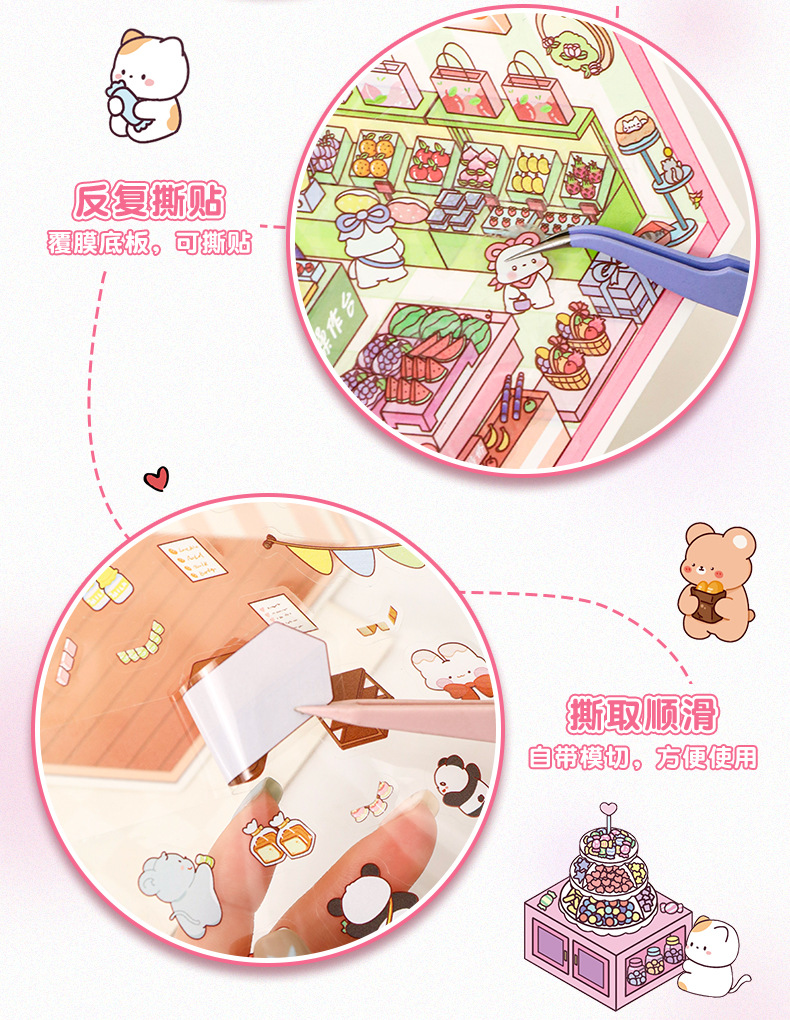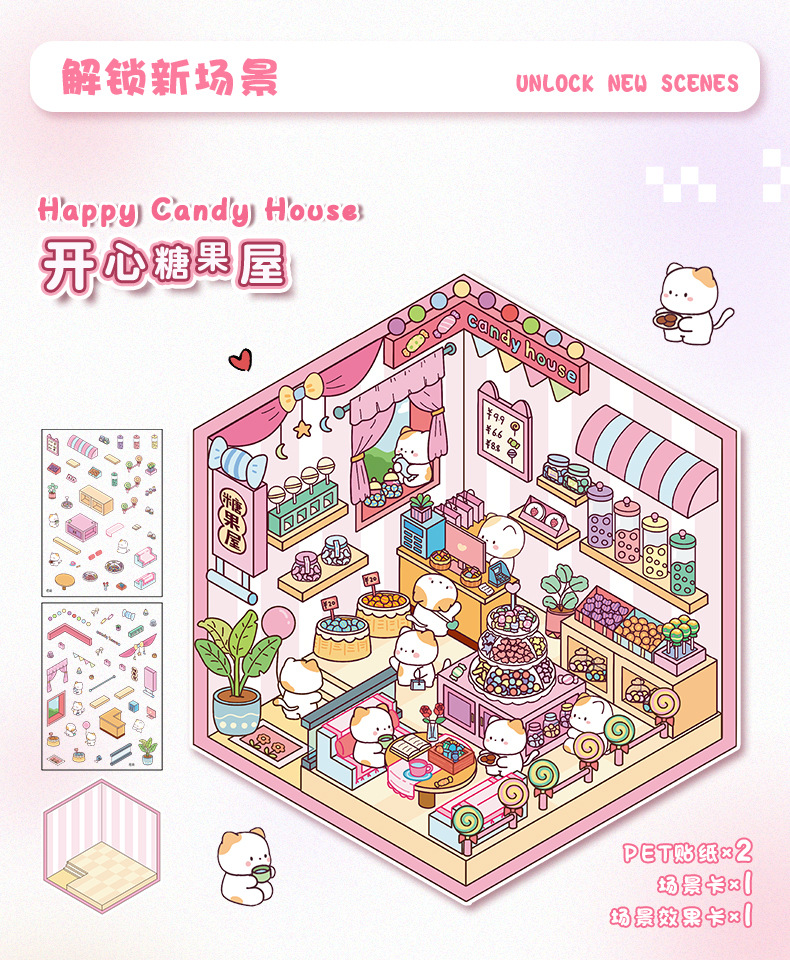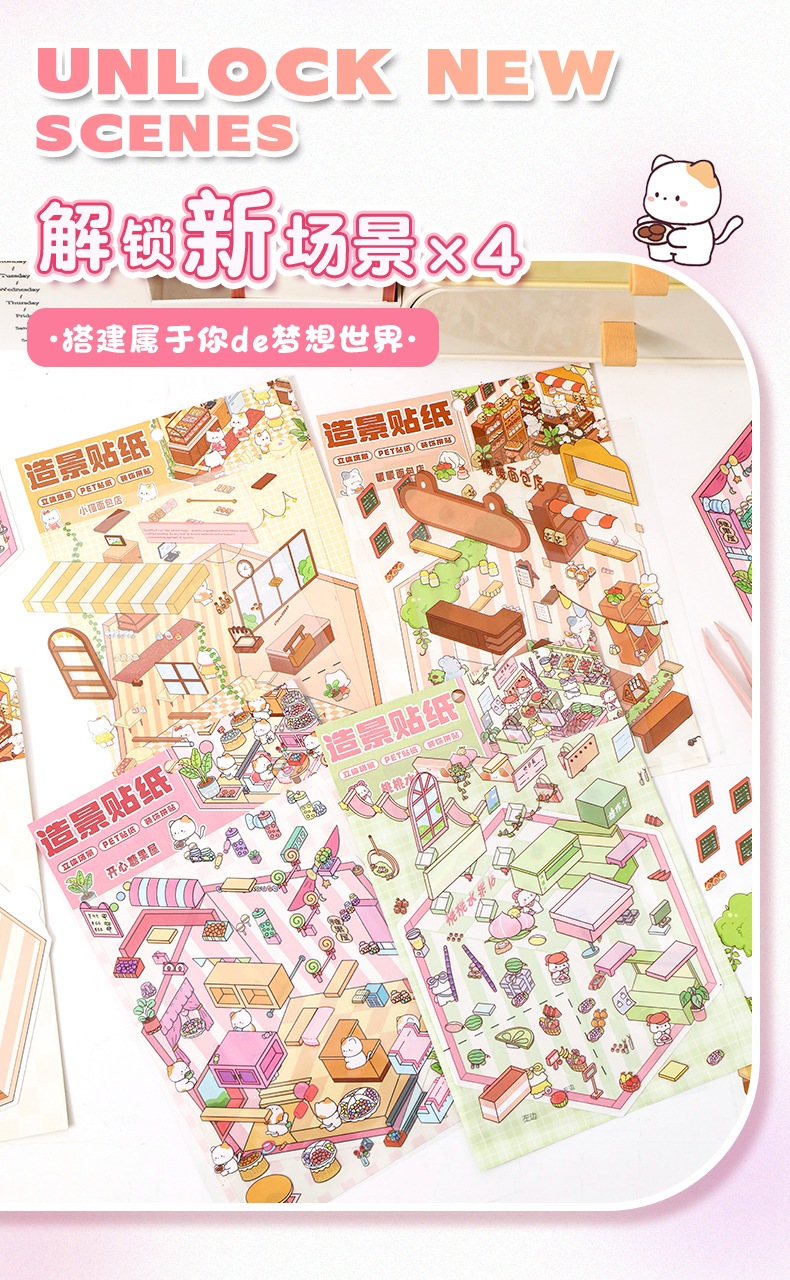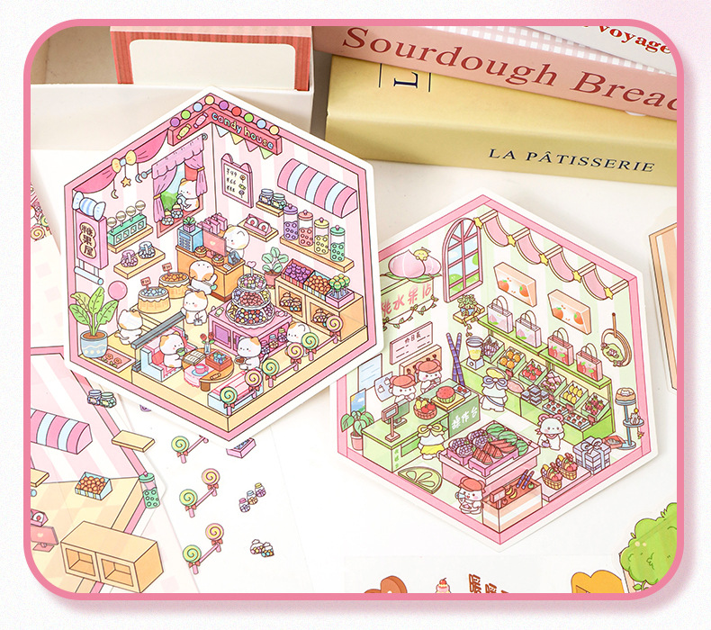 스몰 사이즈 만화 조경 스티커 귀여운 3D 입체 오두막 미니어처 장면 콜라주 감압 조경 손 계정 스티커스토어 가기