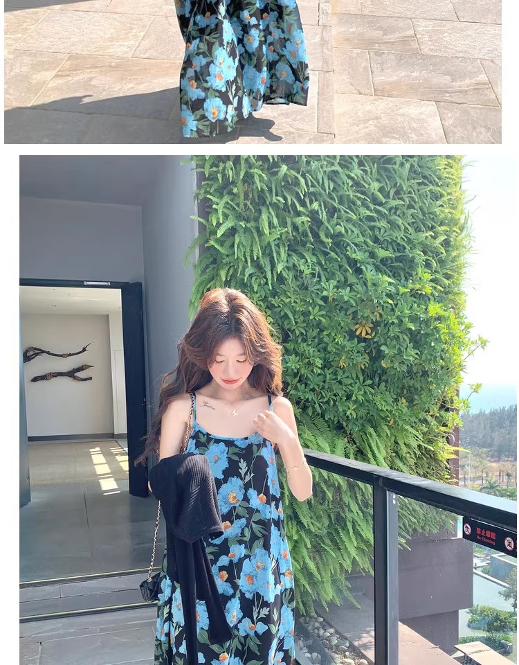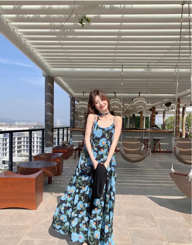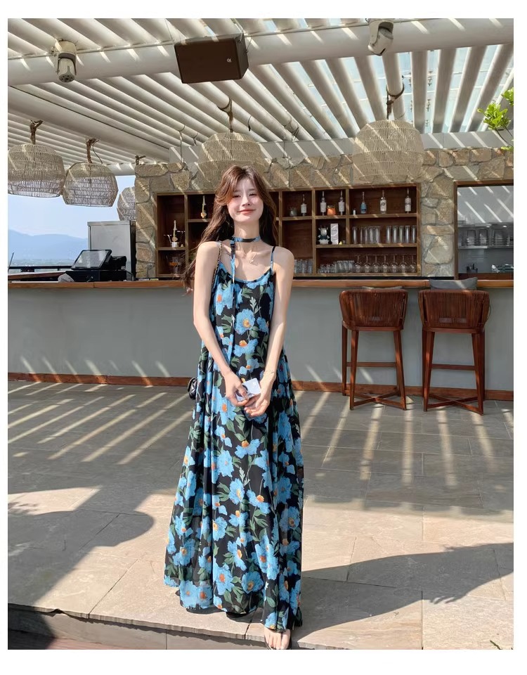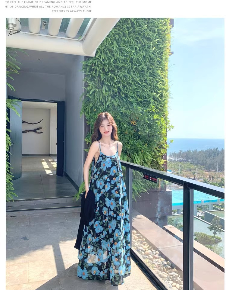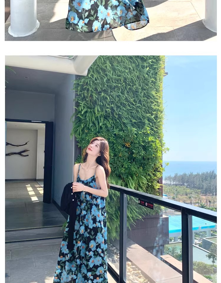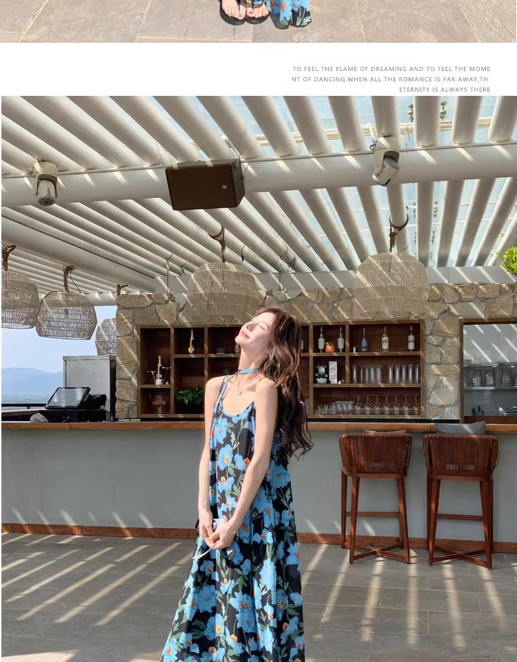 여름 푸른 꽃 원피스 스트랩 긴 원피스 해변 휴일 해변 원피스 슈퍼 요정 삼아 태국 여행 사진스토어 가기