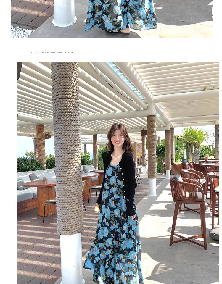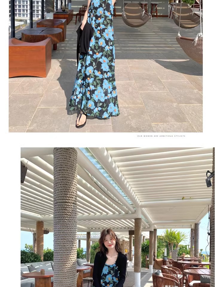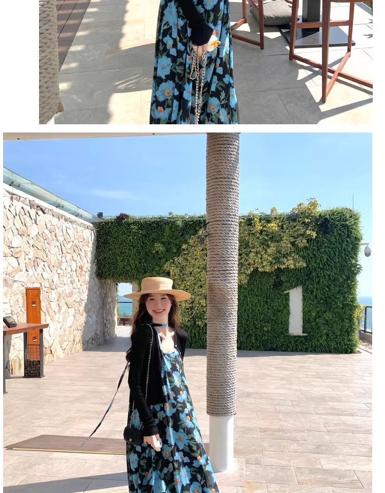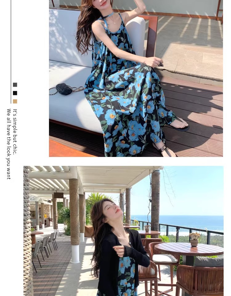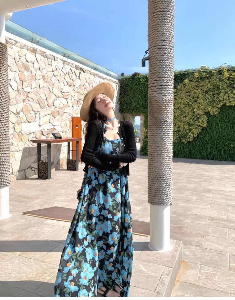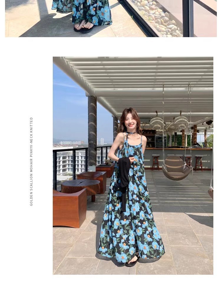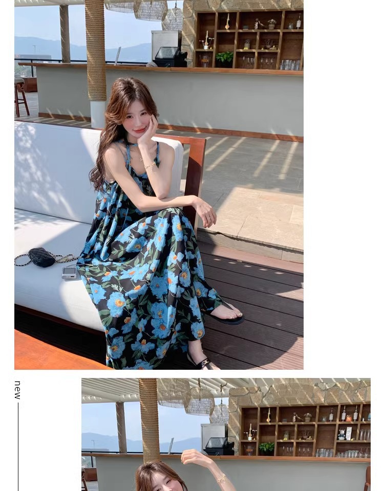 여름 푸른 꽃 원피스 스트랩 긴 원피스 해변 휴일 해변 원피스 슈퍼 요정 삼아 태국 여행 사진스토어 가기