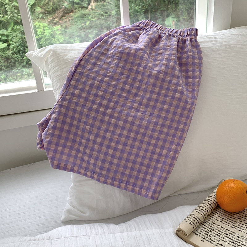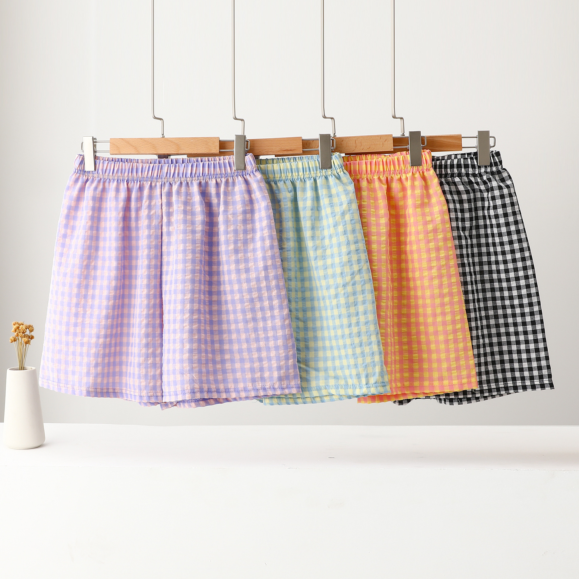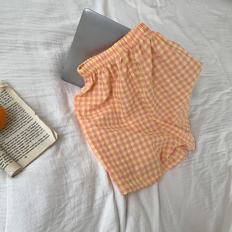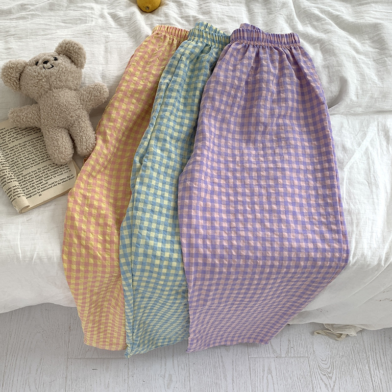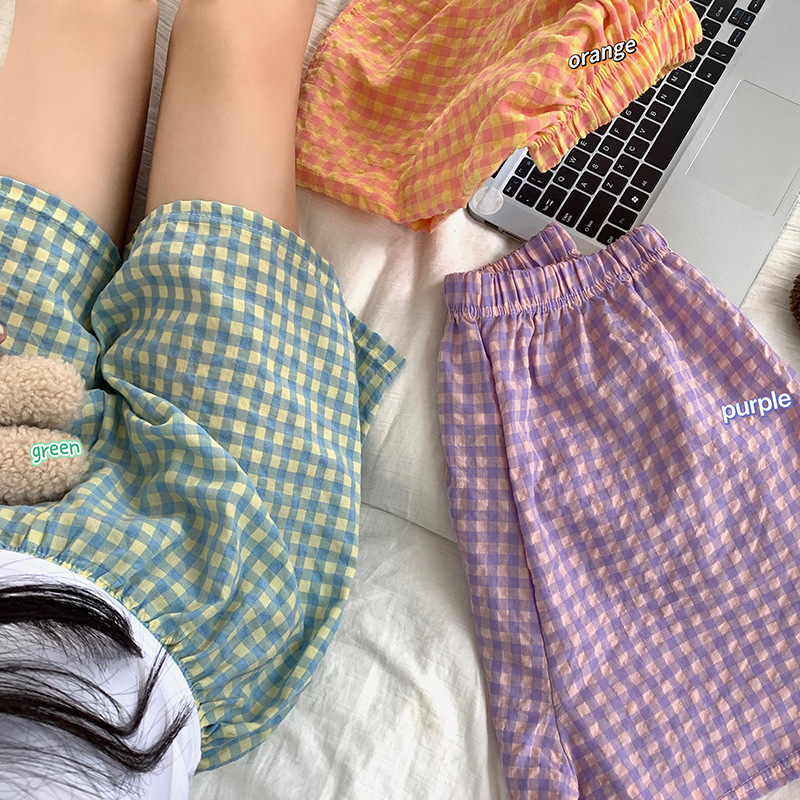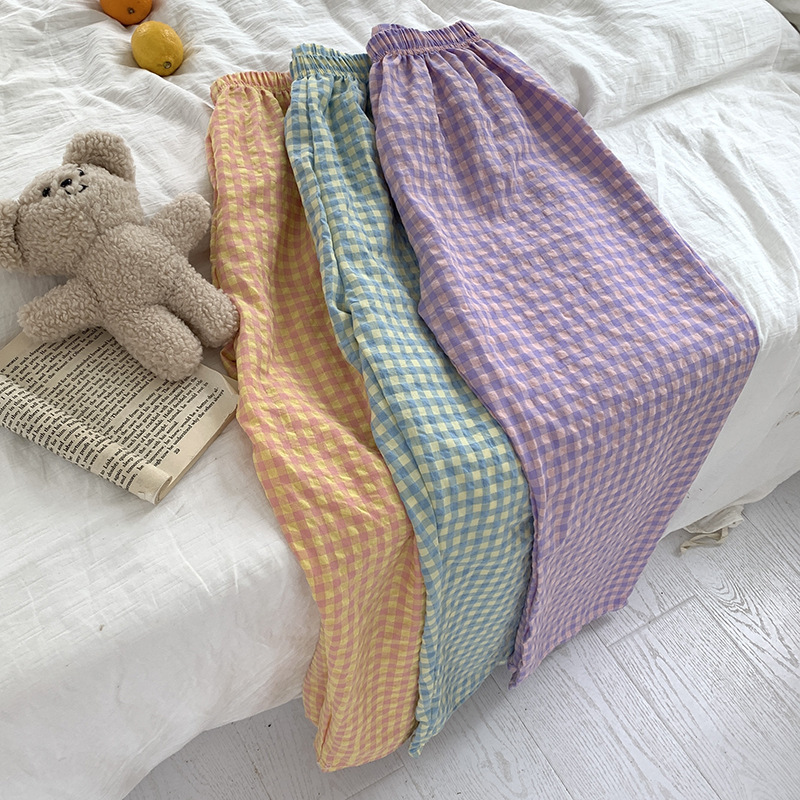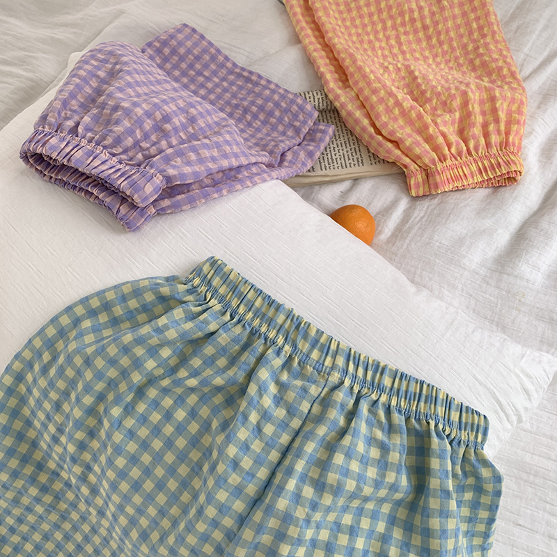 여성을위한 새로운 격자 무늬 반바지 여름 얇은 캔디 컬러 한국 스타일 바지 코튼 루즈 캐주얼 스트레이트 레그 워킹 파자마 바지