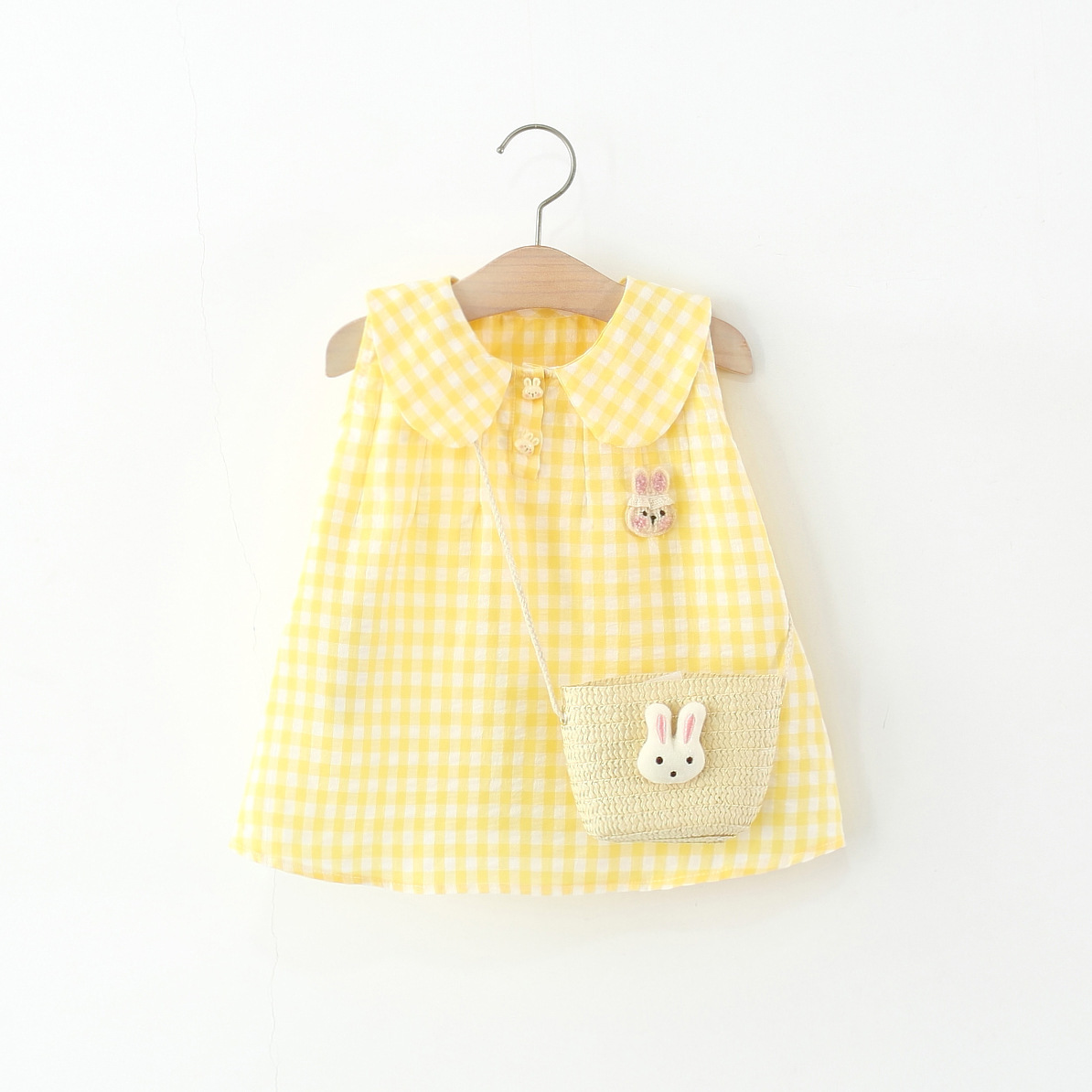 여름 새로운 아동복 도매 토끼 귀 인형 칼라 소녀 체크 무늬 민소매 원피스 같은 가방을 보내스토어 가기