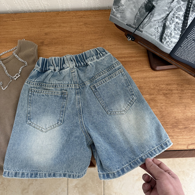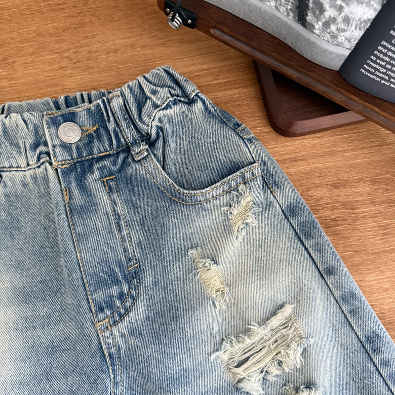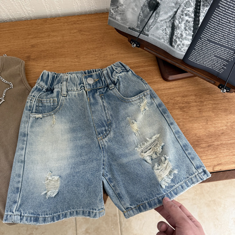 남자들의 찢어진 데님 반바지 2025 여름 새 어린이 더피 핸즈섬 트렌디 한 데님 반바지 느슨한 얇은 바지스토어 가기