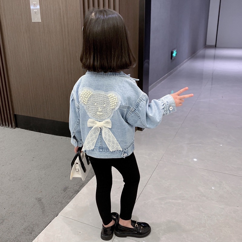 2025 봄, 가을 새로운 스타일 백 베어 헤드 데님 재킷 한국 스타일 짧은 소녀 재킷 드롭 배송 서양식 아동 의류스토어 가기