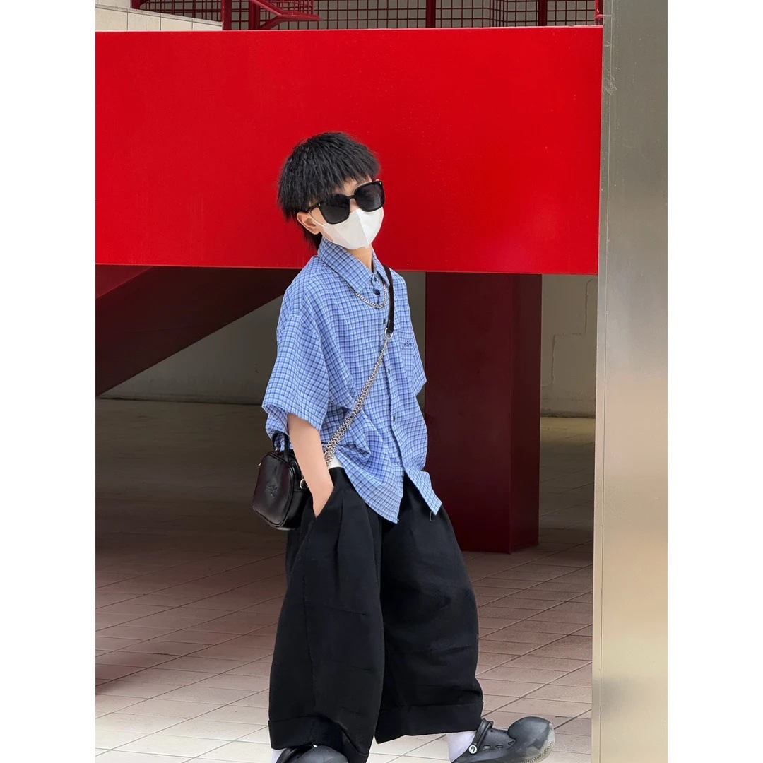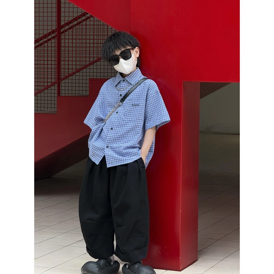 남아 여름 신상 2026 중대형 아동 트렌디 라펠 셔츠 반팔 싱글 버튼 체크 셔츠 상의
