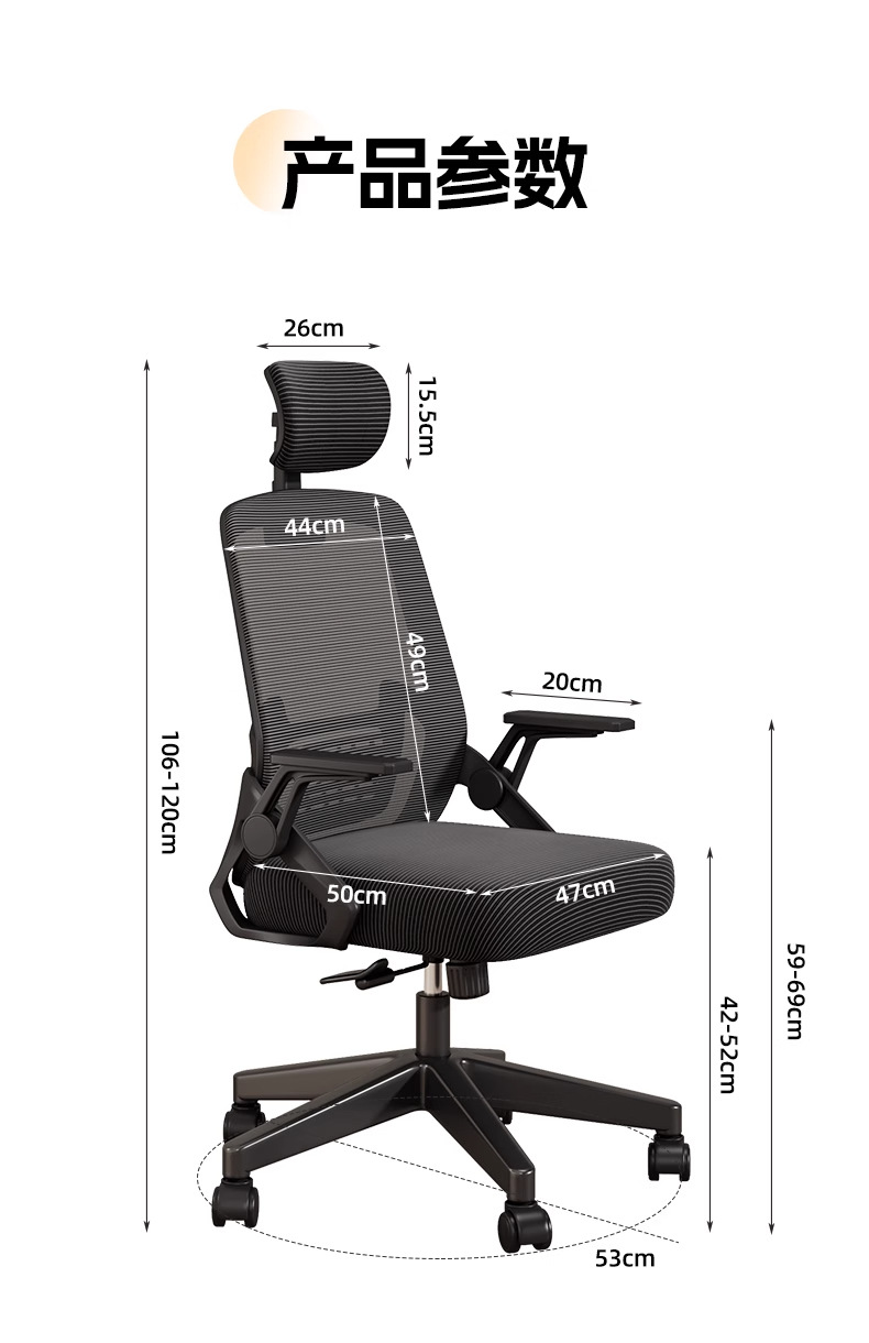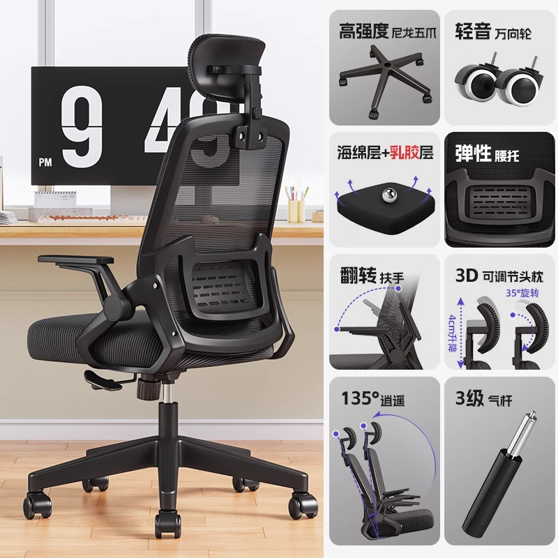 • 블랙 프레임과 블랙 메쉬 - 머리 받침 포함 - 넓은 요추 지지대 + 자유로운 기능 丨 8CM 두꺼운 스폰지 패드