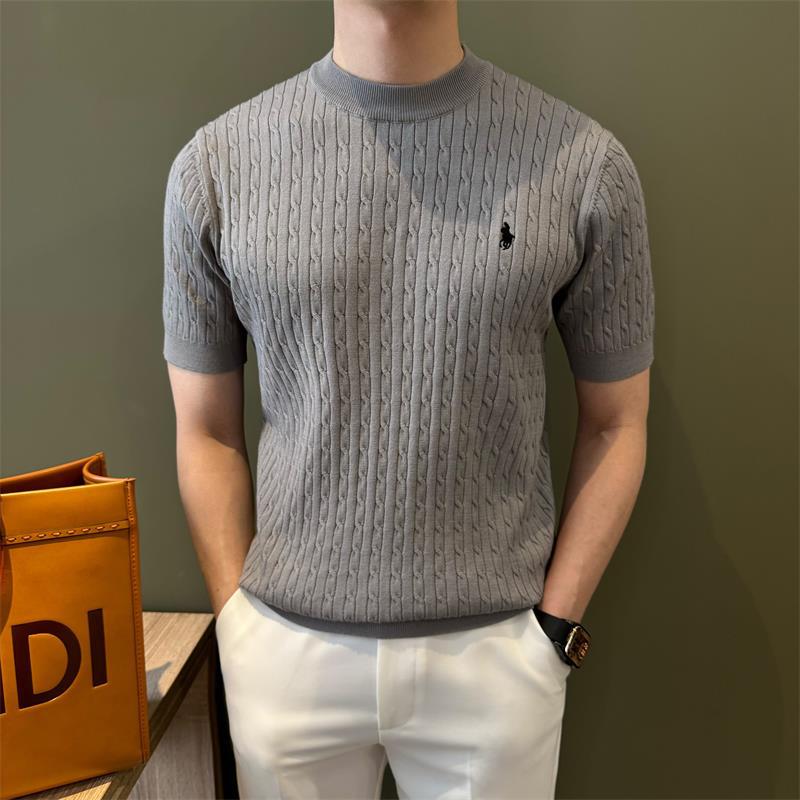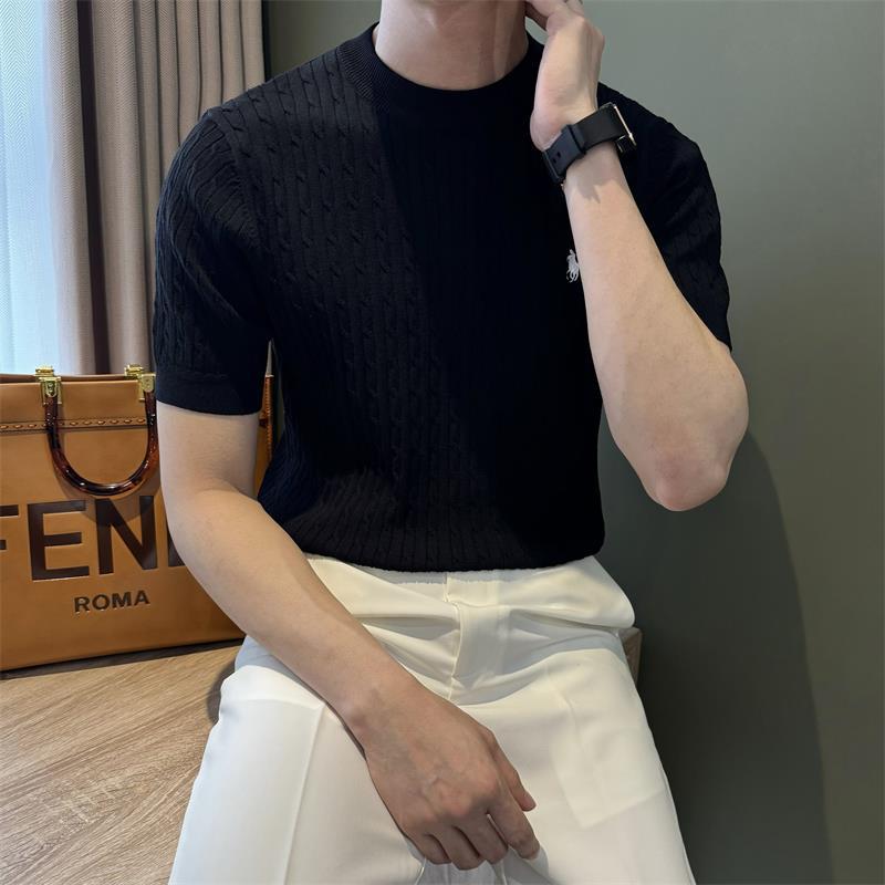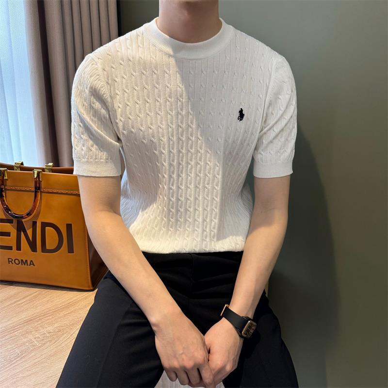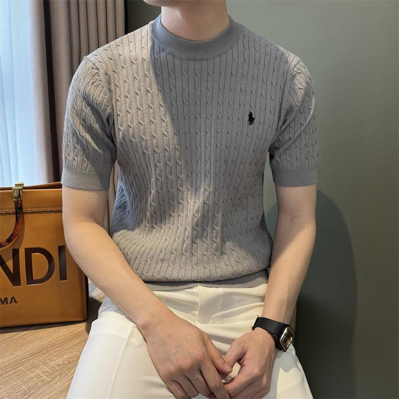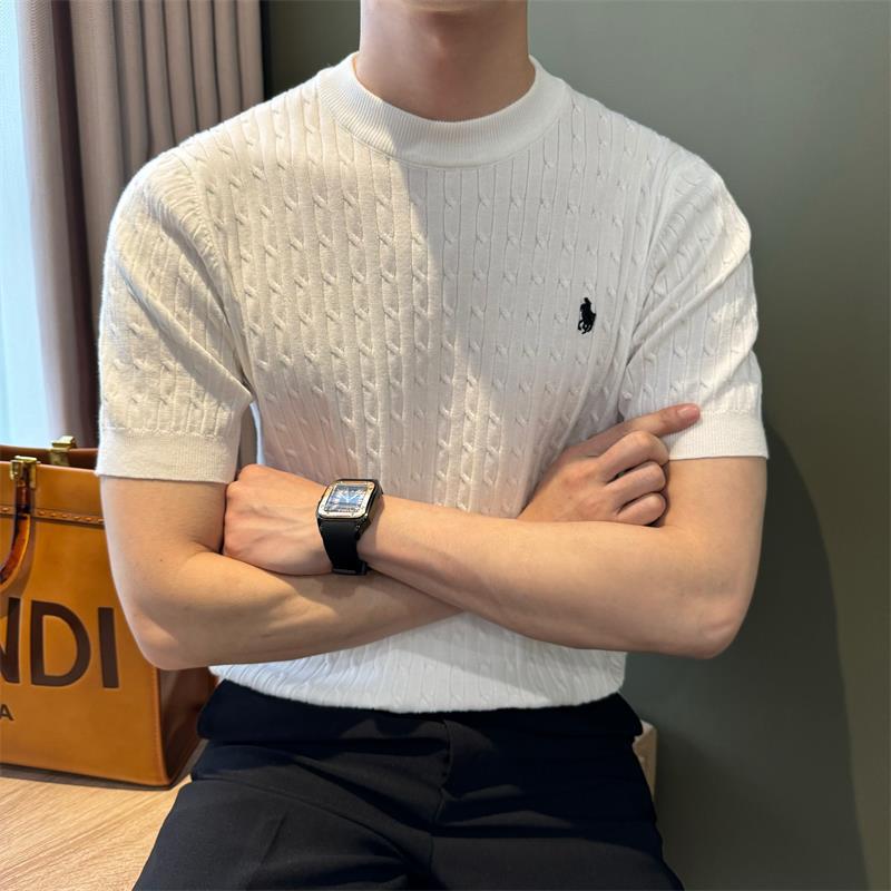 여름 캐주얼 탄성 니트 반팔 티셔츠 남성용 크루 넥 스킨 친화적 인 라이트 럭셔리 통기성 트위스트 텍스처 포니 자수 탑스토어 가기