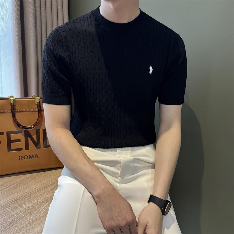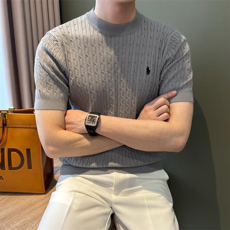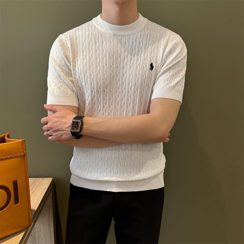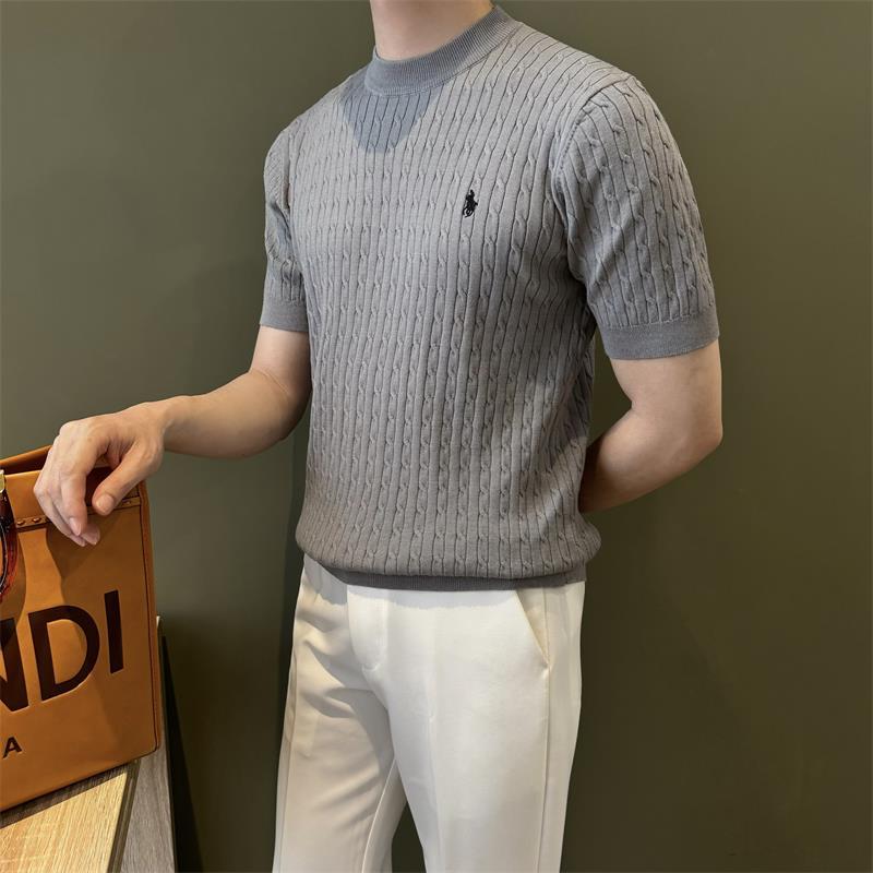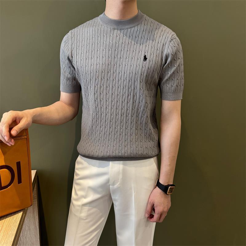 여름 캐주얼 탄성 니트 반팔 티셔츠 남성용 크루 넥 스킨 친화적 인 라이트 럭셔리 통기성 트위스트 텍스처 포니 자수 탑스토어 가기