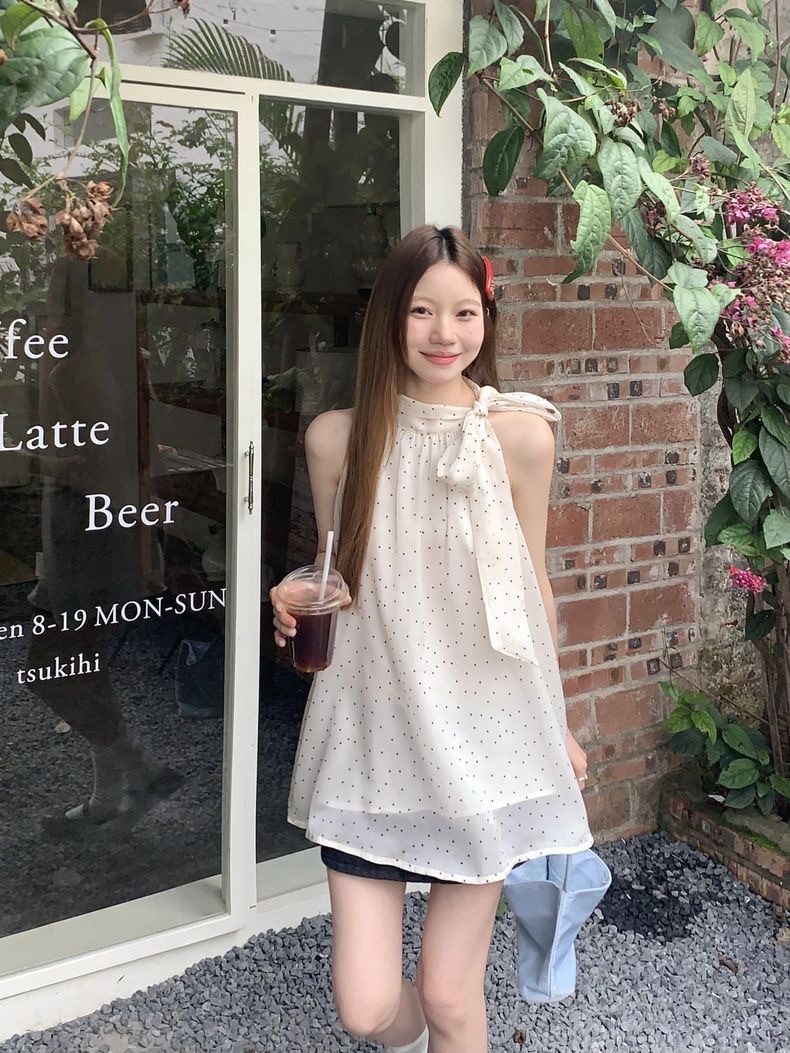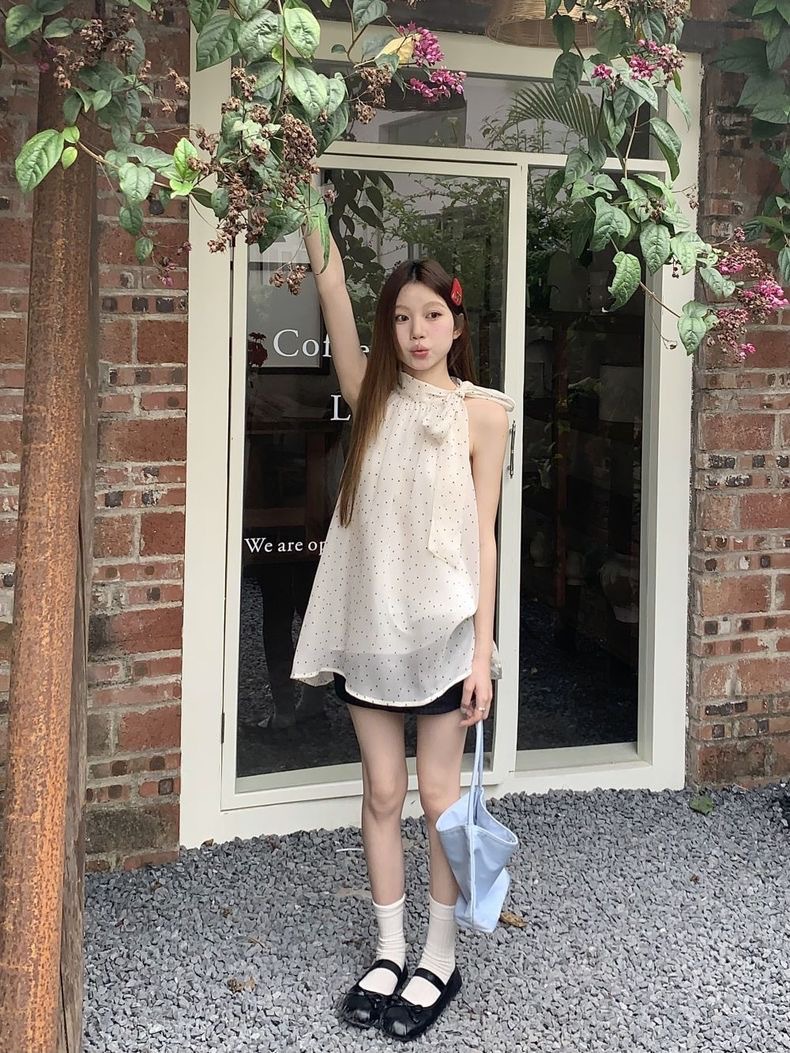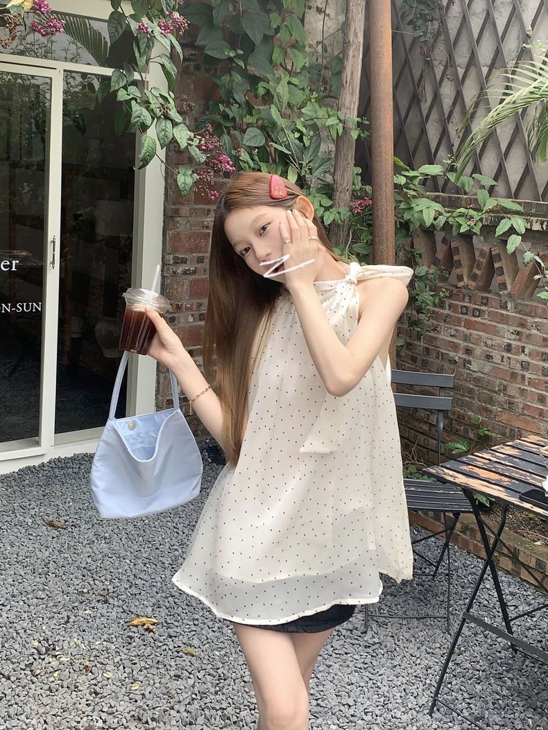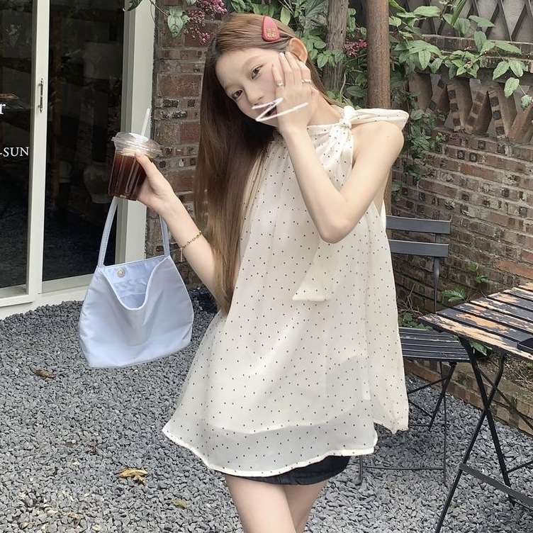 프랑스 스타일의 우아한 디자인 센스 보우 넥 셔츠 여성의 봄과 여름 느슨한 세련된 웨이브 도트 셔츠스토어 가기