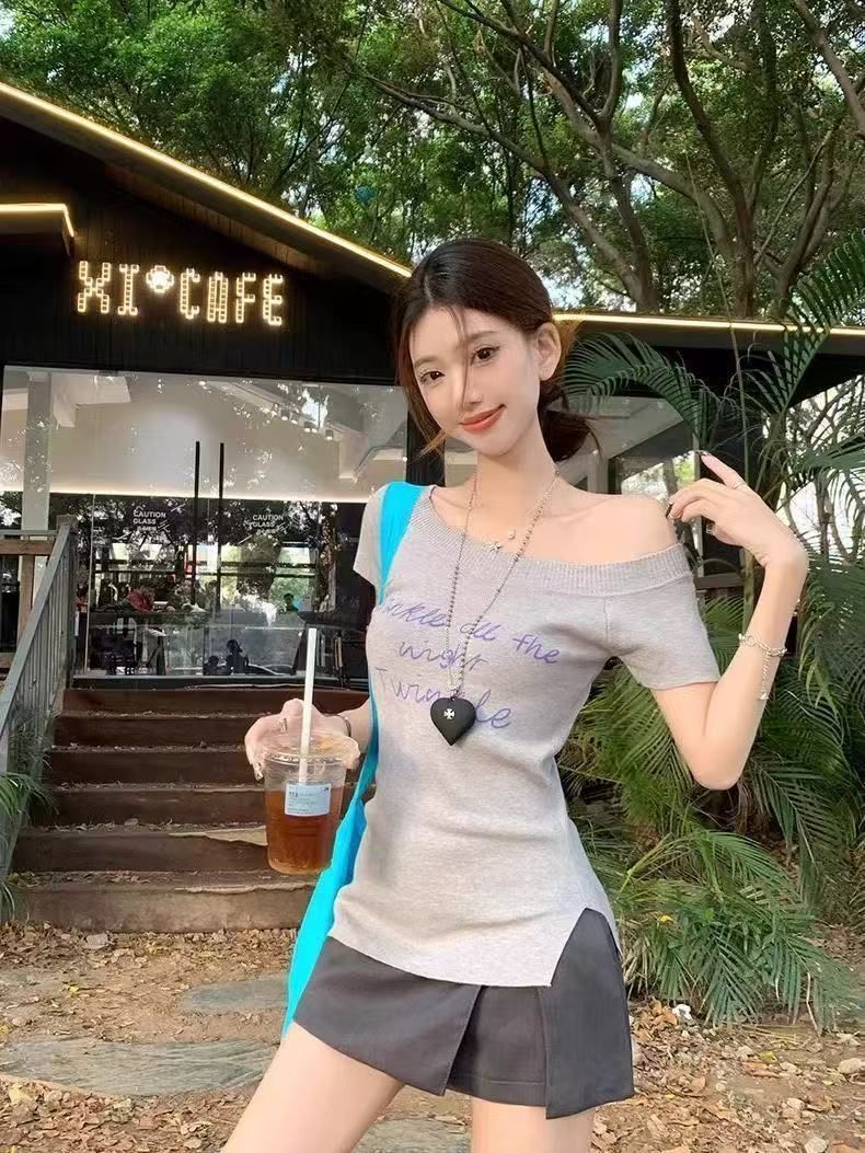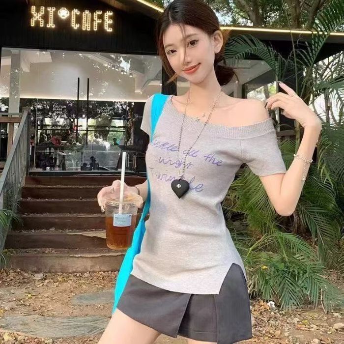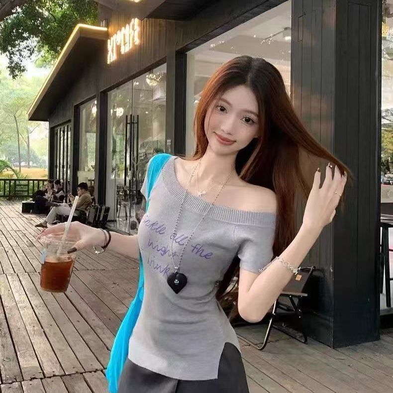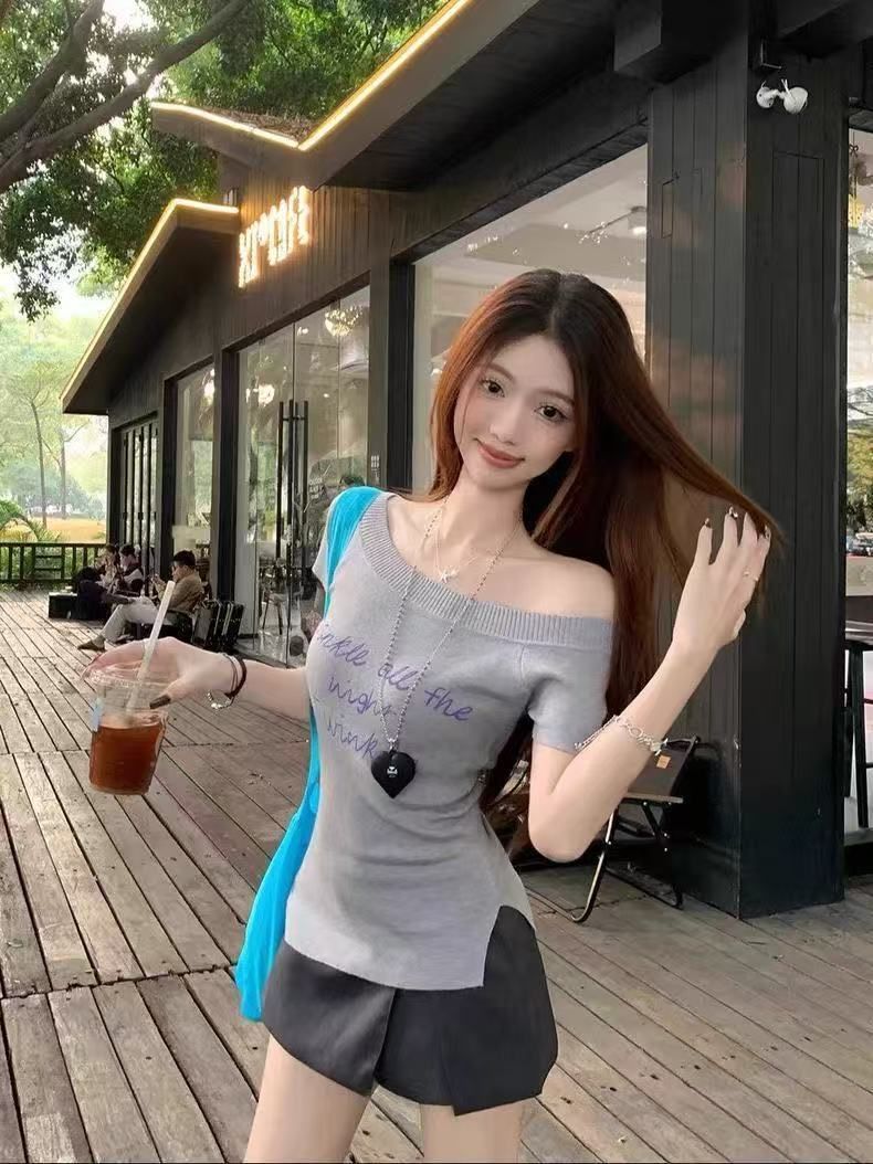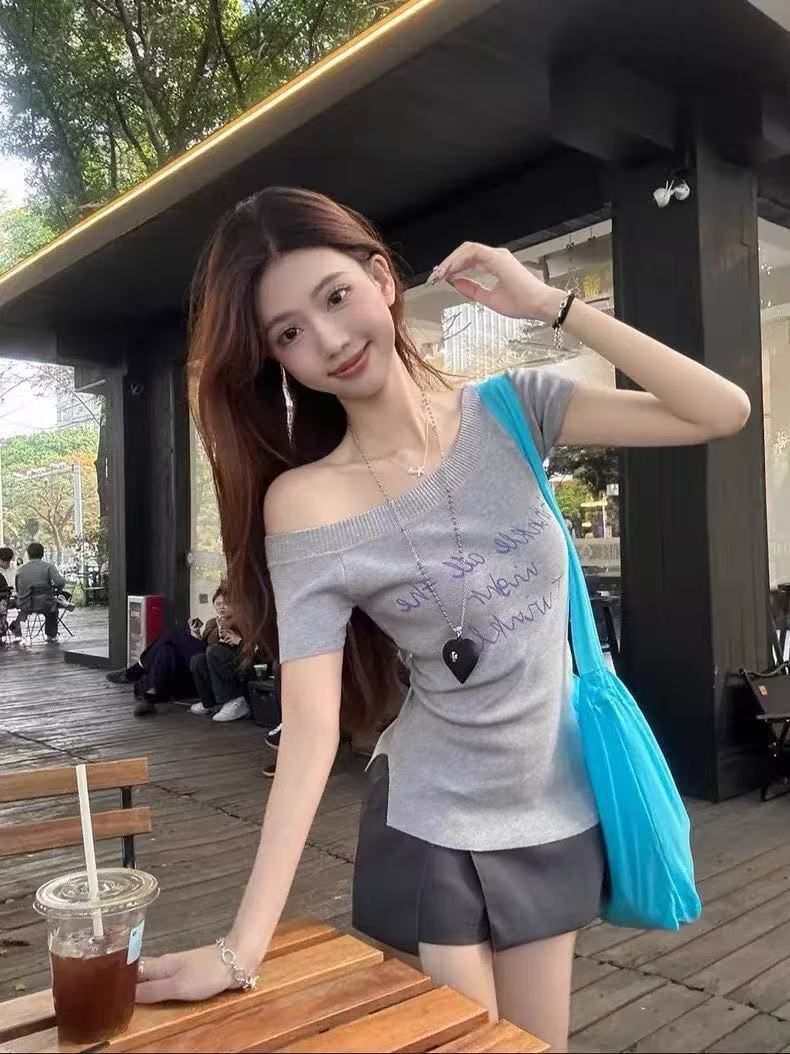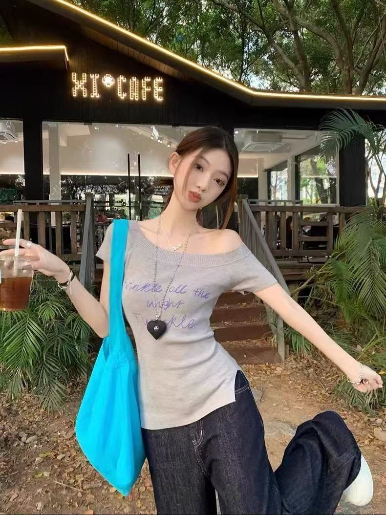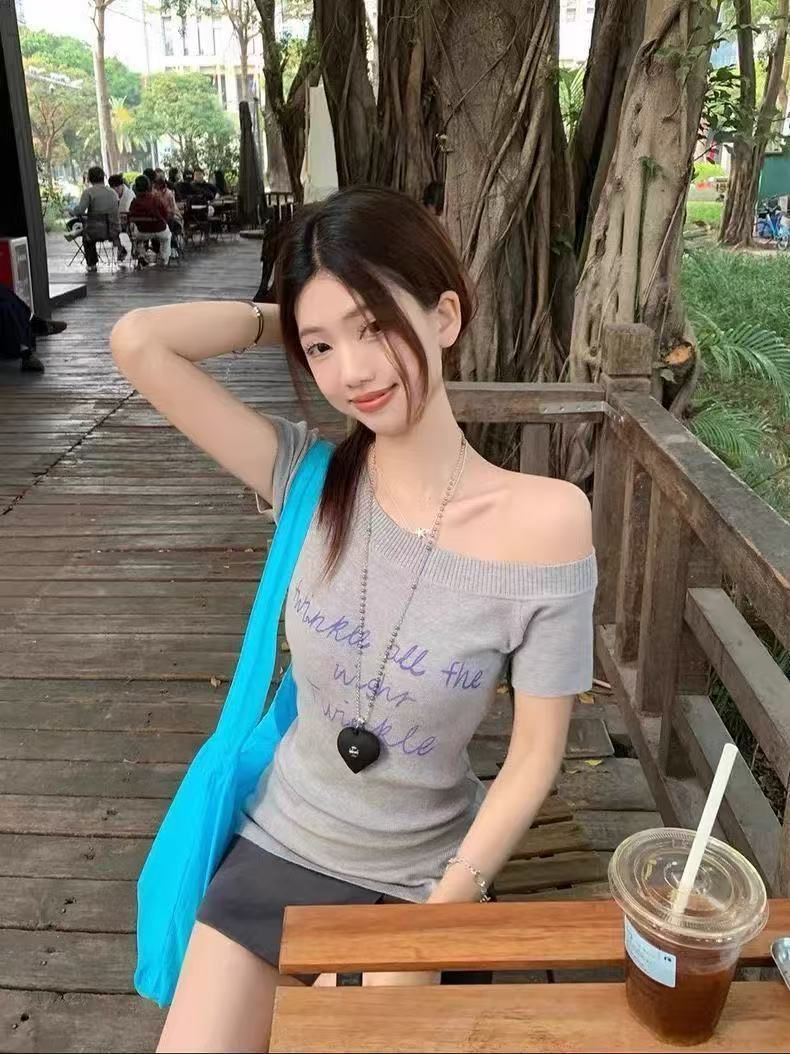 여성 여름 우아한 우아한 슬림 핏 어깨 니트 반팔 니트스토어 가기