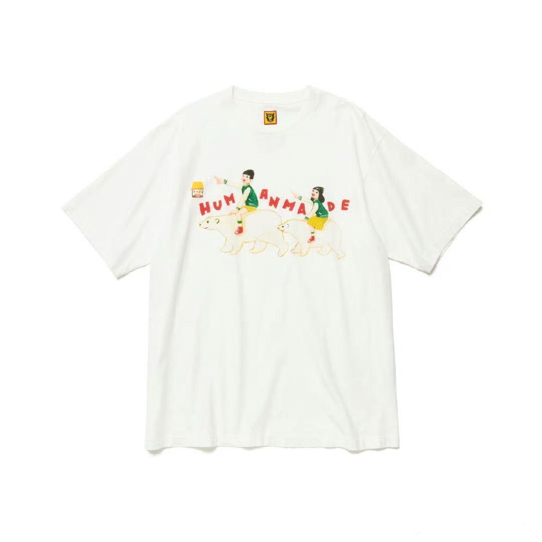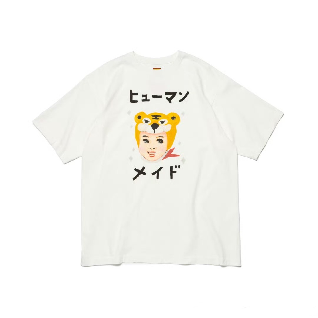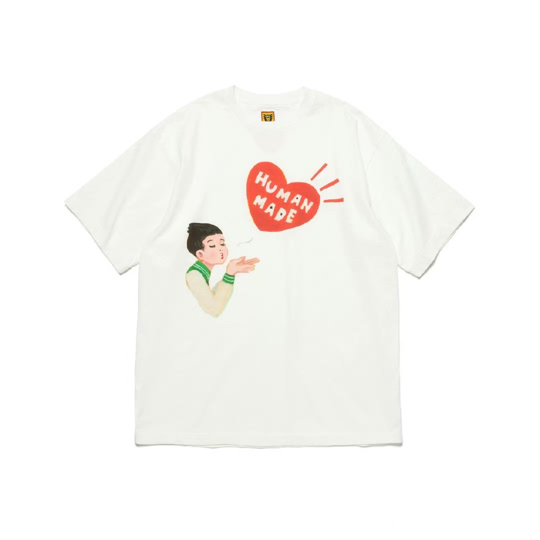 Spot HUMAN 일본 트렌디 브랜드 헤비급 대나무면 반팔 티셔츠 일러스트 프린트 커플 반팔 티셔츠 여성용스토어 가기