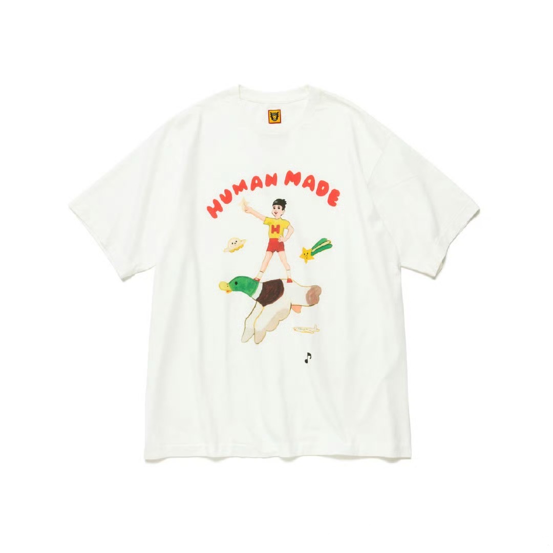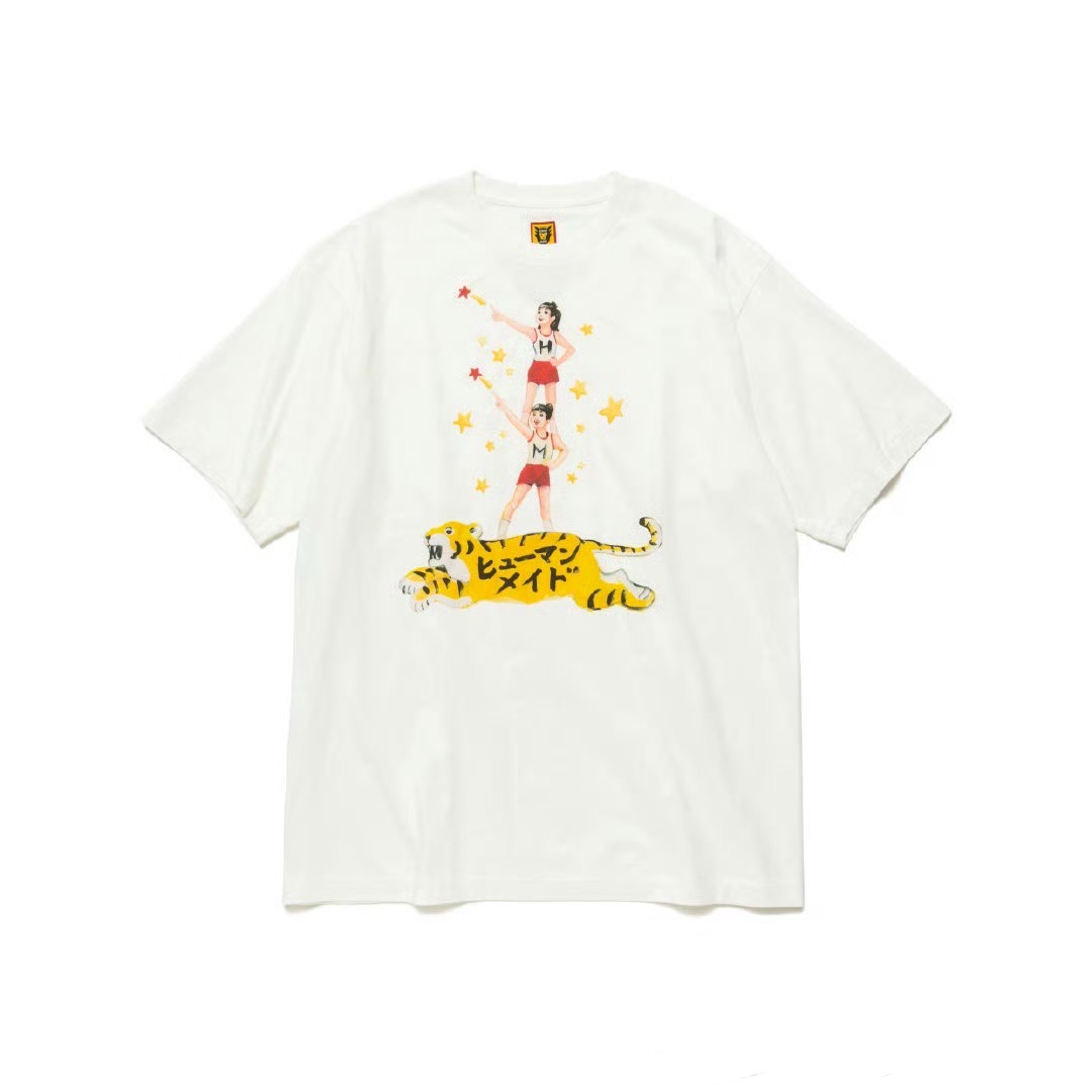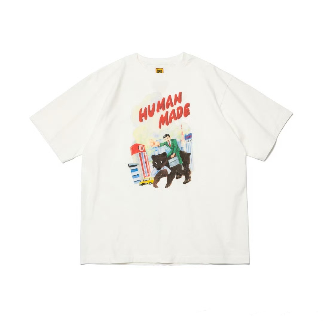 Spot HUMAN 일본 트렌디 브랜드 헤비급 대나무면 반팔 티셔츠 일러스트 프린트 커플 반팔 티셔츠 여성용스토어 가기