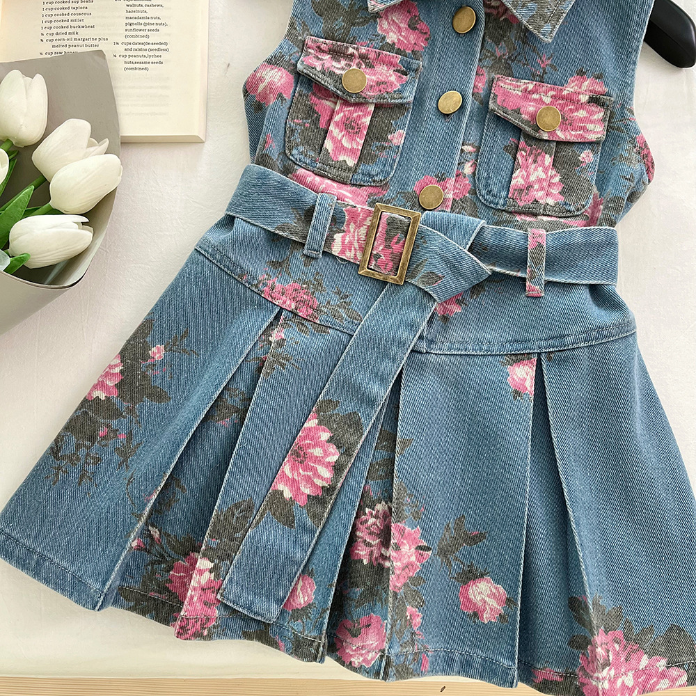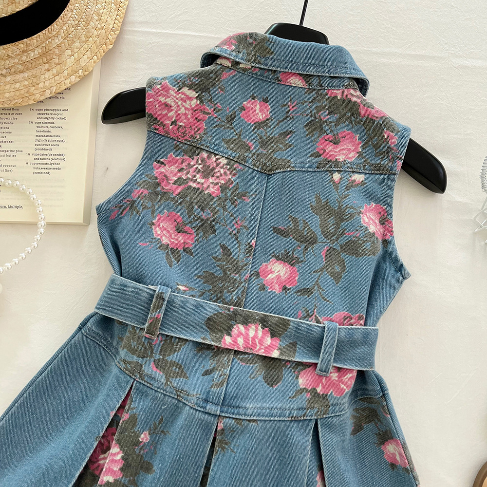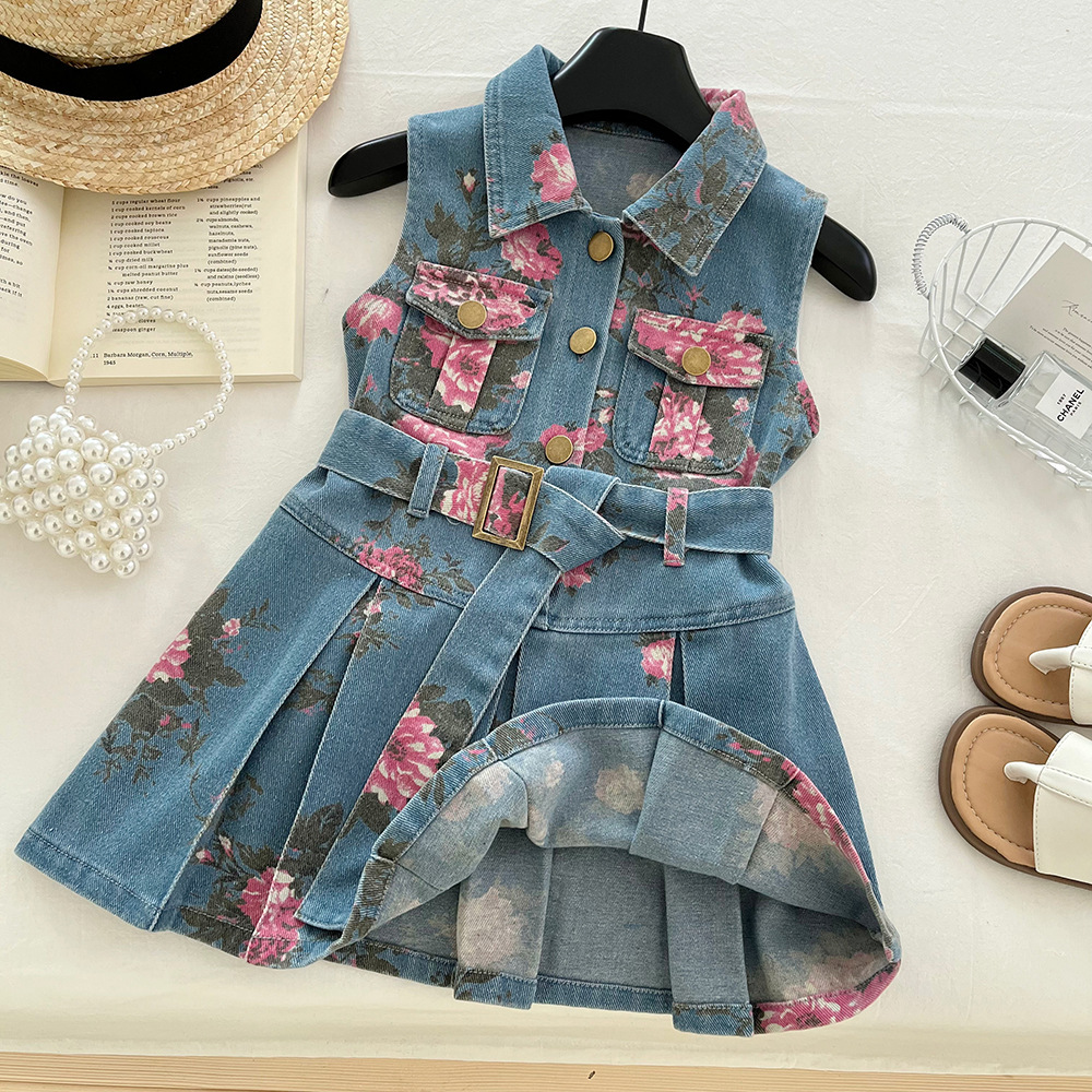 어린이 데님 원피스 새 여름 아기 소녀 인쇄 데님 민소매 꽃 상쾌한 공주 어린이 치마